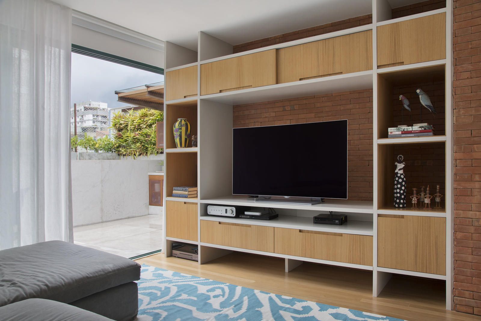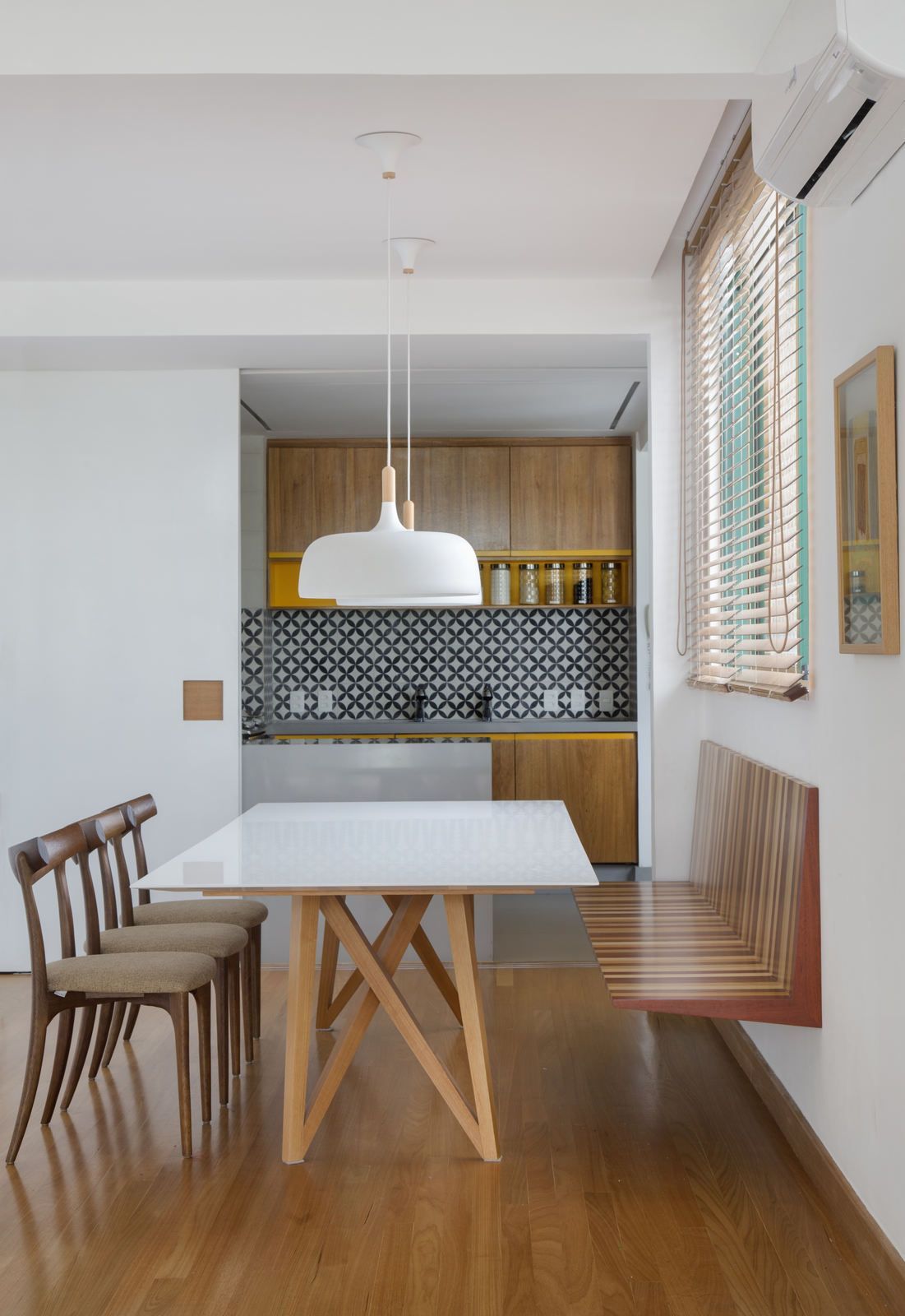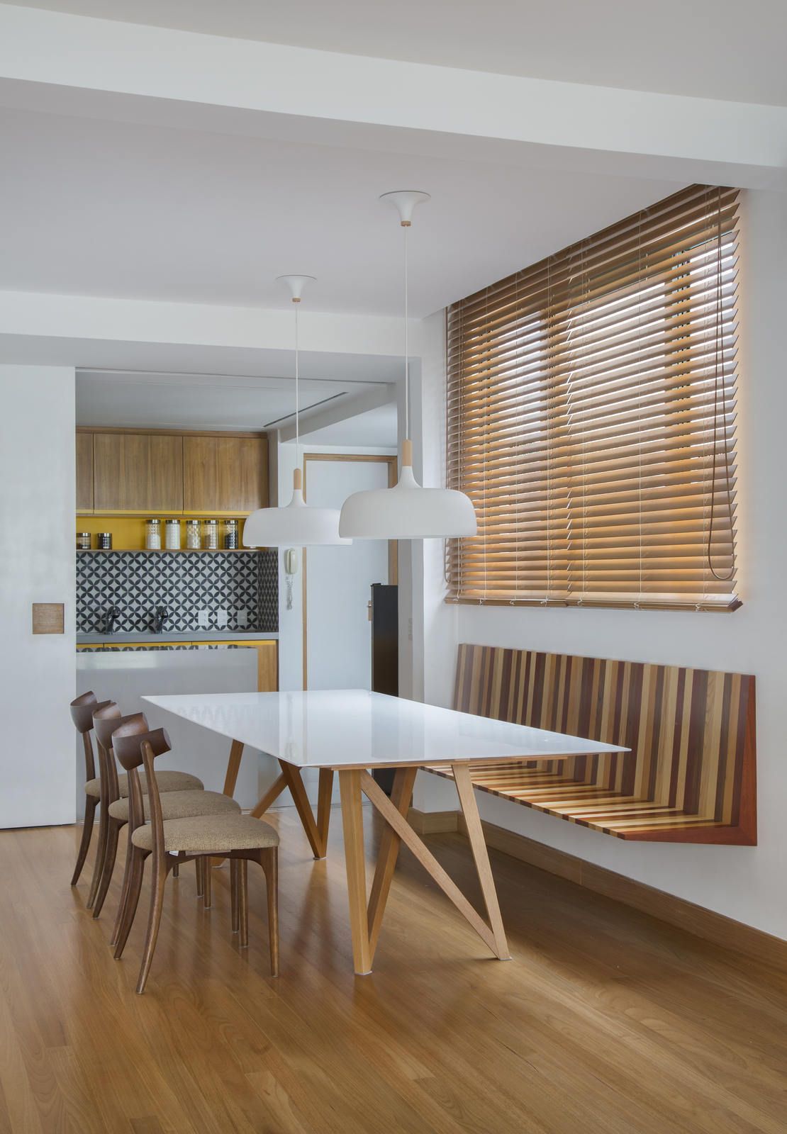 “Apenas o aparador e as cadeiras de jantar foram aproveitados do endereço anterior dos clientes. Na área social, que tem décor leve e minimalista, em tons suaves, o mix de madeira no piso, tijolinho terracota em algumas paredes e esquadrias das portas para a varanda em verde trouxeram acolhimento para o apartamento, que tem paredes ora brancas ora com acabamento em cimento queimado bem claro. Já na cozinha integrada ao jantar, o destaque fica por conta do banco suspenso na parede em marchetaria listrada com cinco tons de madeira, que permite manter uma boa circulação entre os ambientes.”
