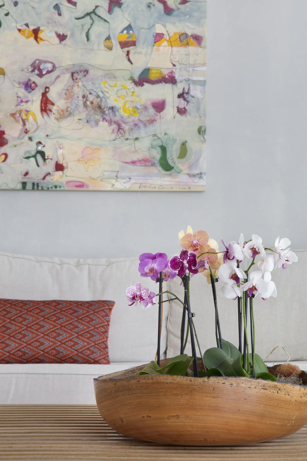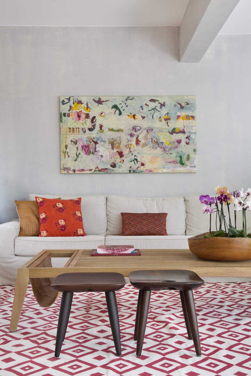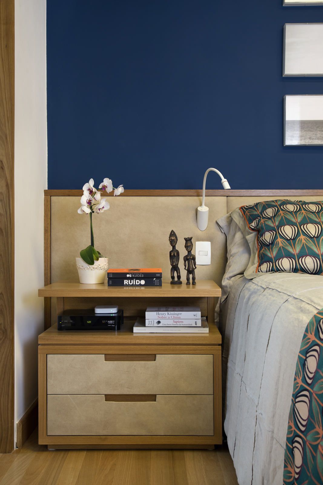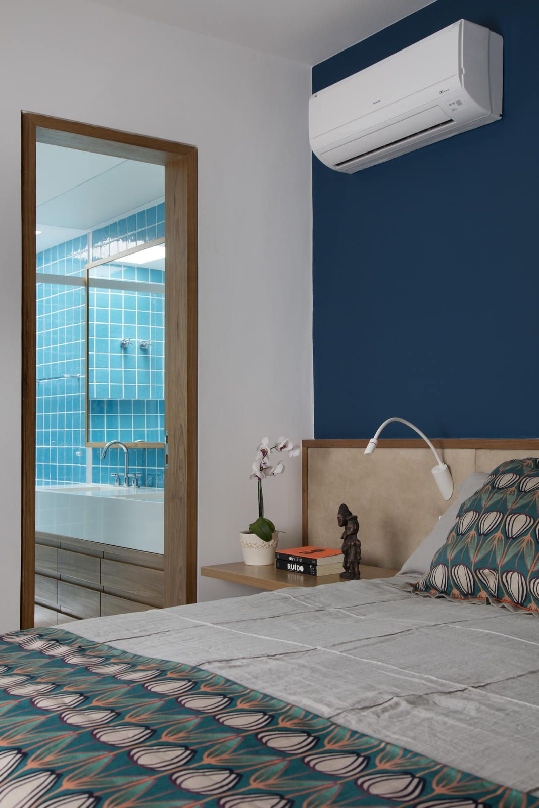 “Apenas o aparador e as cadeiras de jantar foram aproveitados do endereço anterior dos clientes. Na área social, que tem décor leve e minimalista, em tons suaves, o mix de madeira no piso, tijolinho terracota em algumas paredes e esquadrias das portas para a varanda em verde trouxeram acolhimento para o apartamento, que tem paredes ora brancas ora com acabamento em cimento queimado bem claro. Já na cozinha integrada ao jantar, o destaque fica por conta do banco suspenso na parede em marchetaria listrada com cinco tons de madeira, que permite manter uma boa circulação entre os ambientes.”