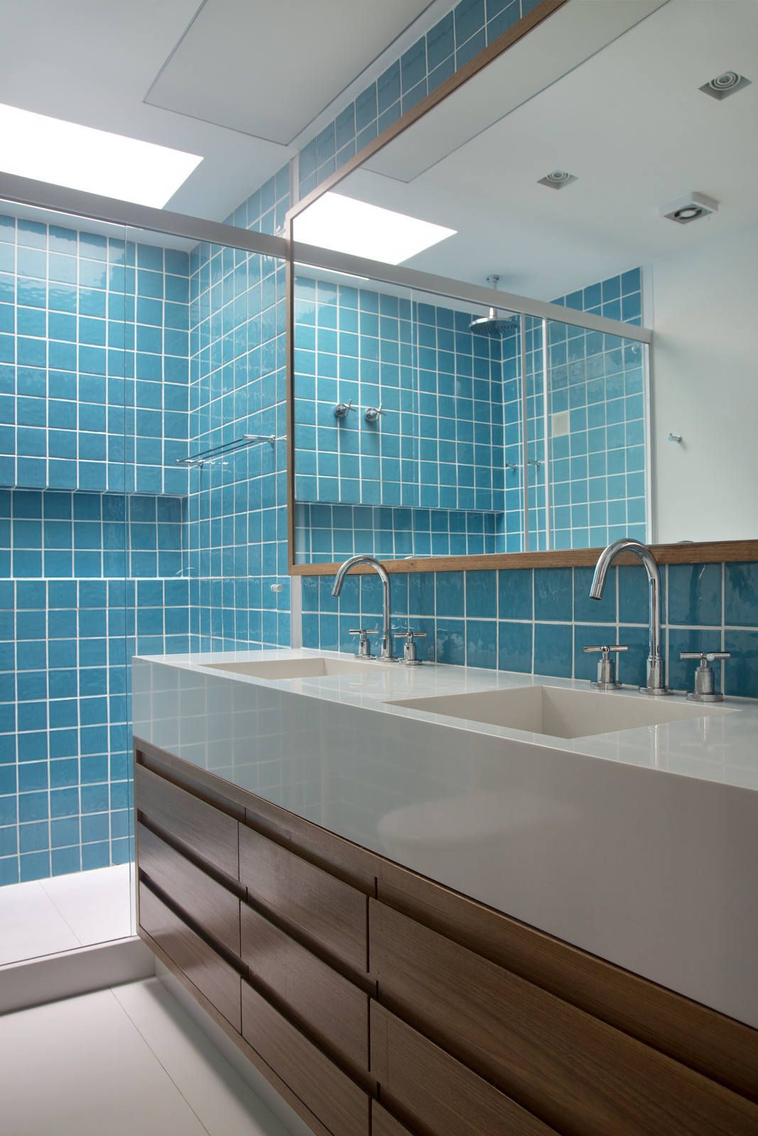 “Além de construir do zero a piscina e a sauna, aumentamos a varanda, eliminamos a parede entre a sala de tv e o home office, criamos uma janela com vista para as montanhas na sala de jantar e reposicionamos o quarto e o banho de serviço nos fundos do imóvel para ampliar a sala e a cozinha. Também tivemos que fazer um reforço estrutural que nos permitiu eliminar um pilar que ficaria no meio da cozinha e outro no quarto da filha.”