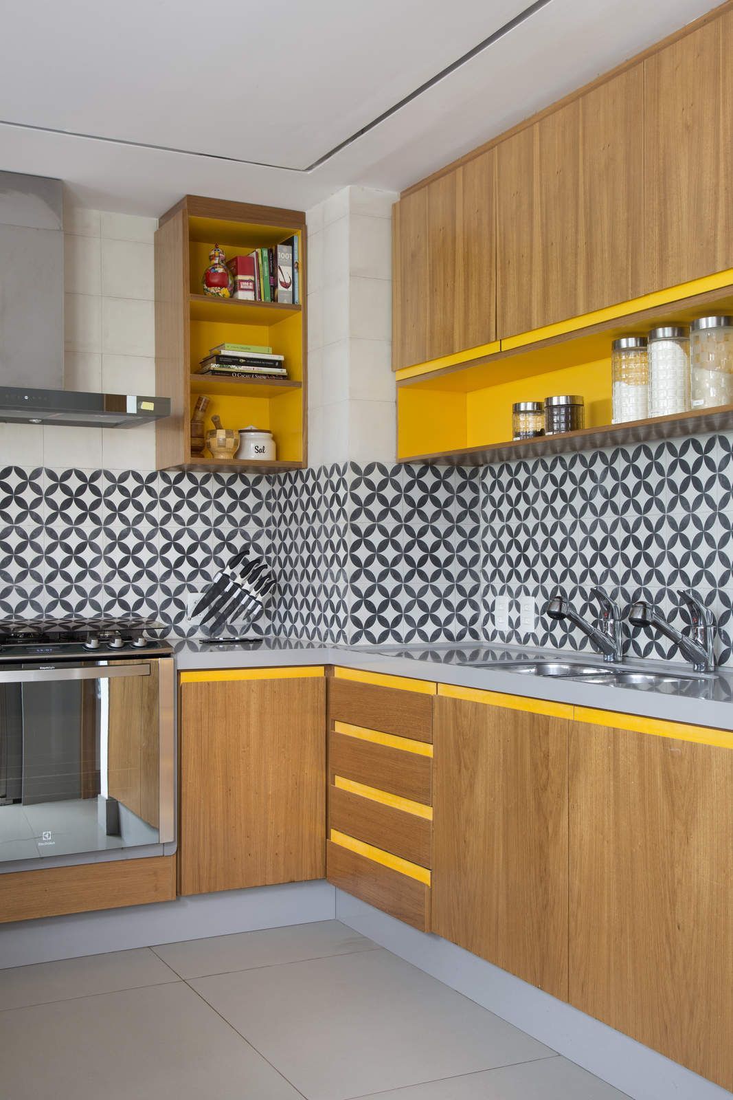 “Fizemos isso através da integração dos espaços, com a possibilidade de ter privacidade quando necessário, graças aos painéis deslizantes que separam a sala de tv do escritório e a cozinha da sala de jantar. Essa integração proporcionou também uma ventilação cruzada nos ambientes, que passaram a receber mais luz natural.”