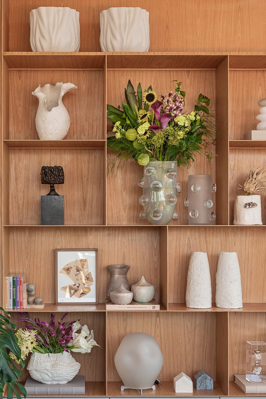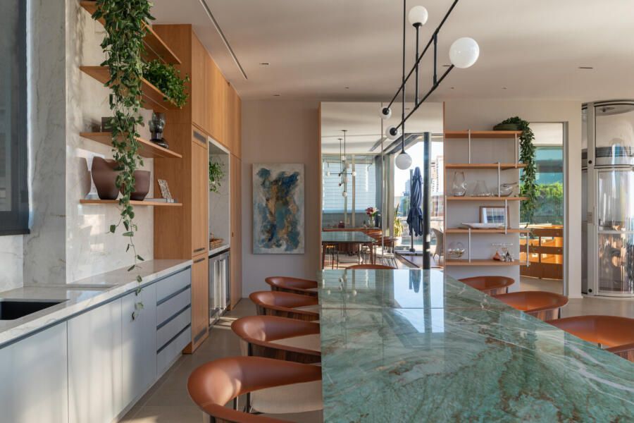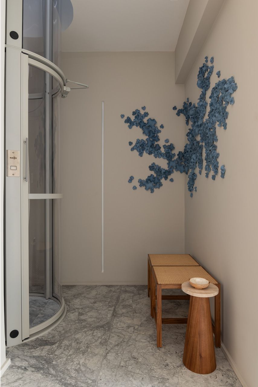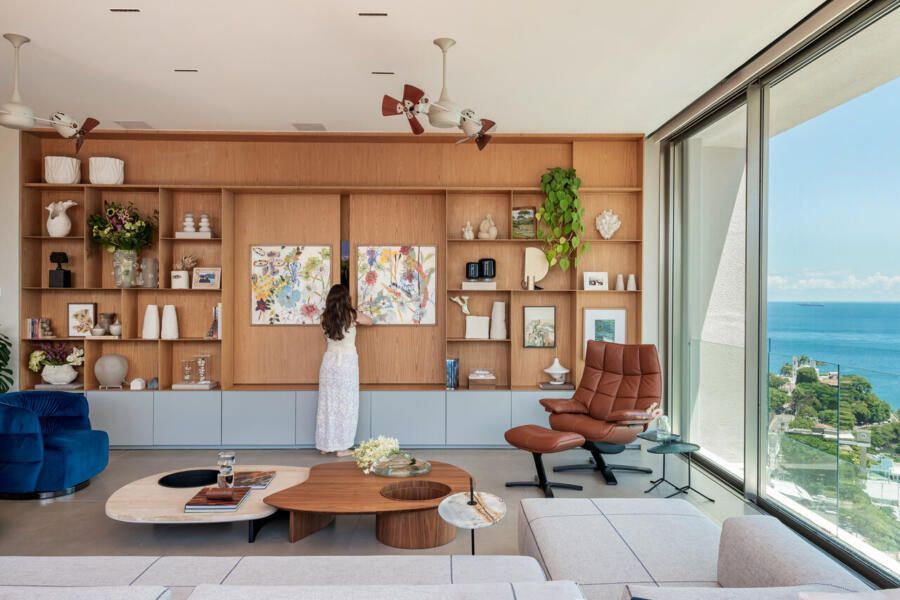 Entre esculturas de árvores de José Bento, telas de Fátima Tosca, Teresa Messeder, Mirela Cabral e outros artistas brasileiros, o apartamento revela personalidade e peso artístico. O que mais impressiona, porém, é a potência da transformação: uma intervenção estrutural complexa que redefiniu níveis, fluxos e vistas para revelar o potencial de um imóvel antigo. Na área social — onde estar, jantar e terraço se fundem — o projeto atinge seu ápice, equilibrando escala generosa e acolhimento. Mesmo em um edifício, a sensação é a de viver em uma casa suspensa sobre o mar.