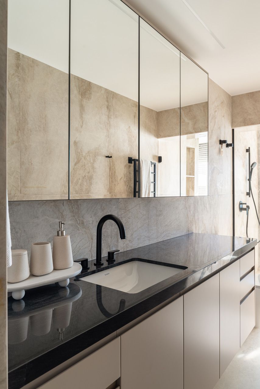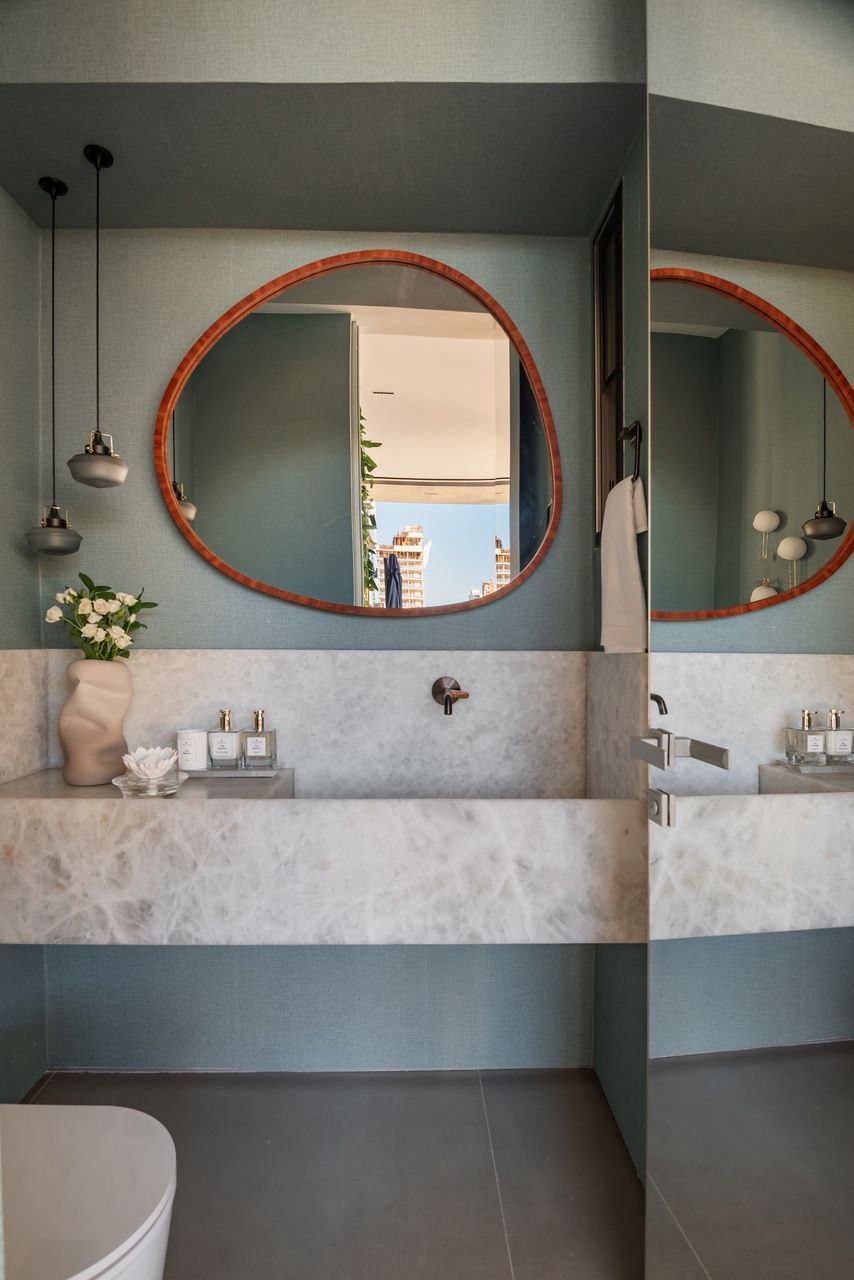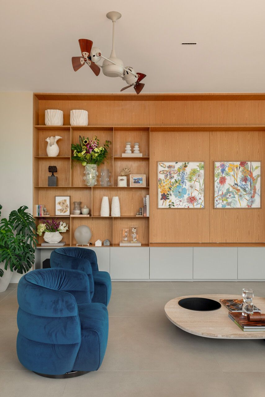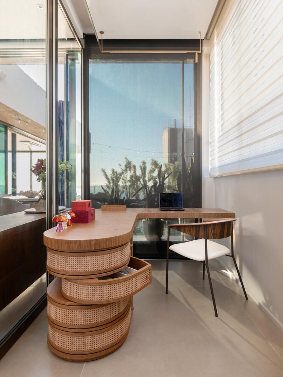 Entre esculturas de árvores de José Bento, telas de Fátima Tosca, Teresa Messeder, Mirela Cabral e outros artistas brasileiros, o apartamento revela personalidade e peso artístico. O que mais impressiona, porém, é a potência da transformação: uma intervenção estrutural complexa que redefiniu níveis, fluxos e vistas para revelar o potencial de um imóvel antigo. Na área social — onde estar, jantar e terraço se fundem — o projeto atinge seu ápice, equilibrando escala generosa e acolhimento. Mesmo em um edifício, a sensação é a de viver em uma casa suspensa sobre o mar.