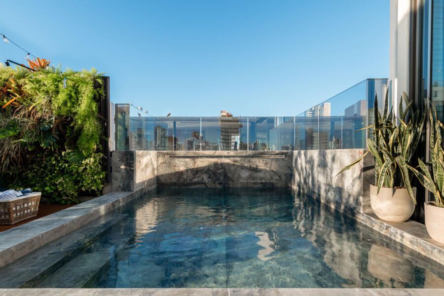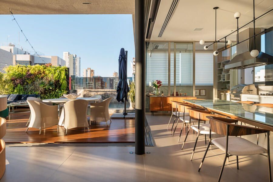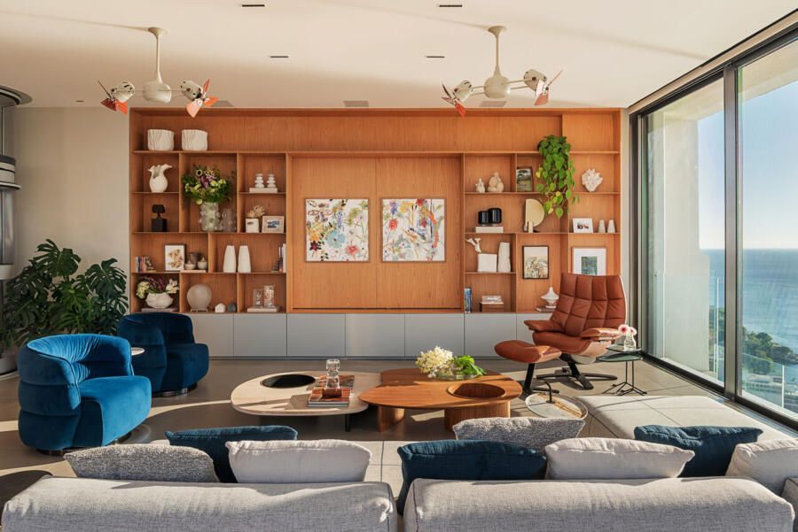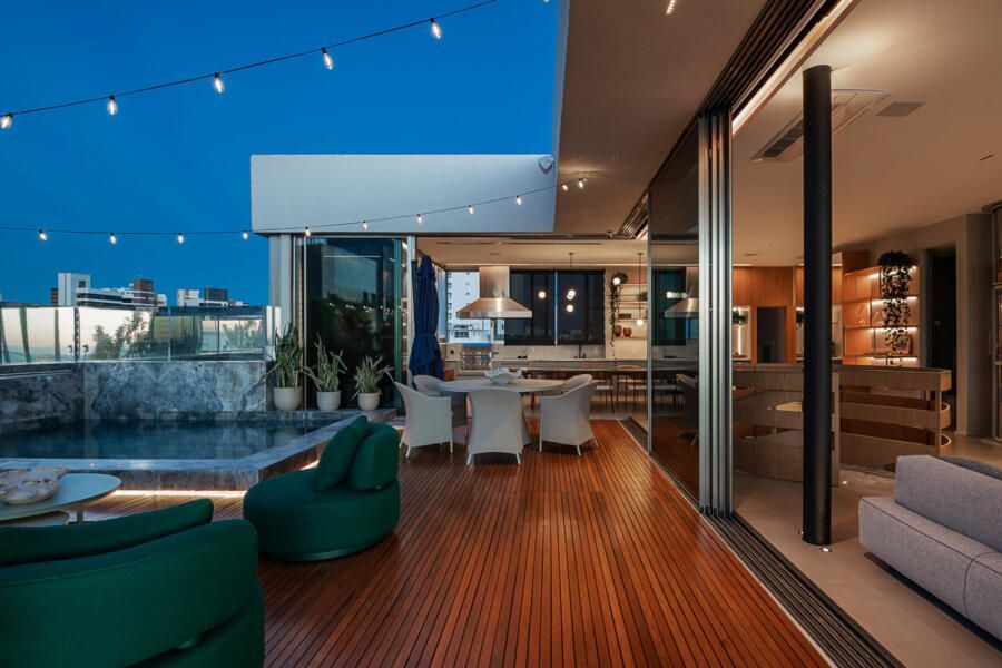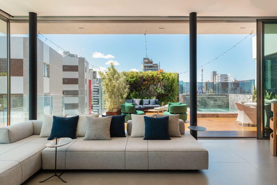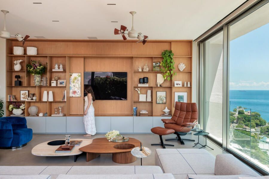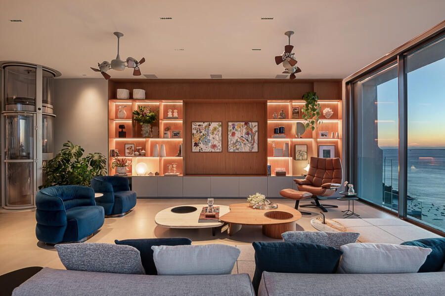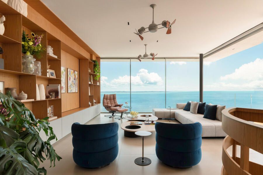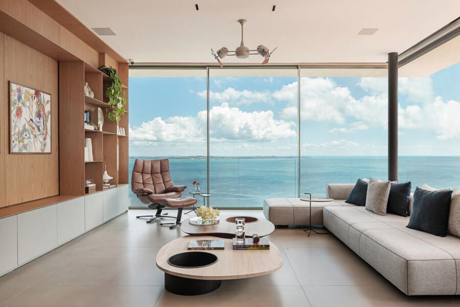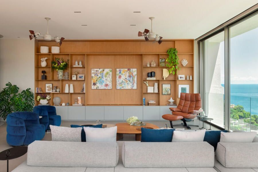 Em Salvador, com vista aberta para a Baía de Todos os Santos, este apartamento de 500m² assinado por Gabriella Machado Arquitetura marca o retorno de um morador ao bairro onde cresceu, agora em uma nova fase ao lado da esposa e do filho pequeno. A cobertura, sonho antigo do casal, tornou-se palco para receber família e amigos com generosidade e, ao mesmo tempo, resguardar a intimidade da rotina. O projeto levou cinco meses até sua definição e dois anos de obra para transformar completamente o imóvel em um refúgio contemporâneo com atmosfera de casa.