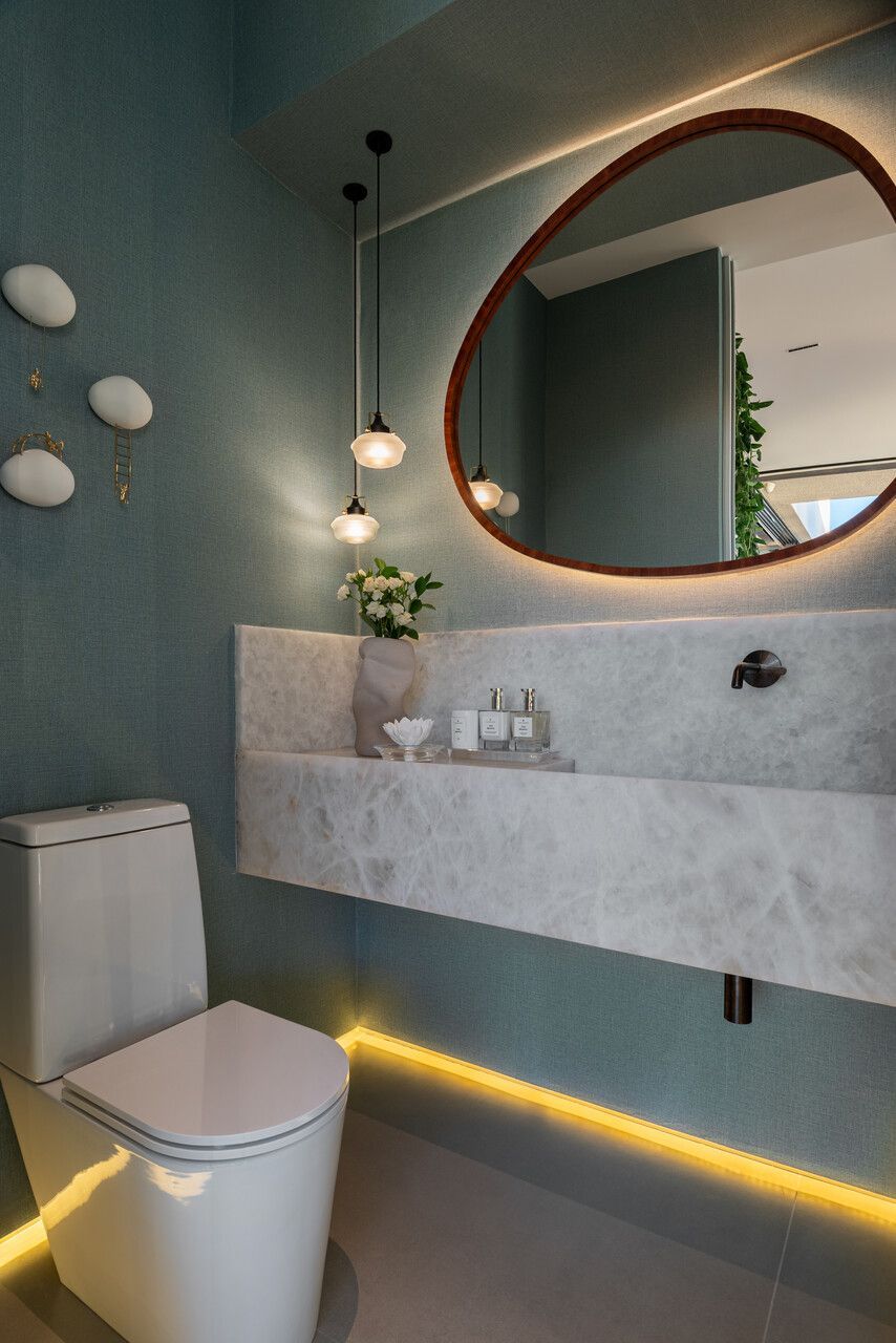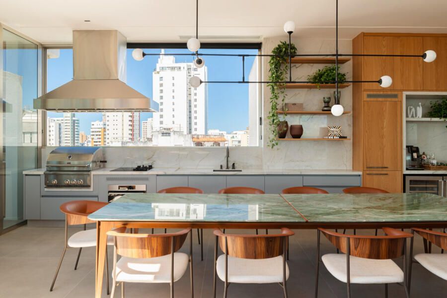 A base neutra em cinza claro e madeira natural costura todo o projeto, enquanto mais de sete tipos de mármores nacionais revestem banheiros, escada, estantes, piscina e bancadas. A marcenaria autoral, presente na escada, armários, estantes, cristaleira espelhada do jantar e móveis suspensos, combina freijó, palhinha sextavada, chapas metálicas e laca clara, criando unidade visual. A iluminação foi planejada em camadas, permitindo desde cenas gerais até atmosferas difusas com fitas de LED em cortineiros e nichos, além de pontos de apoio com abajures.