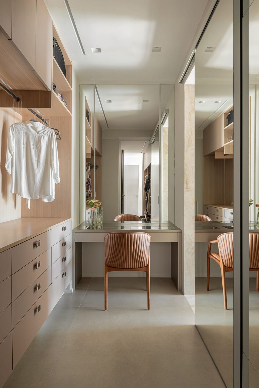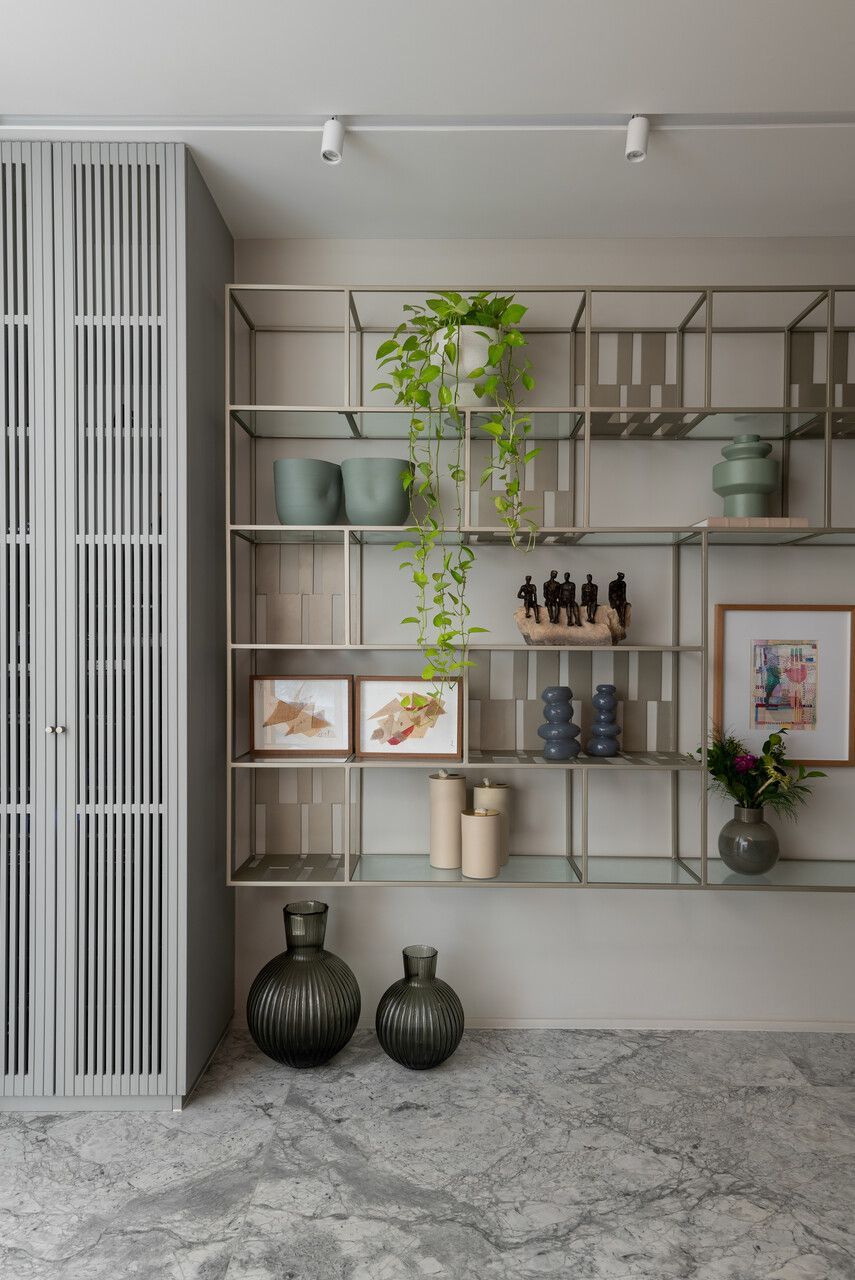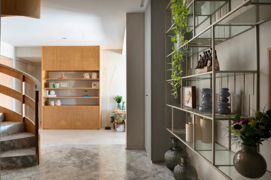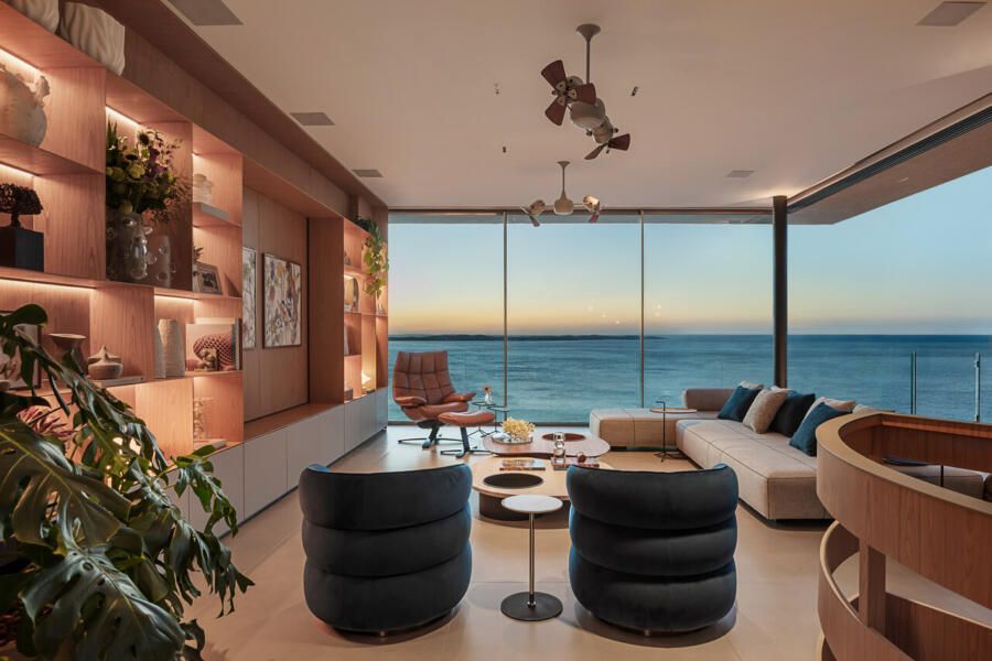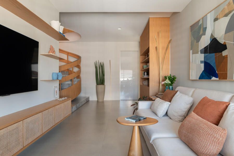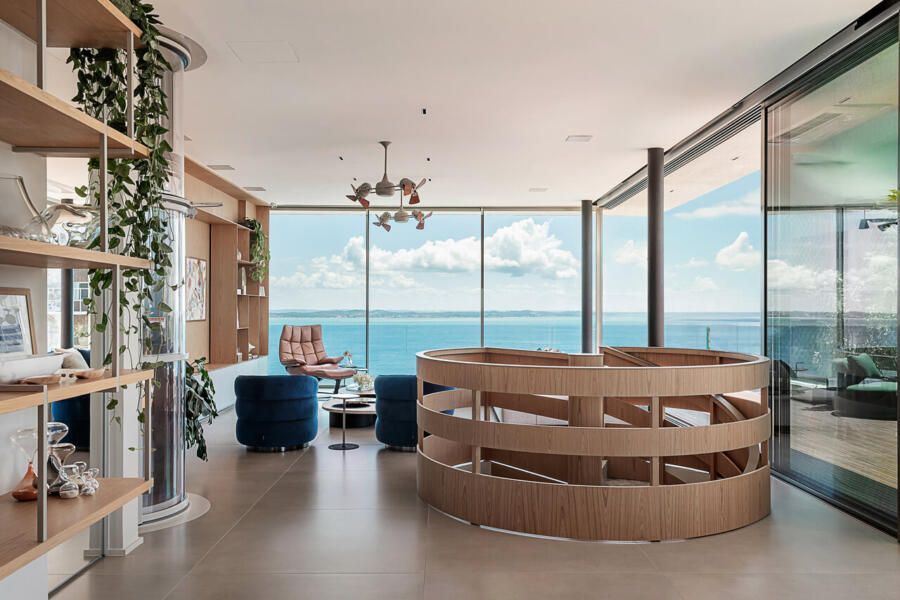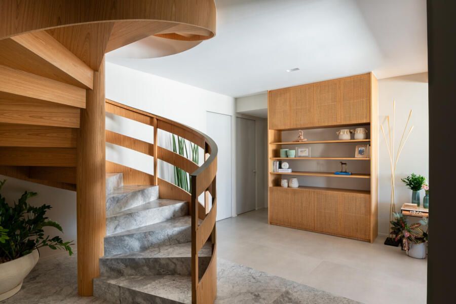A distribuição foi pensada para preservar a intimidade logo na chegada. Ao entrar pelo hall social, o visitante acessa um vestíbulo que concentra elevador e uma escada helicoidal de caráter escultural, desenhada pelo escritório e revestida em mármore arabescato e freijó natural. Ali, armários ripados em laca cinza escondem o rack de automação e a sapateira, enquanto a serralheria em tom de ouro velho emoldura obras como a cerâmica azul da Olí Estúdio e a tela de Teresa Messeder. A posição do último degrau foi cuidadosamente calculada para que, ao alcançar o pavimento superior, o mar se revele como cenário principal.