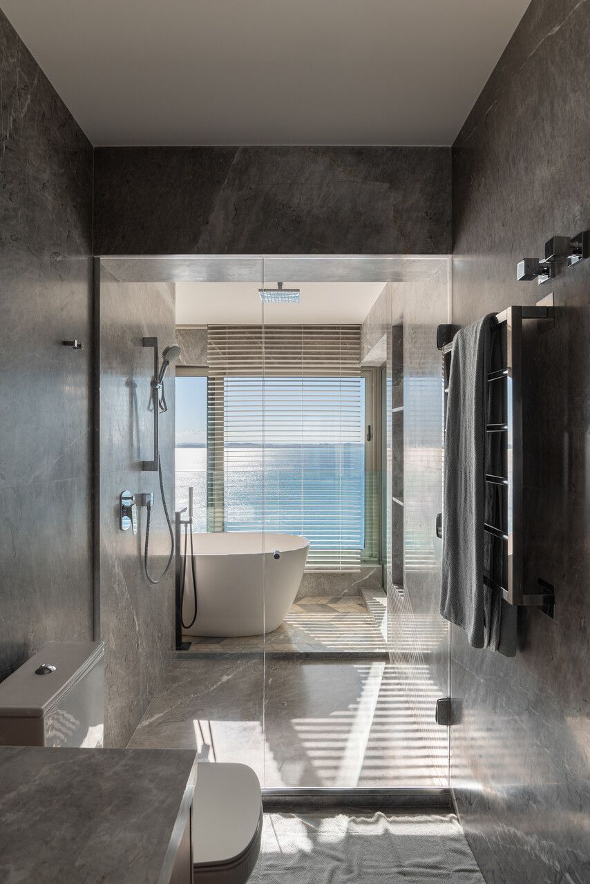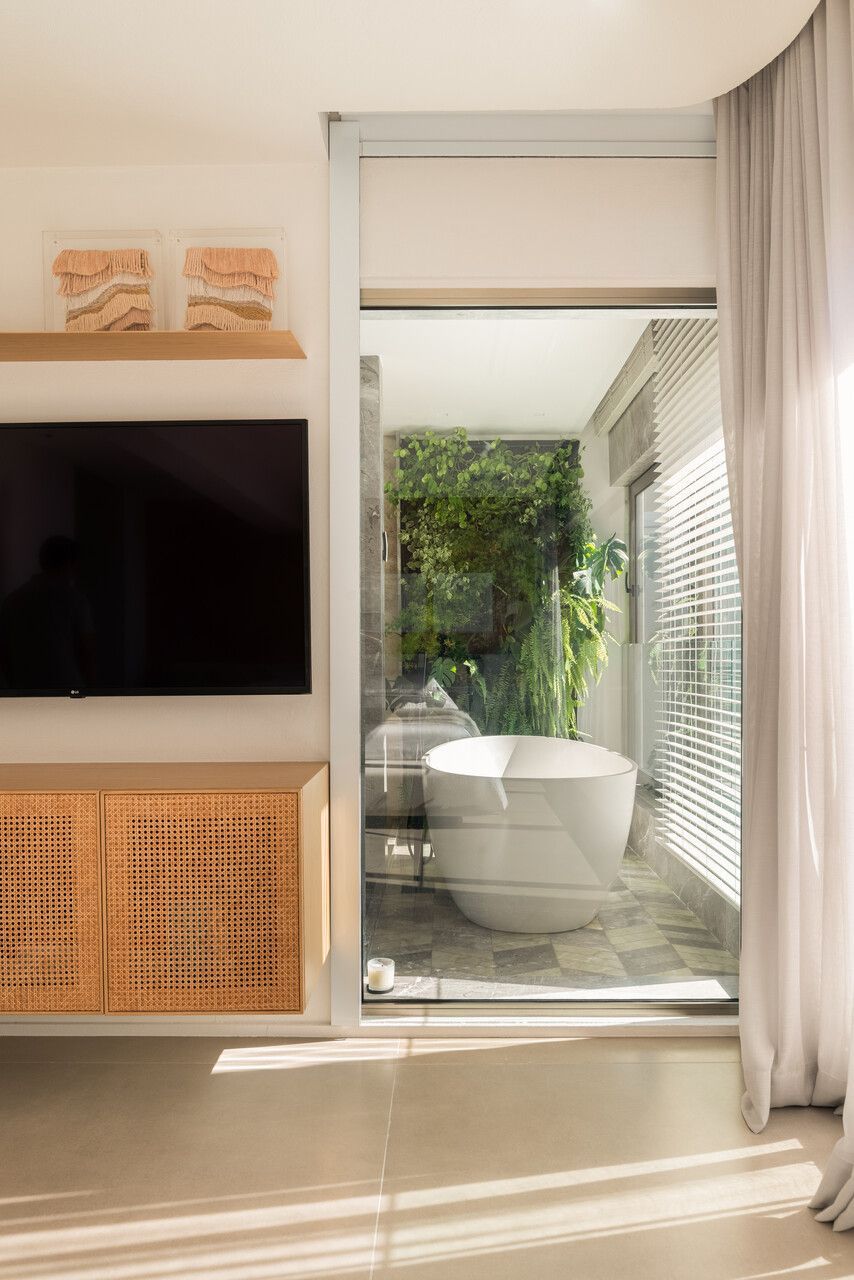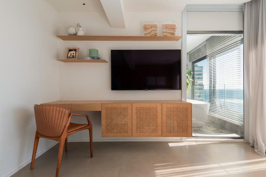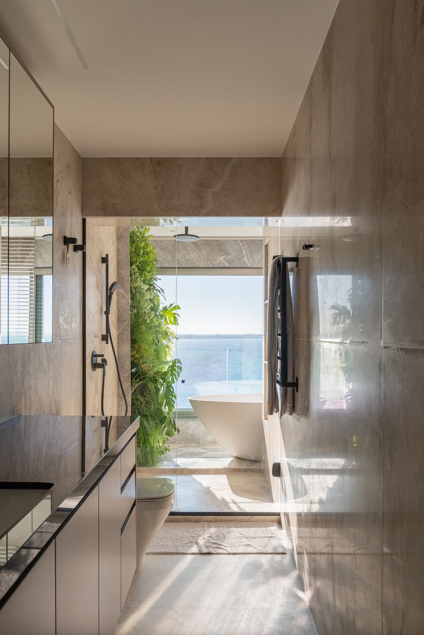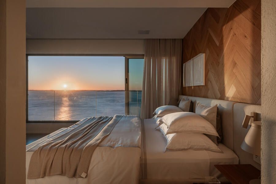 No pavimento inferior, concentram-se as áreas íntimas: sala de TV da família, copa de apoio e quatro suítes. A suíte master ocupa o antigo espaço da sala e da varanda, garantindo vista frontal para o mar mesmo a partir da cama. Pensada como refúgio do casal, recebeu textura rústica nas paredes e no teto, além de uma paleta suave com linho, palhinha natural, madeira clara e cinza claro. Dois closets independentes conduzem aos sanitários, cada um revestido com um mármore distinto, que se encontram na área da banheira de imersão com jardim vertical. O piso desse espaço foi desenhado pelo escritório, unindo os mármores dos dois banheiros em um desenho exclusivo. Do quarto, através de uma janela piso-teto, a banheira se integra visualmente ao ambiente, sempre com a Baía de Todos os Santos ao fundo.