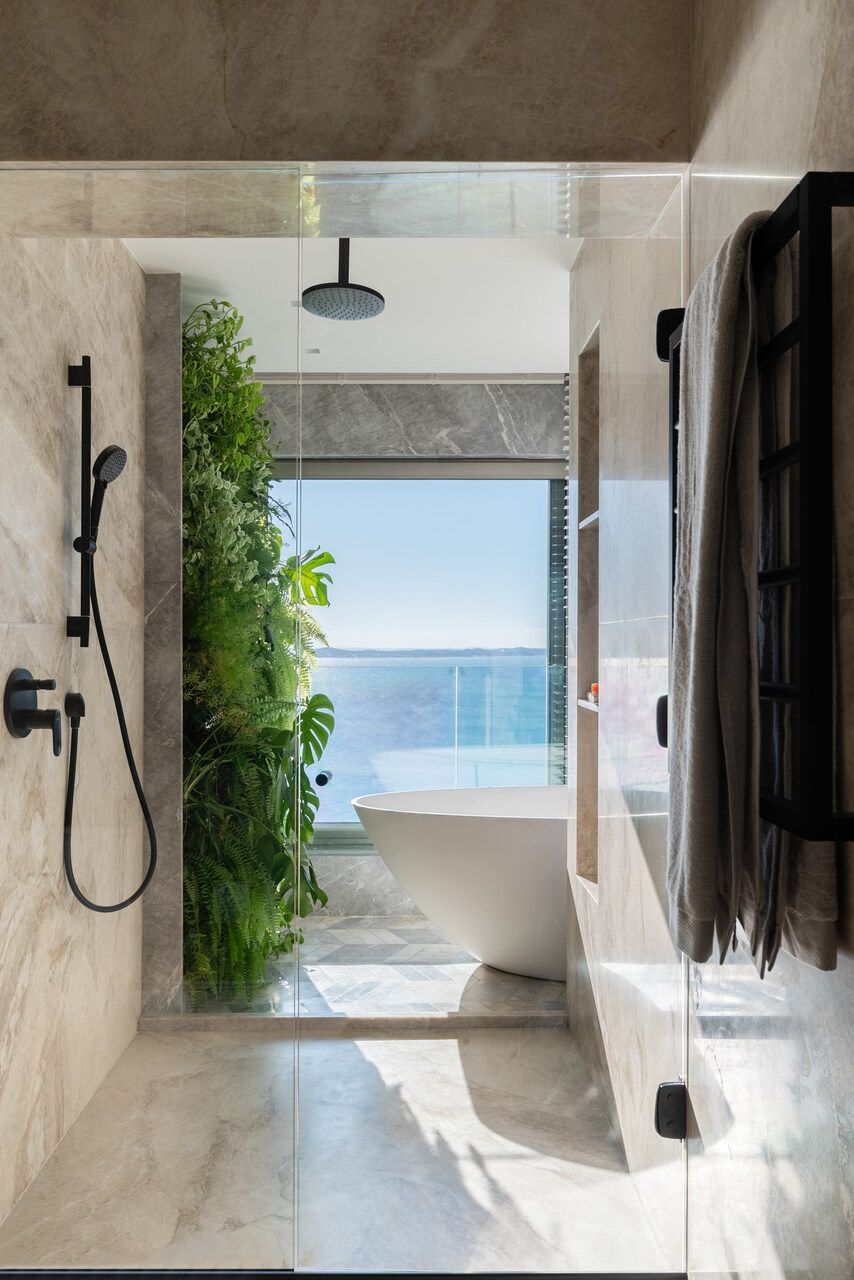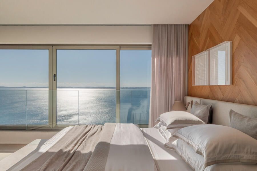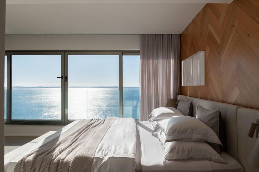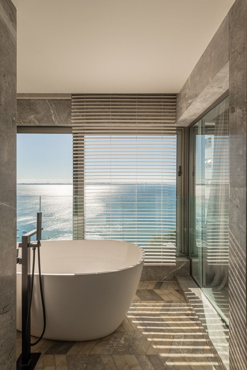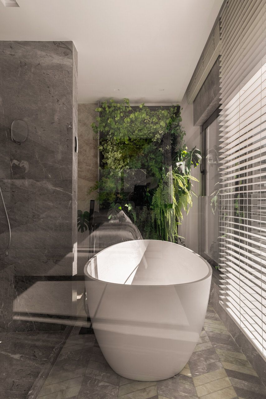 No pavimento inferior, concentram-se as áreas íntimas: sala de TV da família, copa de apoio e quatro suítes. A suíte master ocupa o antigo espaço da sala e da varanda, garantindo vista frontal para o mar mesmo a partir da cama. Pensada como refúgio do casal, recebeu textura rústica nas paredes e no teto, além de uma paleta suave com linho, palhinha natural, madeira clara e cinza claro. Dois closets independentes conduzem aos sanitários, cada um revestido com um mármore distinto, que se encontram na área da banheira de imersão com jardim vertical. O piso desse espaço foi desenhado pelo escritório, unindo os mármores dos dois banheiros em um desenho exclusivo. Do quarto, através de uma janela piso-teto, a banheira se integra visualmente ao ambiente, sempre com a Baía de Todos os Santos ao fundo.