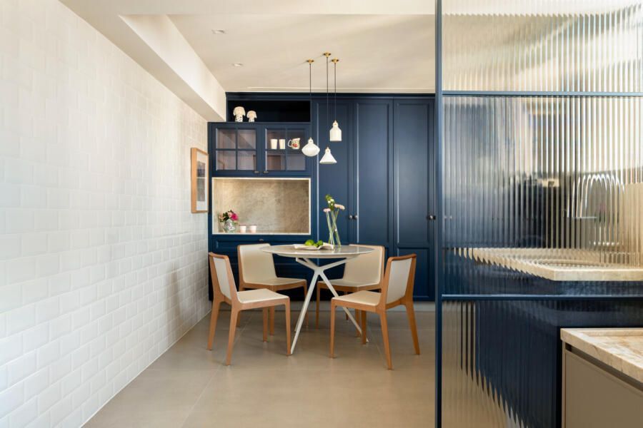 A área externa prolonga a sensação de casa: um estar descoberto envolvido por jardim vertical que esconde discretamente o chuveiro antecede a piscina reformulada, agora com iluminação especial, cascata, hidromassagem, aquecimento e revestimento em mármore azul. Ao lado do jantar, uma grande bancada funciona como cozinha da família, com geladeira embutida e porta camuflada que conduz à cozinha de serviço. No home office, fechado por divisória de vidro, o casal trabalha com visão ampla da casa e do mar. A copa azul, cor preferida dos moradores, reforça o caráter afetivo do pavimento íntimo.