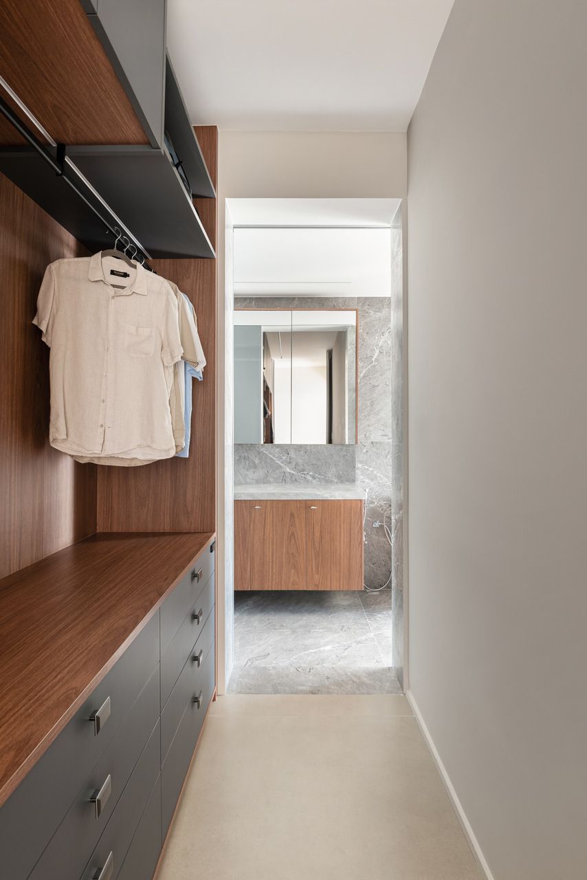 Clientes antigos do escritório, eles confiaram à equipe uma mudança radical de conceito. O apartamento passou por uma reformulação estrutural de grande escala: a escada mudou de lugar, um elevador interno foi inserido, quatro novos banheiros foram criados e todos os ambientes tiveram suas posições alteradas. Sem acesso aos projetos originais do prédio antigo, a equipe enfrentou o desafio de redesenhar prumadas, elevar pisos para acomodar novas áreas molhadas e reestruturar infraestruturas elétricas e hidráulicas. A cobertura existente foi demolida para dar lugar a uma nova estrutura metálica, que ampliou o pé-direito do pavimento superior para mais de três metros e possibilitou a instalação adequada do ar-condicionado.