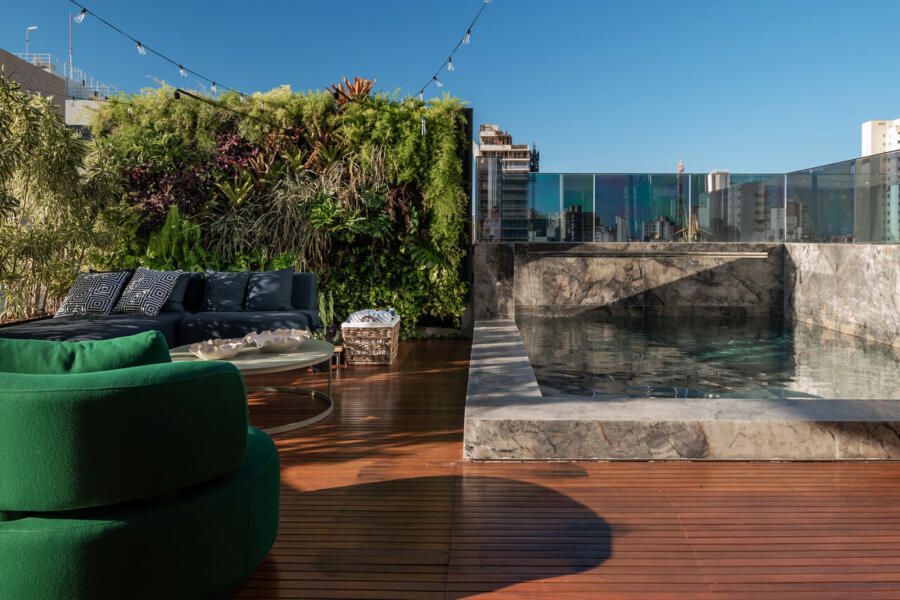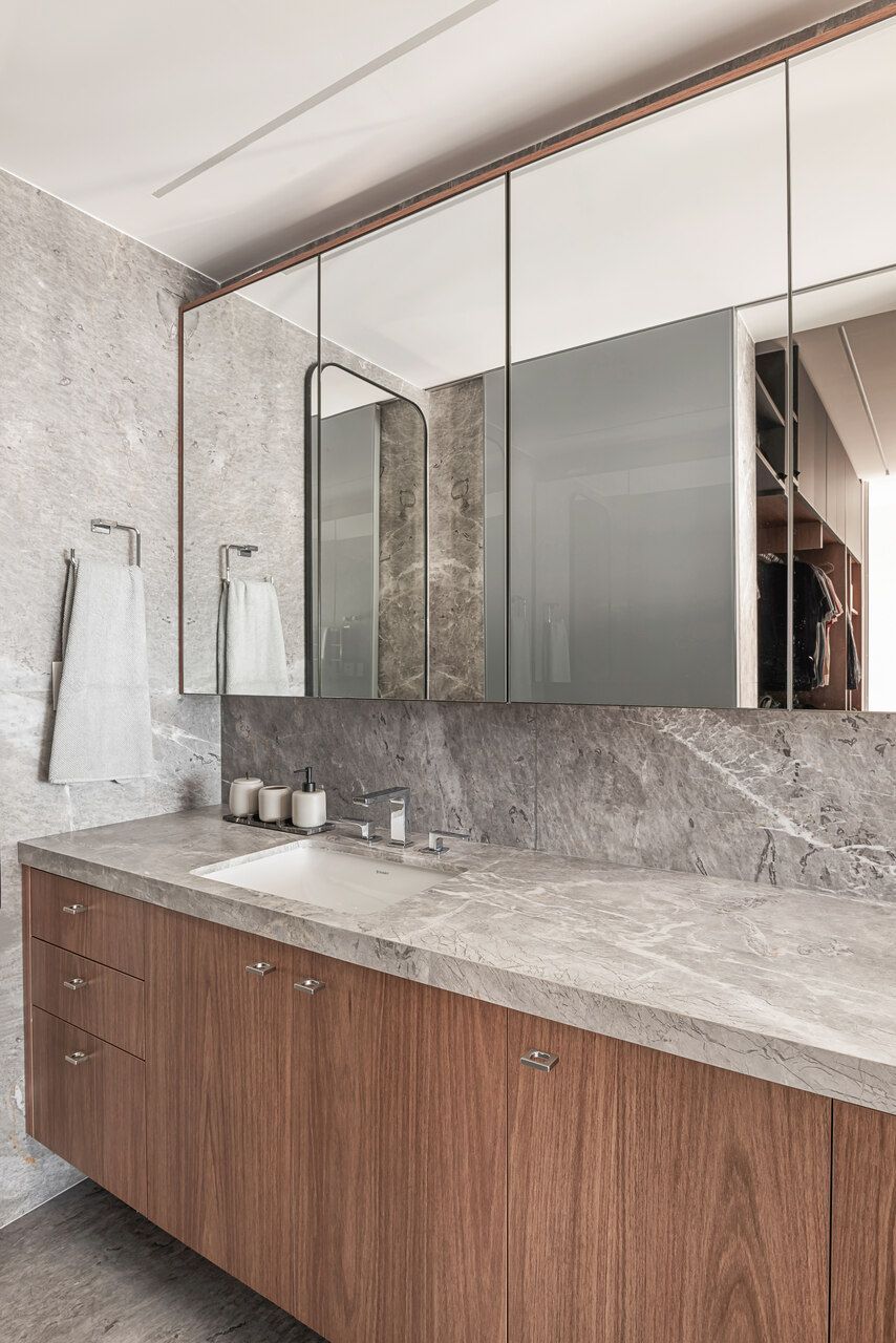 “Os clientes pediram uma base neutra com cinza claro e madeira natural como materiais predominantes no apartamento. Além desses materiais, foram utilizados uma variedade de mais de 7 mármores nacionais, que revestem banheiros, piscina, escada, estante e bancadas.”