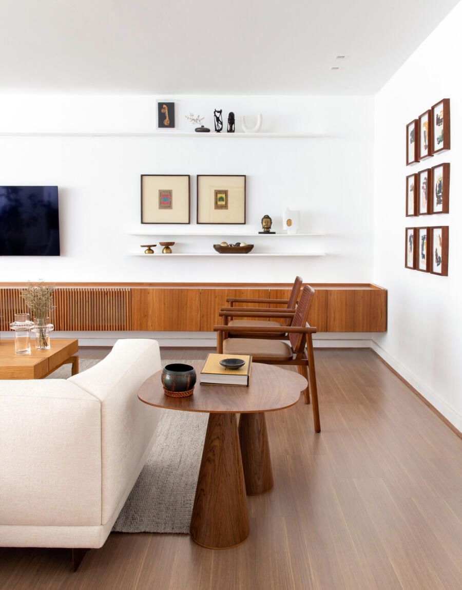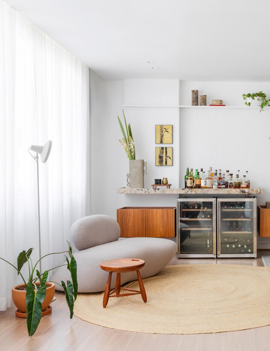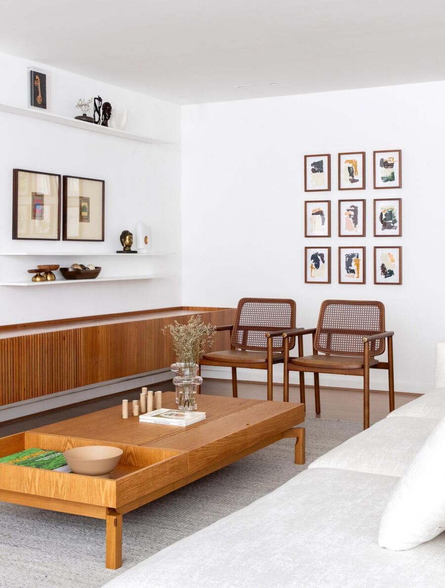 O pedido principal do casal para o arquiteto Rafael Ramos foi claro: uma decoração que pudesse ser levada facilmente para um novo endereço no futuro. Por isso, o projeto apostou em móveis soltos e marcenarias moduladas, criadas sob medida, mas com a flexibilidade necessária para se adaptarem a outros espaços.