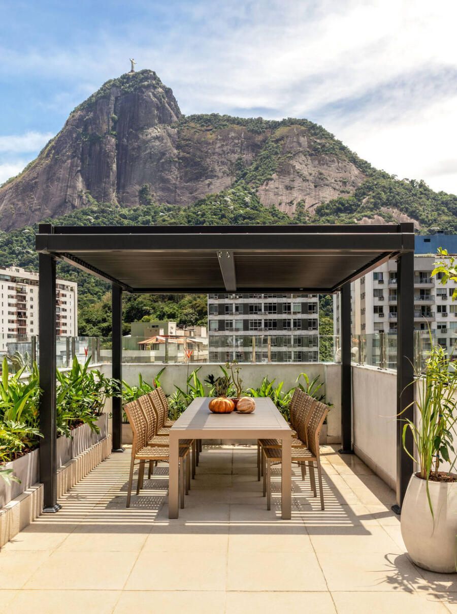 No piso superior, a área de lazer foi totalmente pensada para os momentos de relaxamento. O destaque vai para a área de refeições ao ar livre, com mesa e cadeiras resistentes ao tempo, protegidas por um pergolado metálico com lâminas ajustáveis. Essa estrutura permite controlar a entrada de sol e protege da chuva, tornando o ambiente ainda mais versátil.