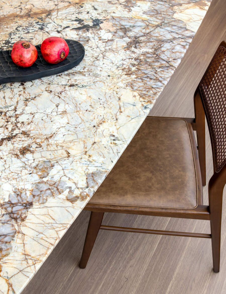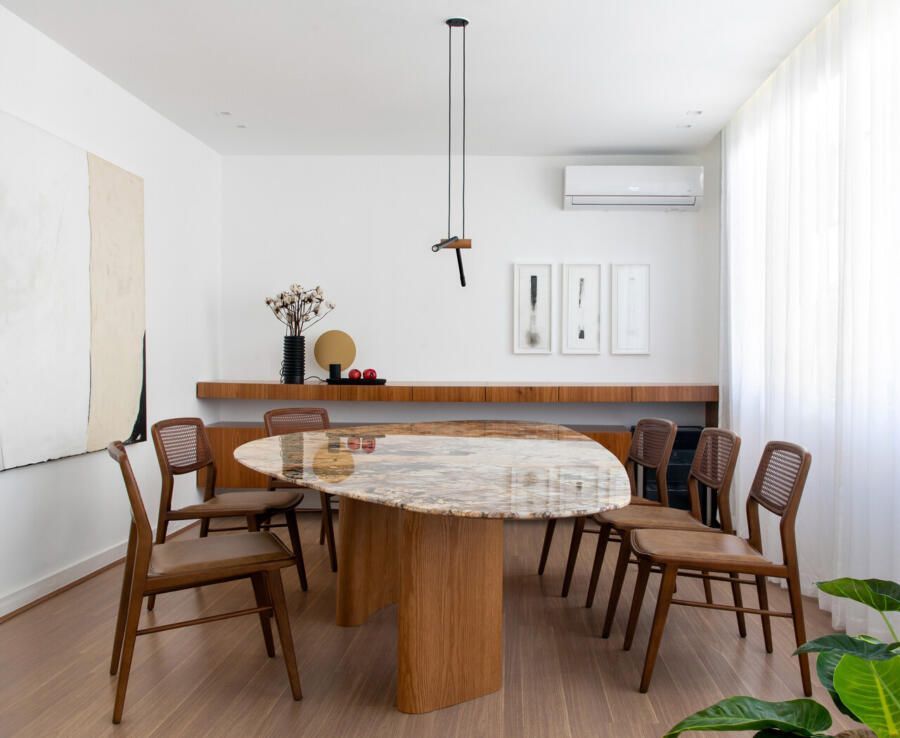 A área social conta com peças novas, como sofá, cadeiras, poltronas e mesa de jantar. Apenas um banco antigo foi reaproveitado do apartamento anterior, provando que é possível equilibrar o novo e o já existente com harmonia.