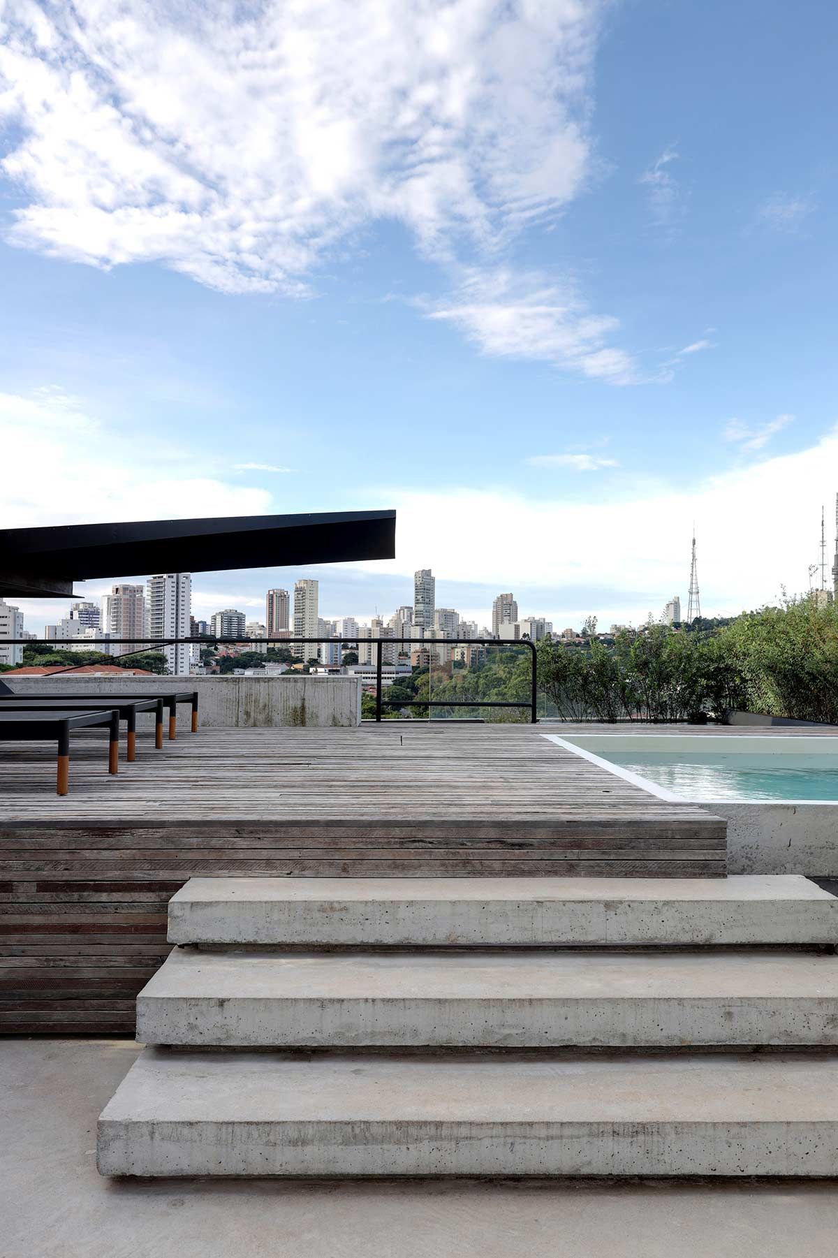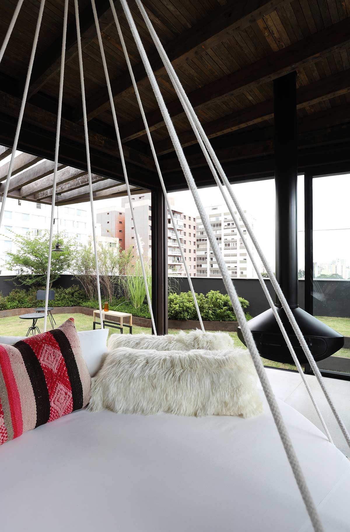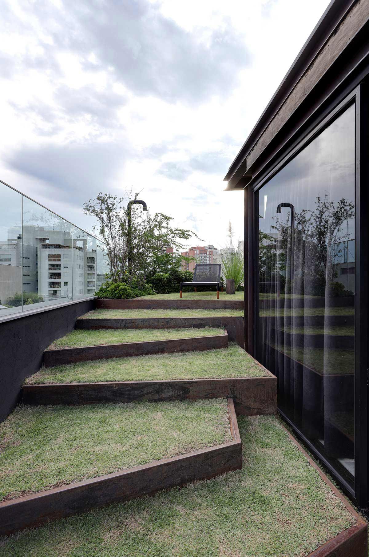 O layout amplo e aberto conta com acabamentos brutos e estruturas expostas, que os clientes gostam bastante. No primeiro pavimento está o estar, com bar e mesa de sinuca, e os dormitórios, resumidos em quarto para hóspedes, um para o filho e a suíte principal, com direito a escada espiral que leva ao ambiente mais reservado da cobertura: o bangalô. A piscina, churrasqueira, lareira, sauna, deck e um espaçoso jardim preenchem o andar de cima, para curtirem com a família e os amigos.