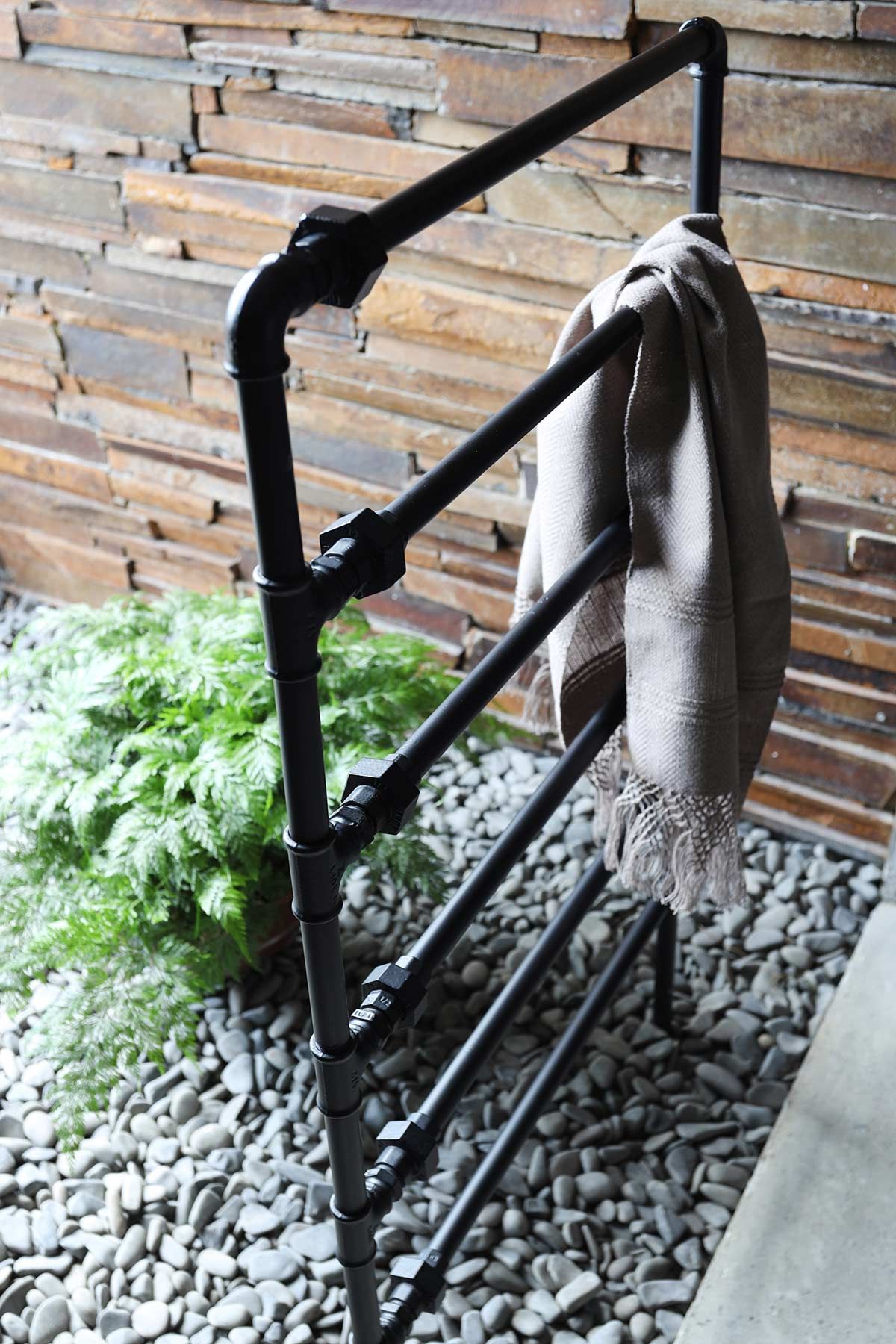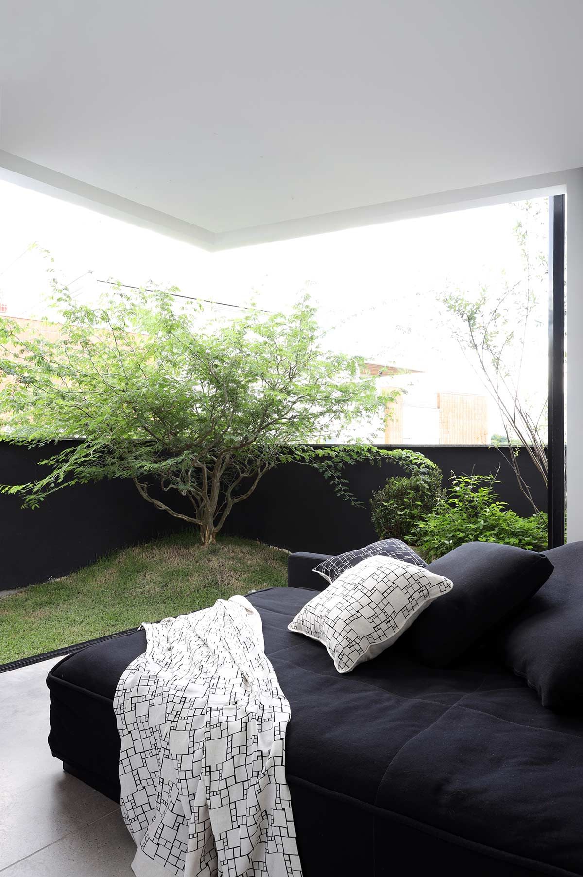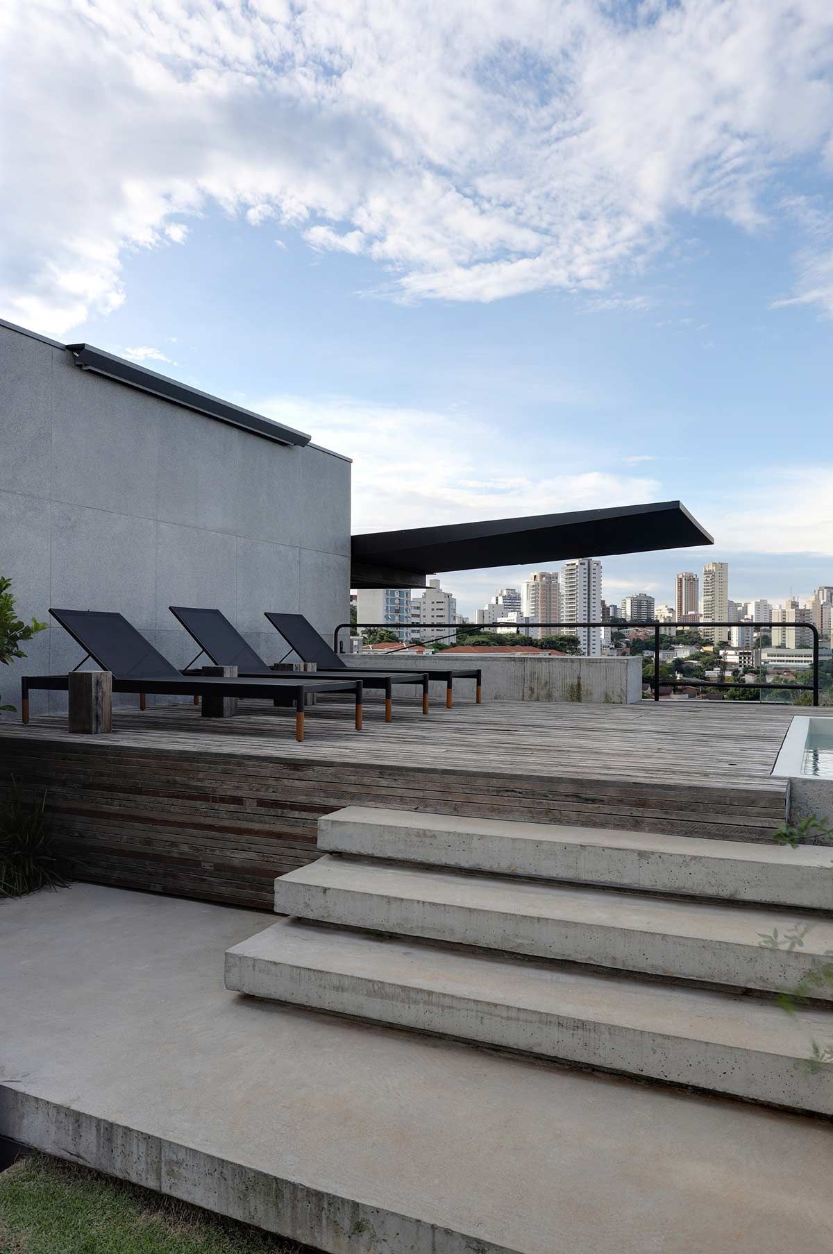 O layout amplo e aberto conta com acabamentos brutos e estruturas expostas, que os clientes gostam bastante. No primeiro pavimento está o estar, com bar e mesa de sinuca, e os dormitórios, resumidos em quarto para hóspedes, um para o filho e a suíte principal, com direito a escada espiral que leva ao ambiente mais reservado da cobertura: o bangalô. A piscina, churrasqueira, lareira, sauna, deck e um espaçoso jardim preenchem o andar de cima, para curtirem com a família e os amigos.