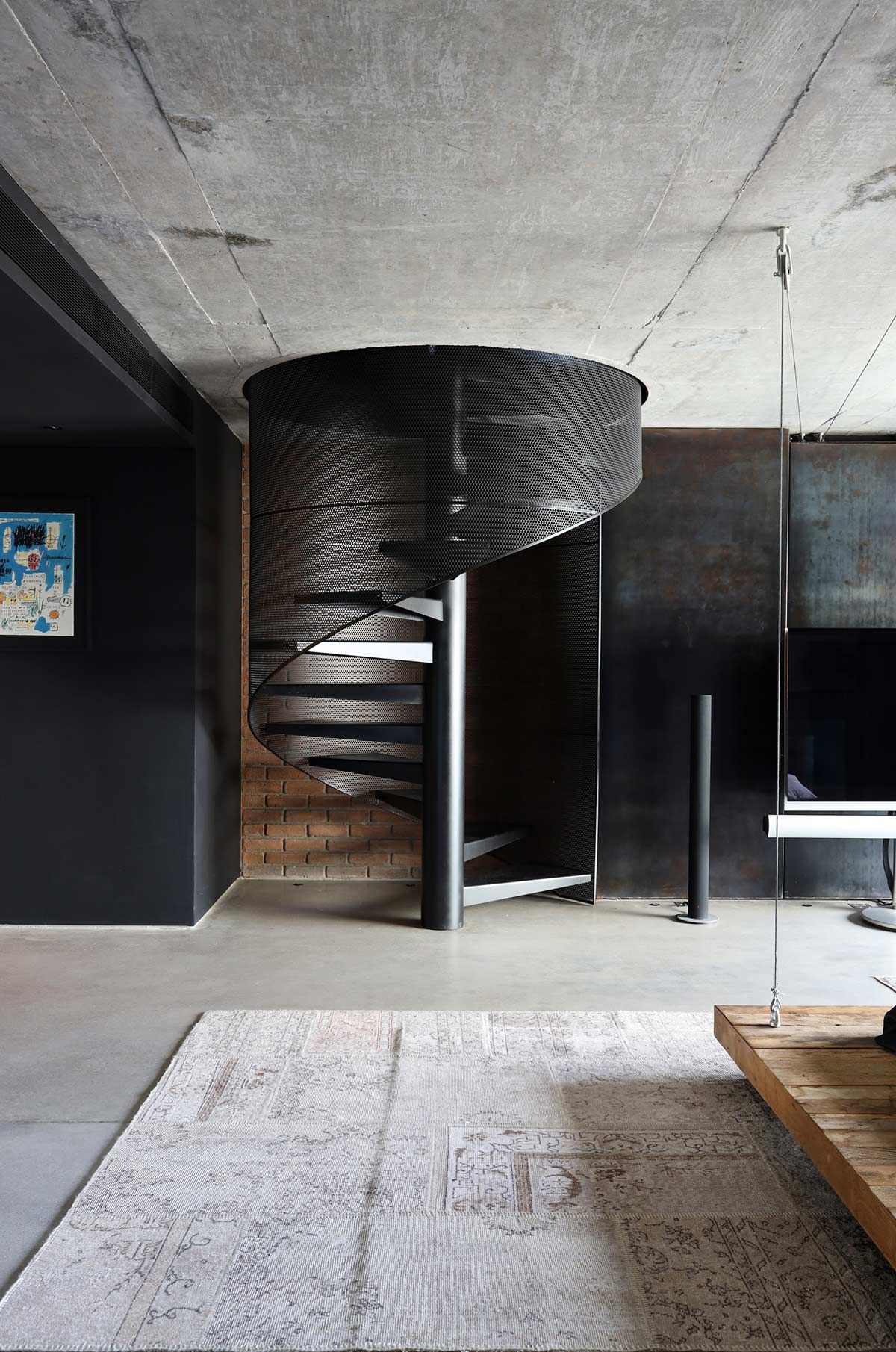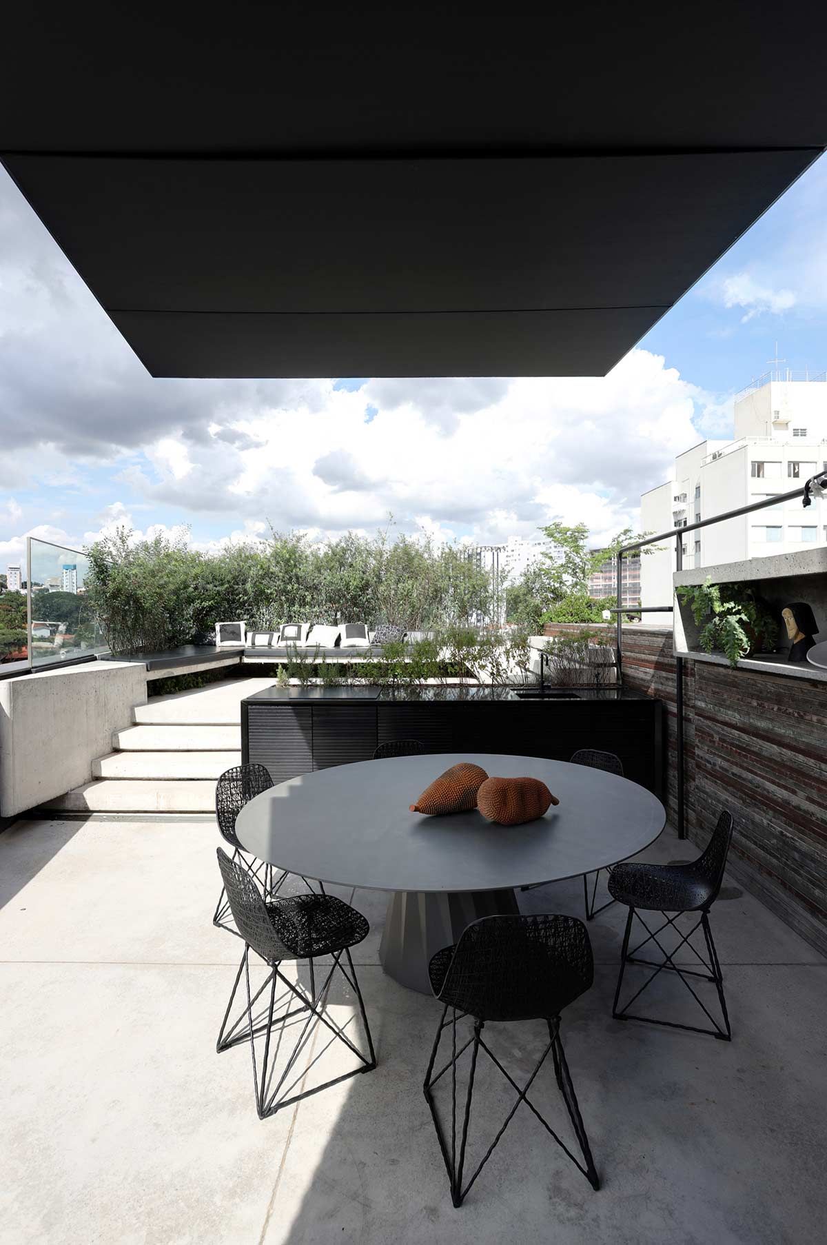 O apartamento é praticamente todo em concreto aparente e utilizamos muito aço. Adoramos essa linguagem industrial e, nesse caso, aproveitamos a chance de fugir do óbvio, pois o cliente nos deu liberdade a partir de seu bom gosto e exigência.