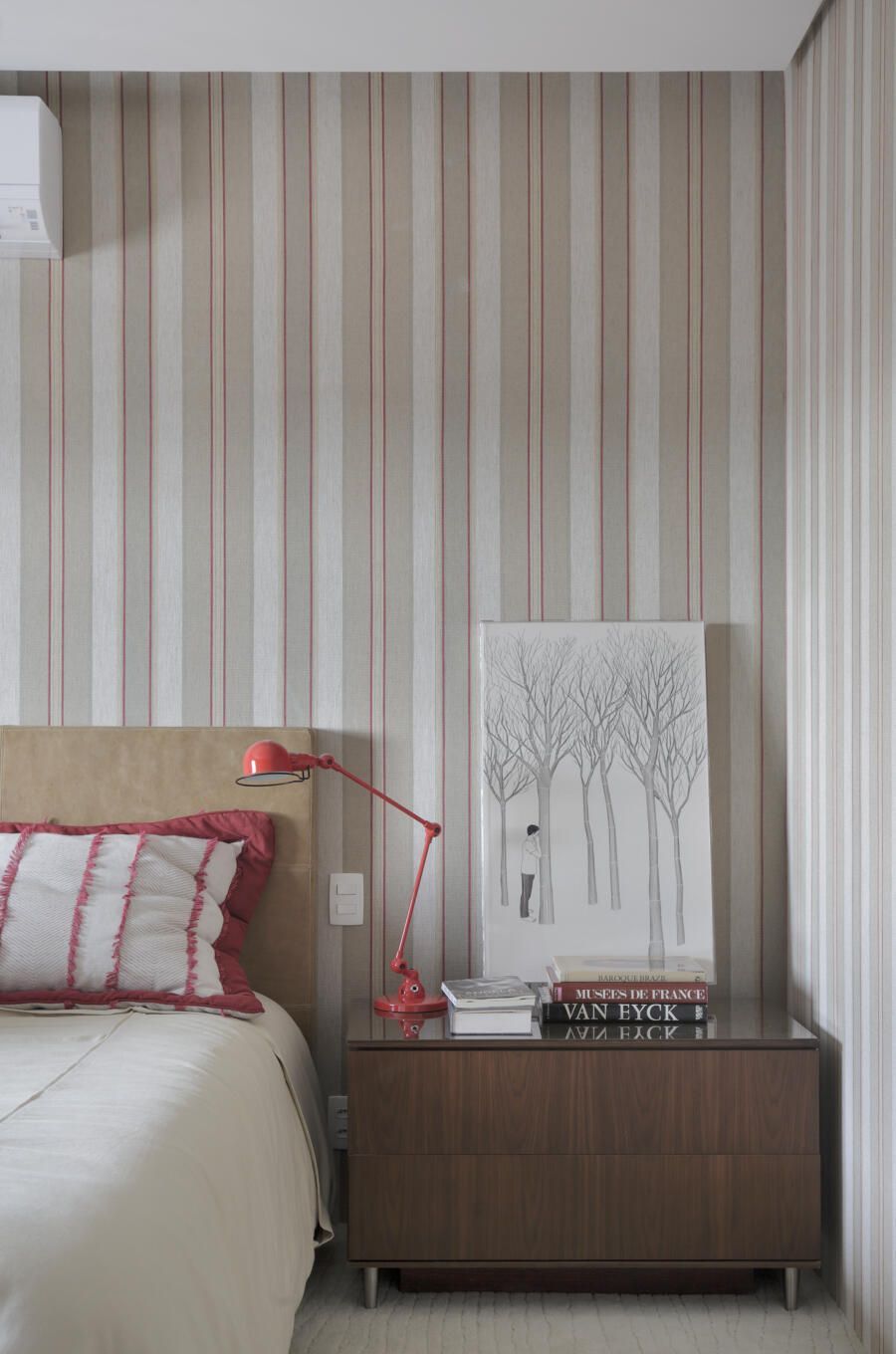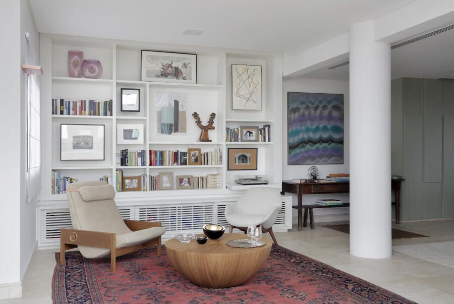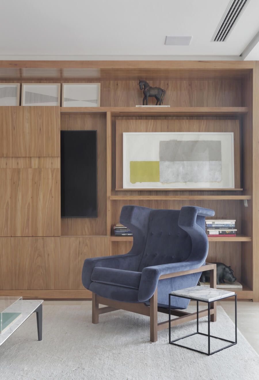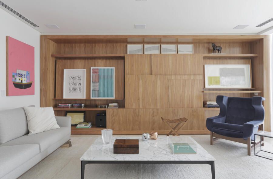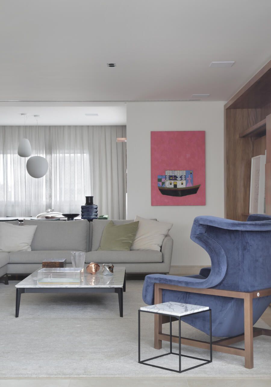 “A paleta de cores em tons neutros dos tecidos e até o azul marinho da poltrona Voltaire de Sergio Rodrigues foram pensadas para se harmonizar com as obras de arte.”