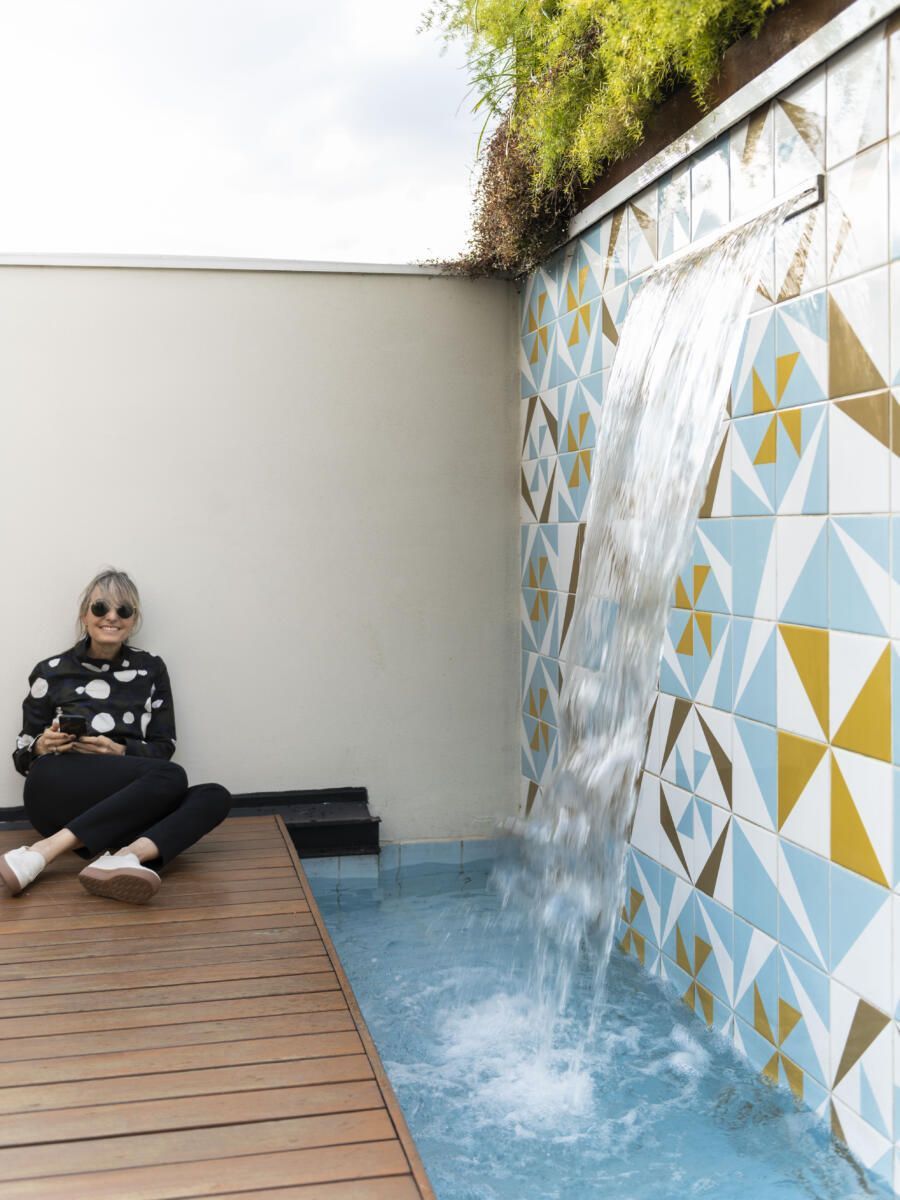 Entretanto, sem dúvida o ponto alto do projeto se deu com as mudanças realizadas no terraço, que ganhou áreas verdes e um mural de azulejos com muita história. Isso porque em 2012, ao arrumar as estantes e gavetas do pai – o famoso arquiteto e muralista Noel Marinho – Patricia se deparou com modelos e desenhos antigos de azulejos, e decidiu dar continuidade a essas criações.