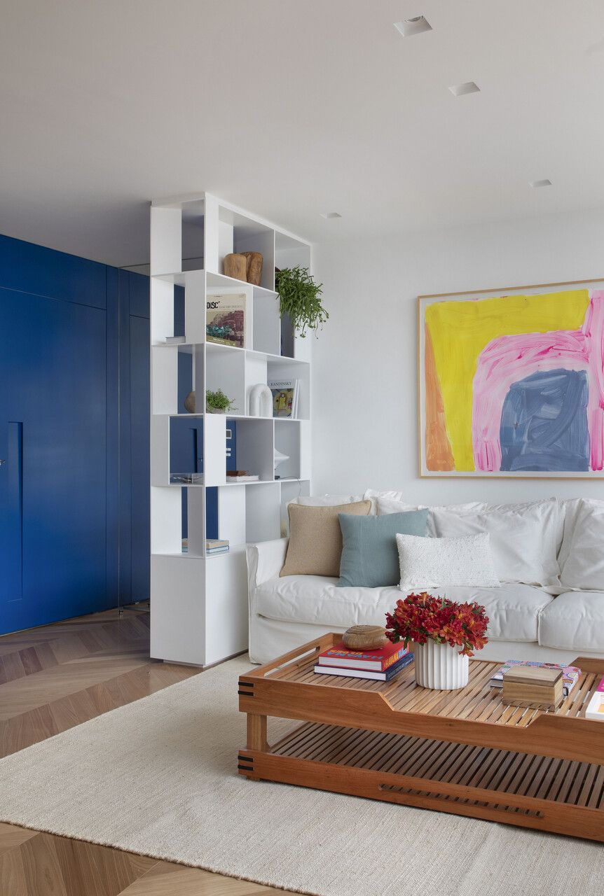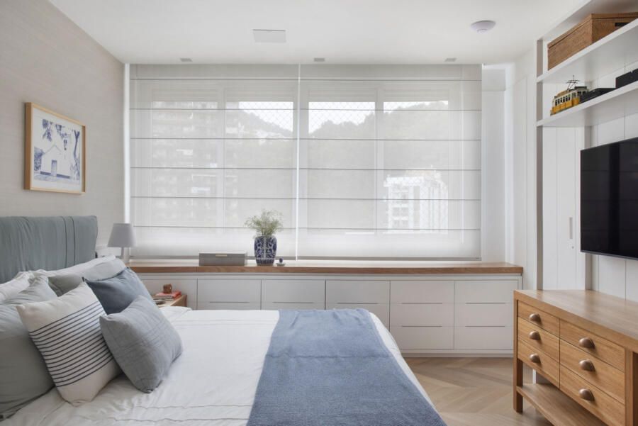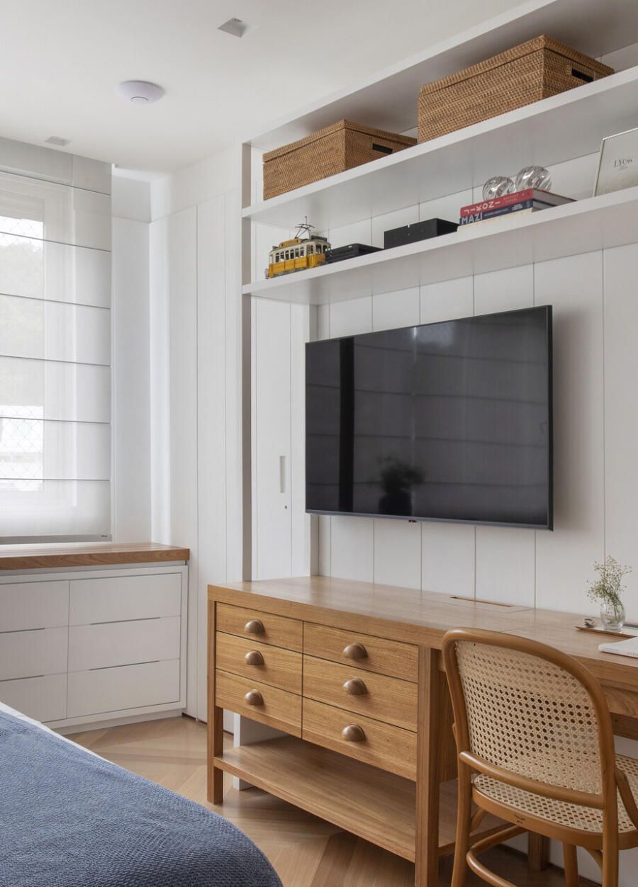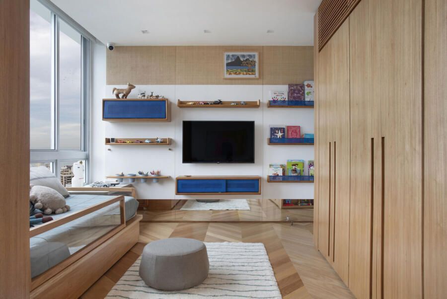 “No caso específico do quarto do filho mais velho, a parede voltada para a área social foi substituída por portas de correr, permitindo, assim, que o espaço também seja usado como brinquedoteca ou sala de tv.”