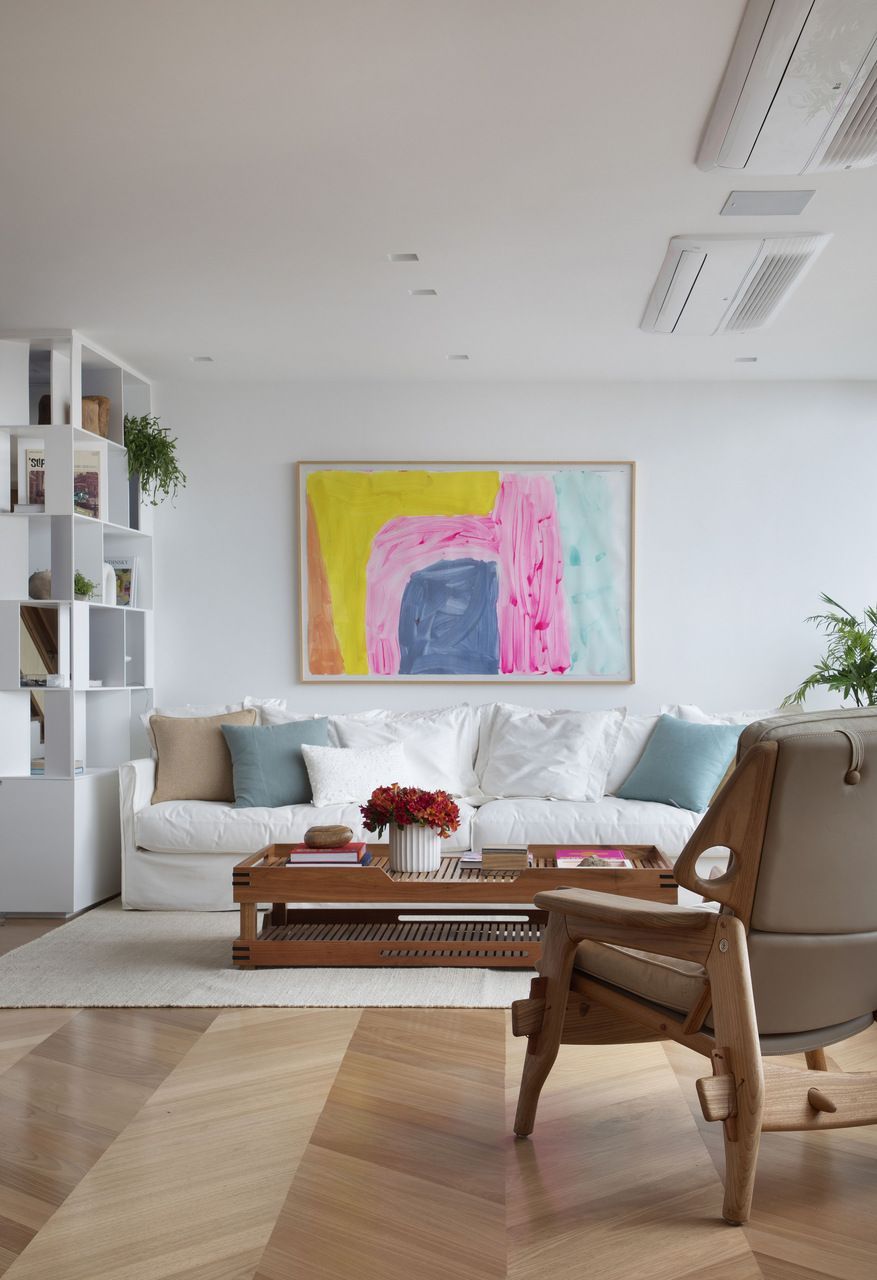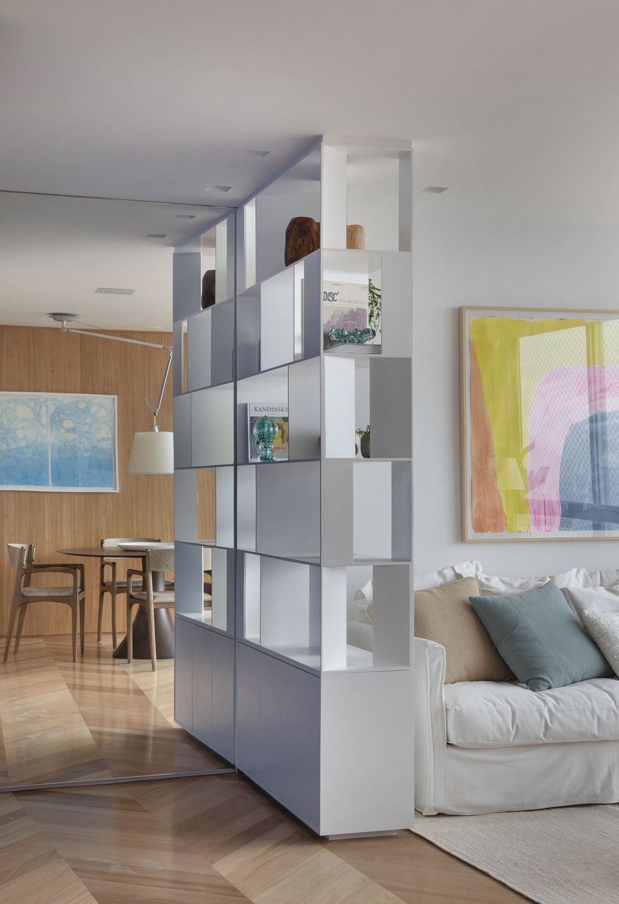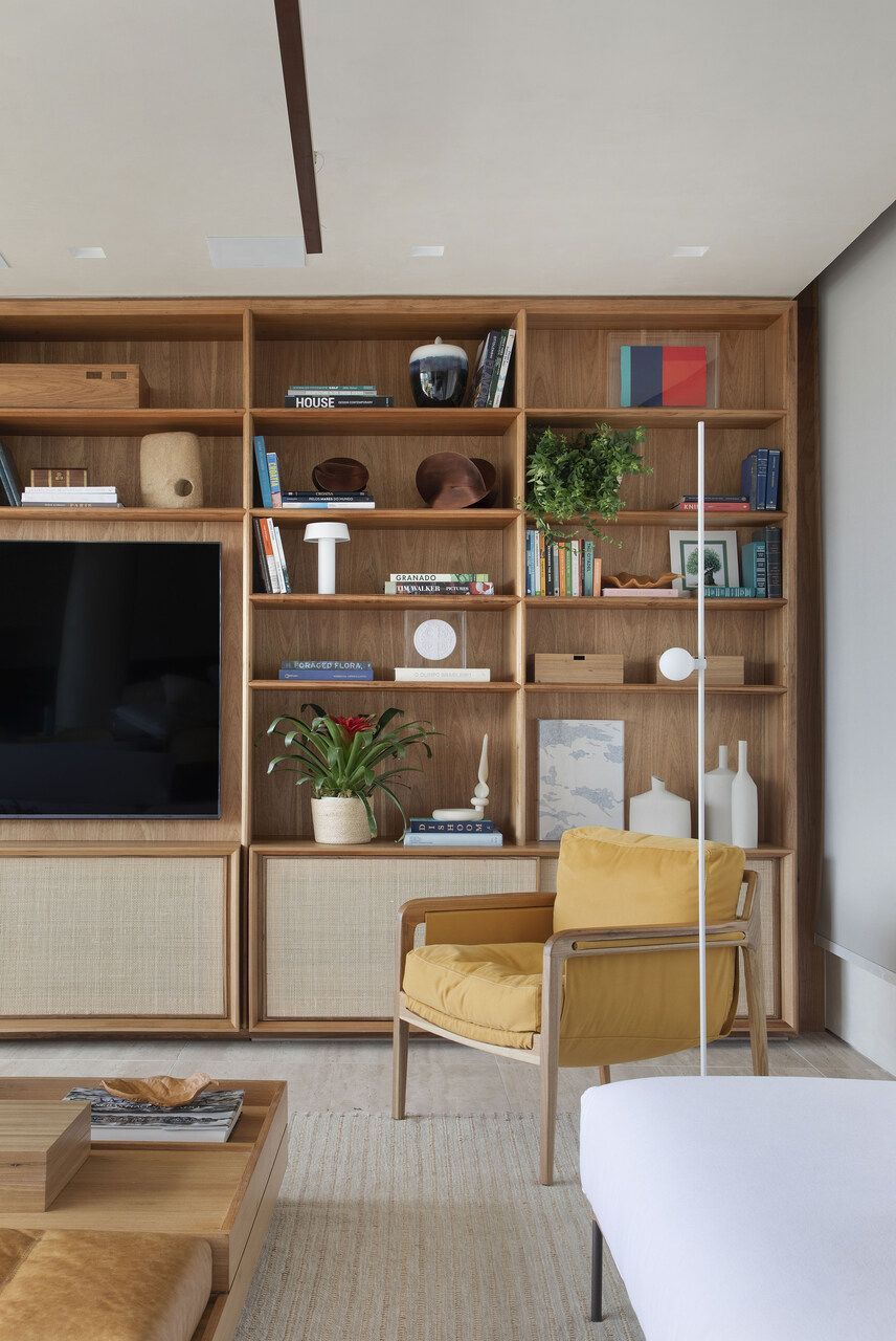 “No caso específico do quarto do filho mais velho, a parede voltada para a área social foi substituída por portas de correr, permitindo, assim, que o espaço também seja usado como brinquedoteca ou sala de tv.”