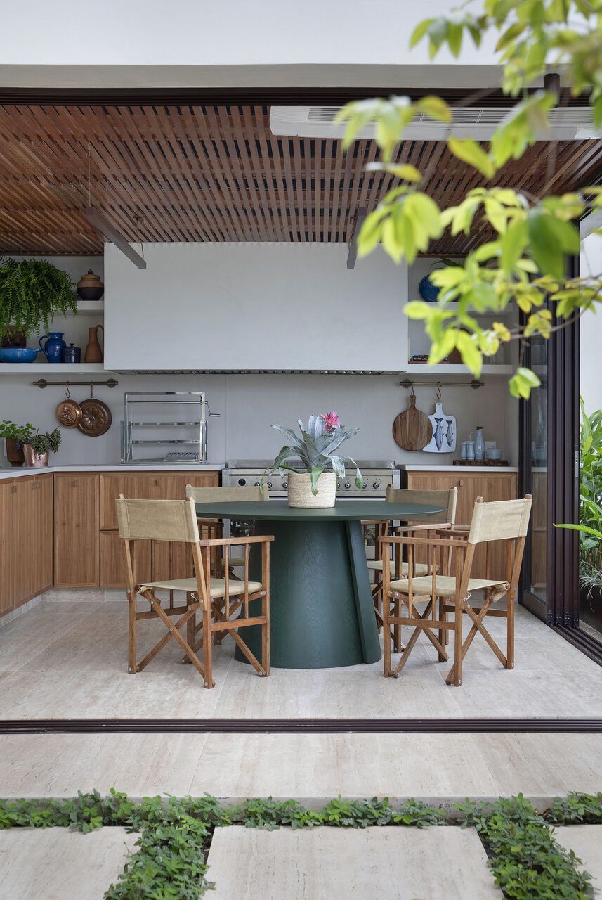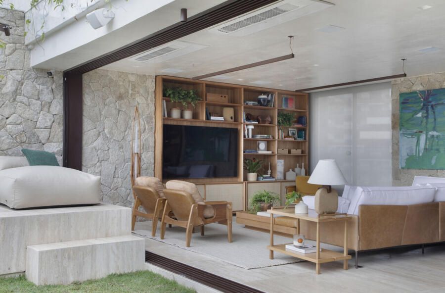 Batizado pelo escritório de “cobertura jardim”, o pavimento superior foi transformado em um espaço único que integra as áreas de jantar e estar com TV, o gramado externo natural, a piscina e um pergolado com função de cozinha gourmet.