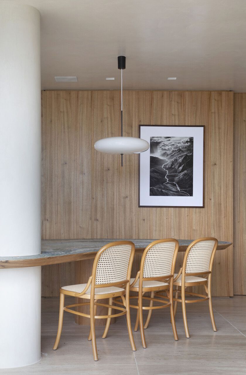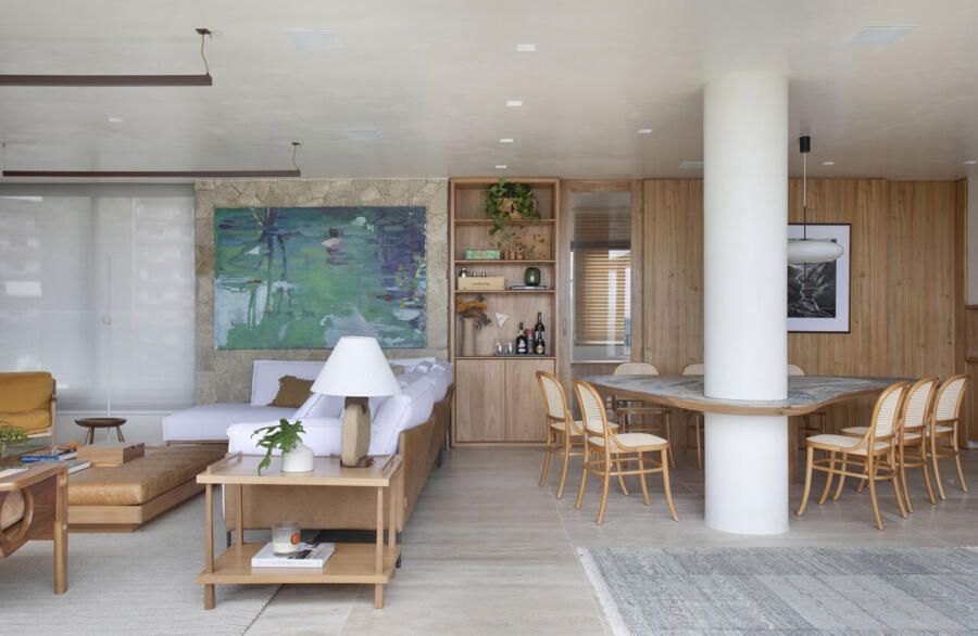 “Nossa intenção era deixar o espaço livre de colunas, mas um projeto de reforço estrutural apontou que este pilar, em particular, suportava o peso da caixa d’água e, por isso, não poderia ser remanejado. Decidimos, então, arredondar sua forma para seguir o desenho curvo da mesa, de formas orgânicas, com tampo em mosaico apoiado sobre uma base de madeira.”