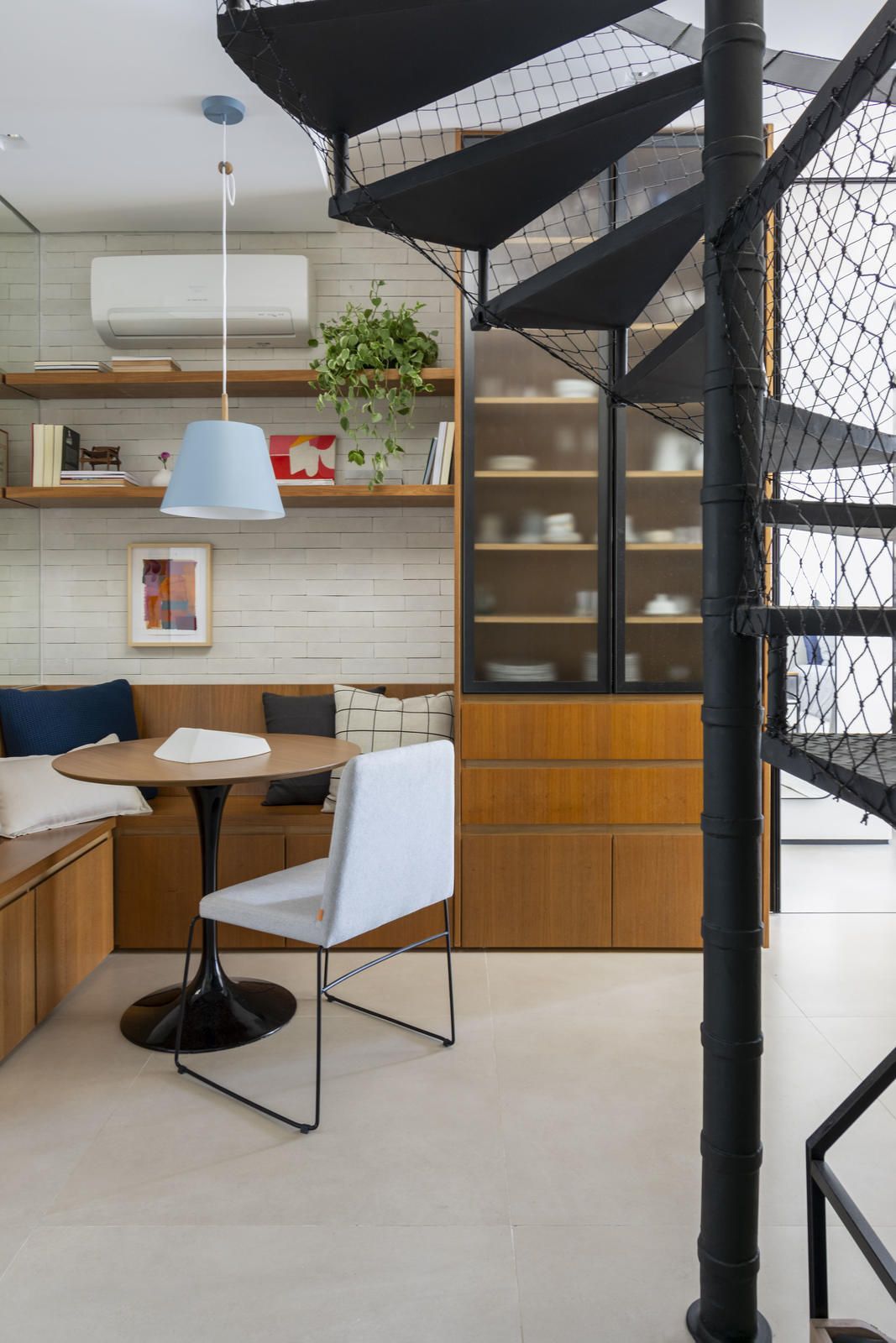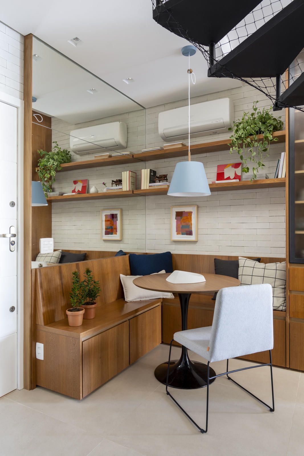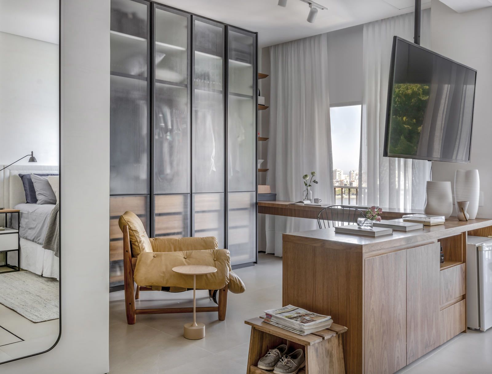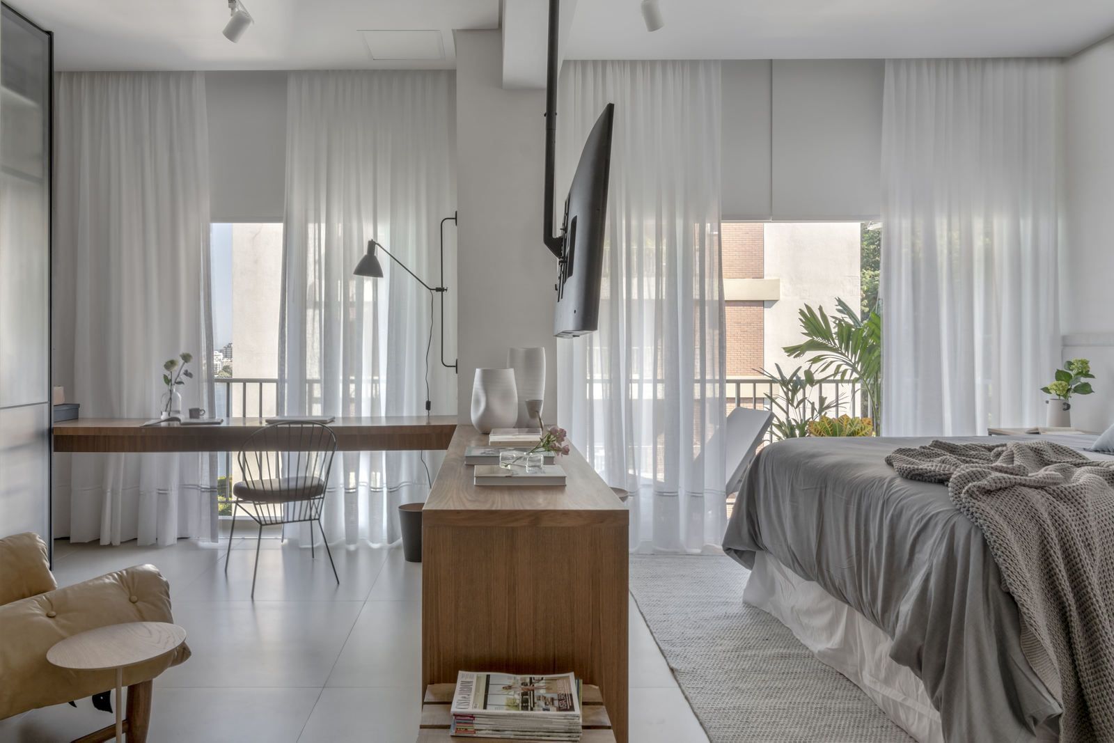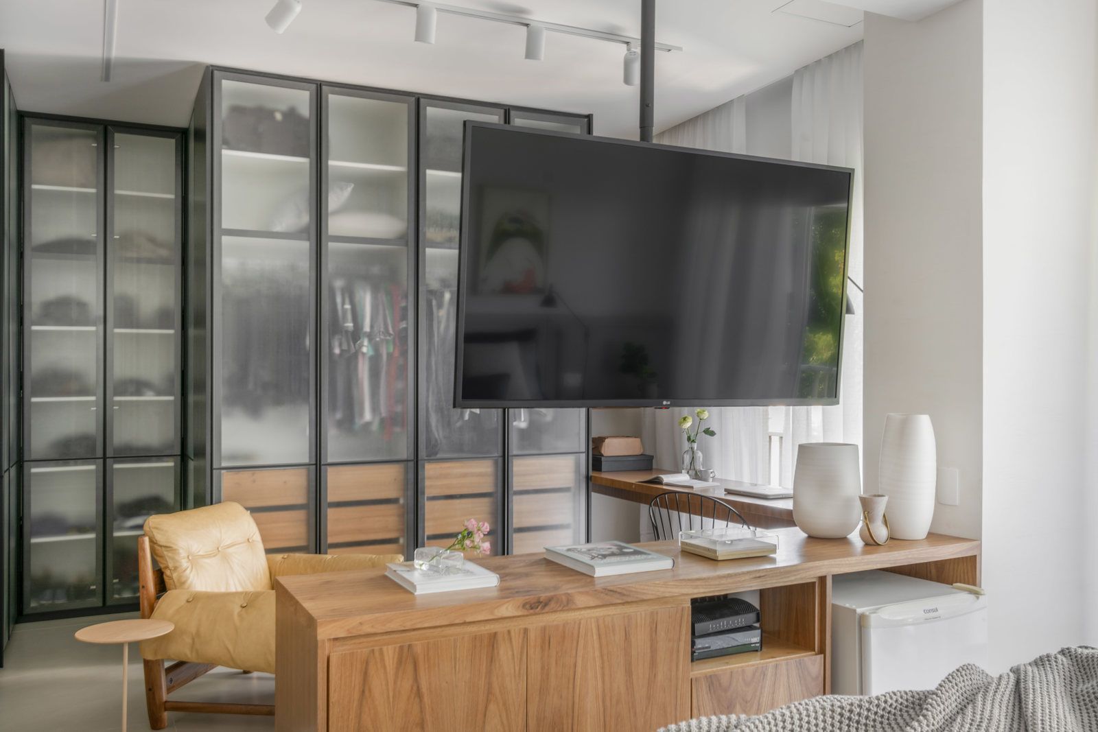 “Na copa, o banco em ‘L’ permitiu uma circulação mais fluida e otimizada. Além disso, o banco possui um gavetão no qual os clientes podem guardar seus sapatos. No quarto, a TV pode virar tanto para dentro quanto para o escritório, otimizando a utilização dos ambientes.”
