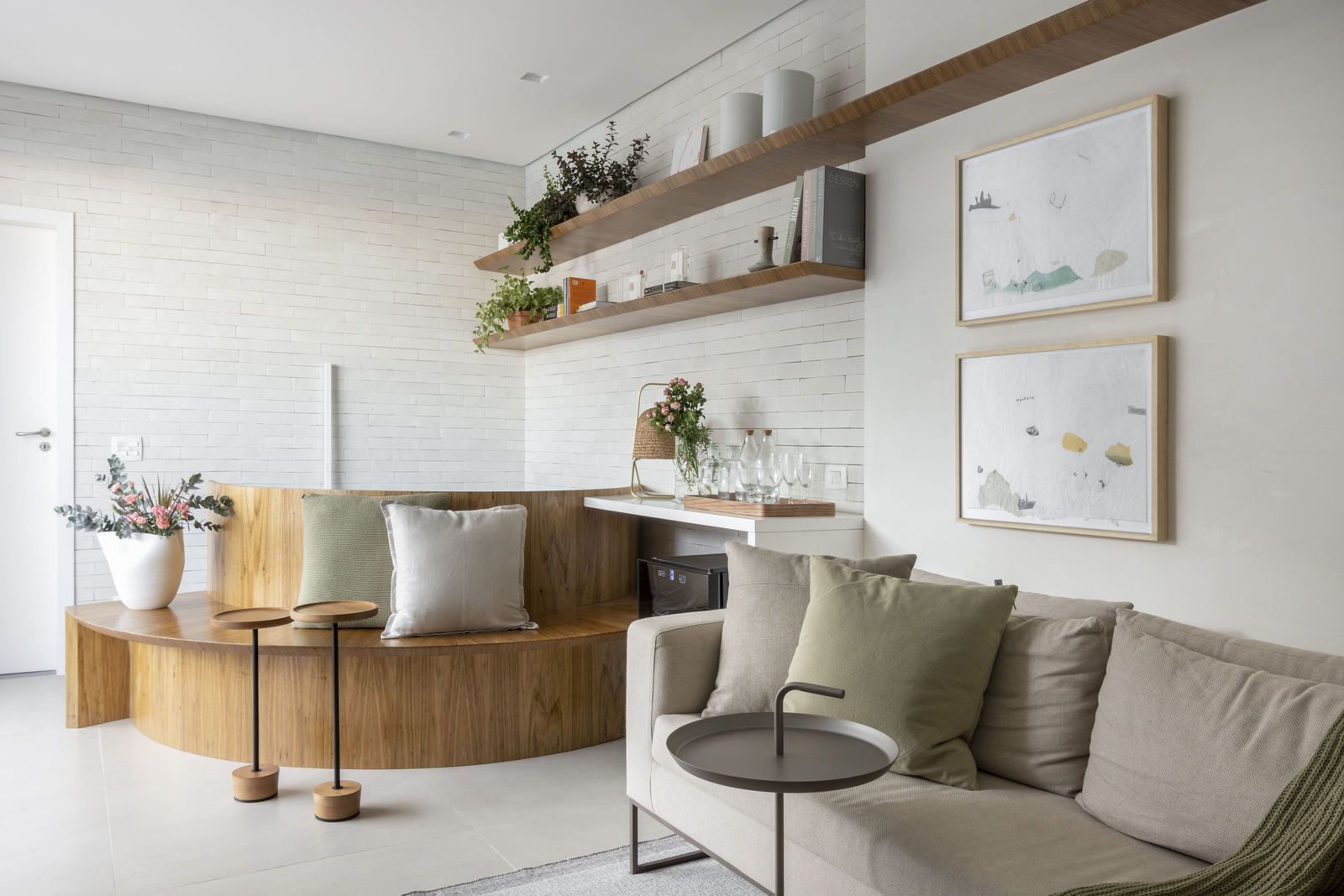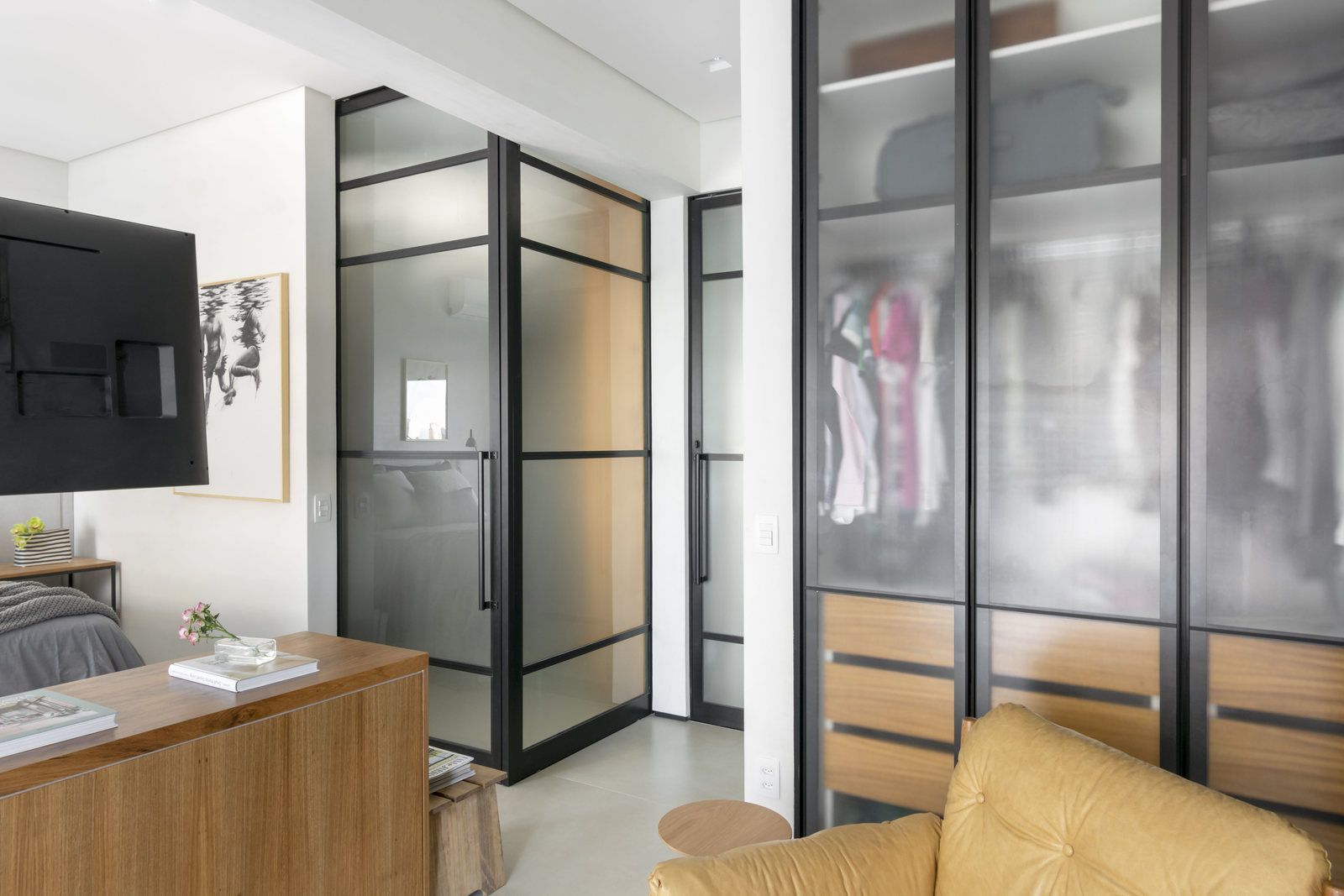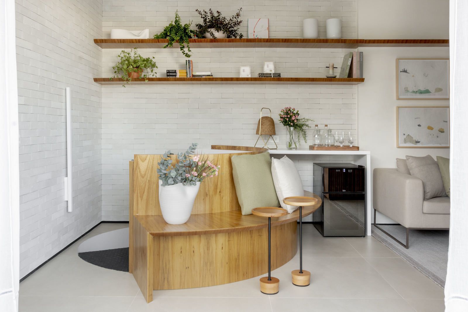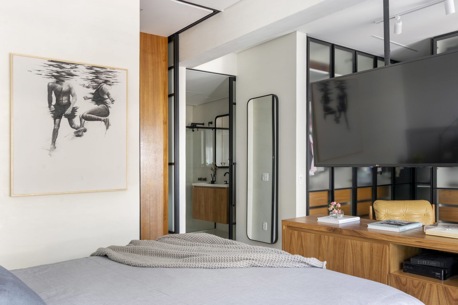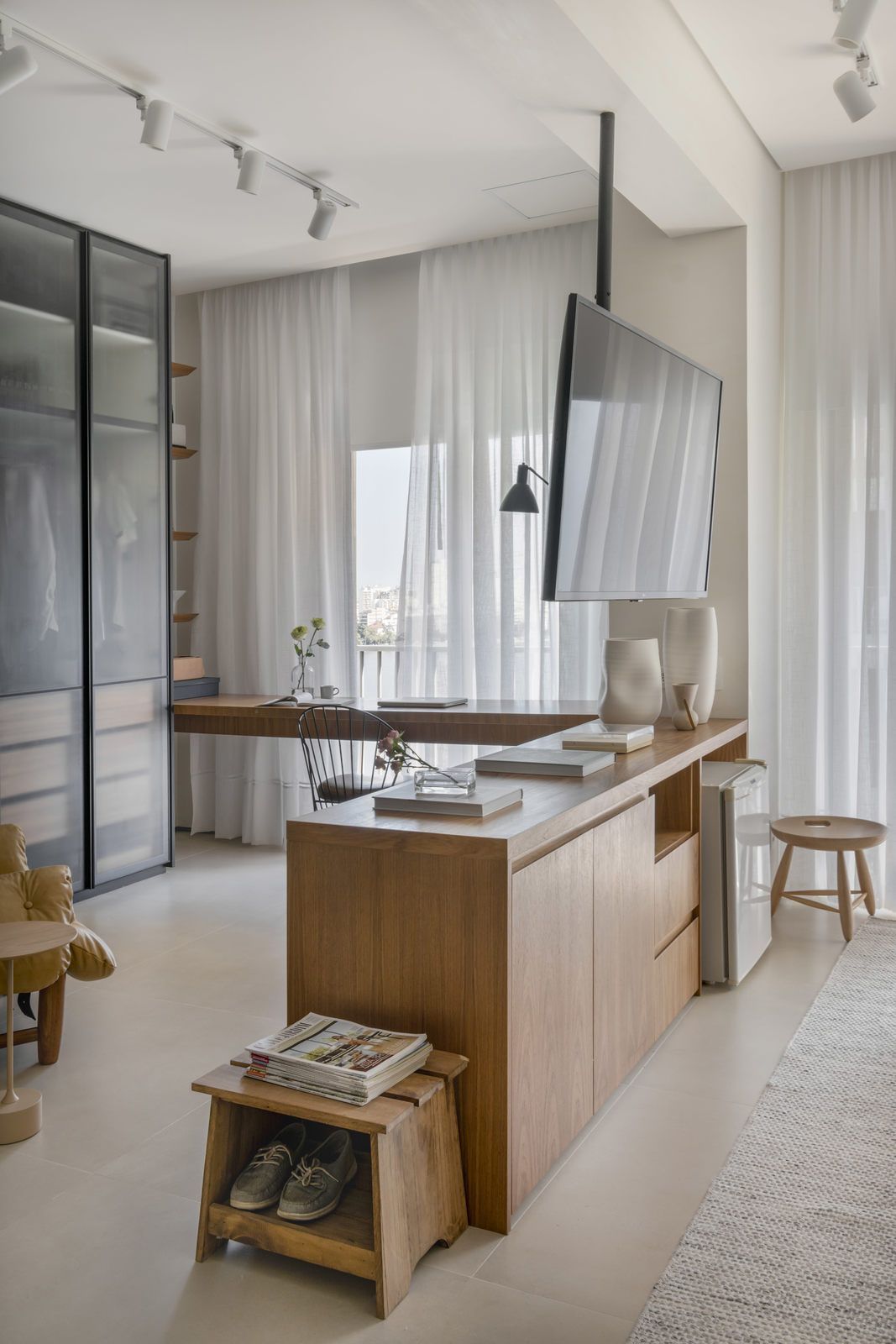 “Na copa, o banco em ‘L’ permitiu uma circulação mais fluida e otimizada. Além disso, o banco possui um gavetão no qual os clientes podem guardar seus sapatos. No quarto, a TV pode virar tanto para dentro quanto para o escritório, otimizando a utilização dos ambientes.”