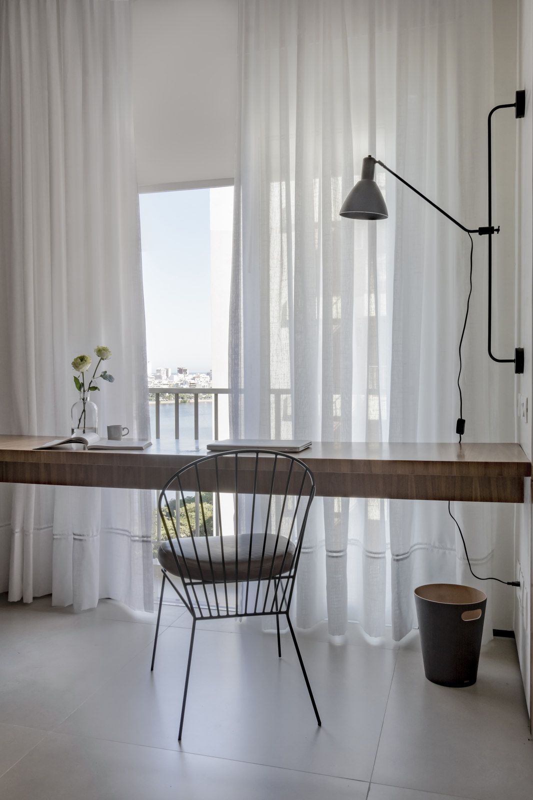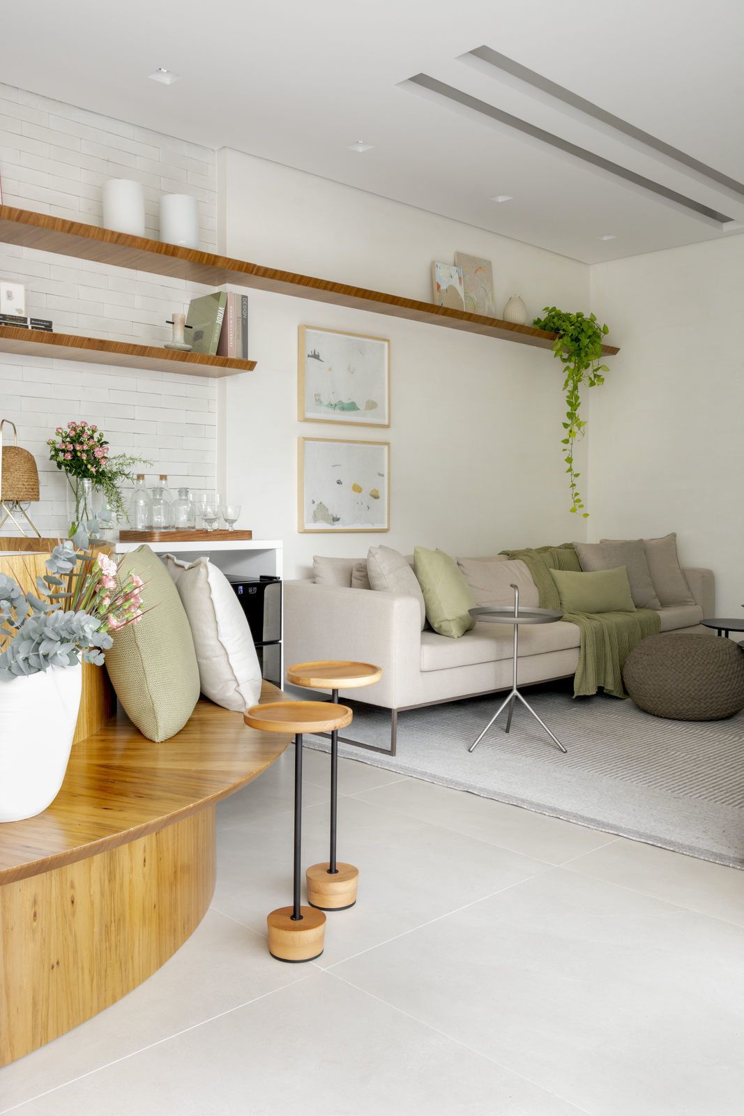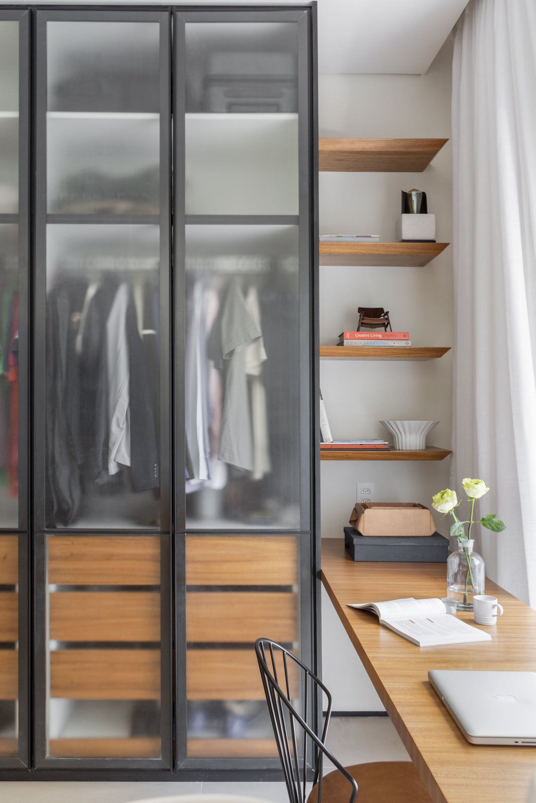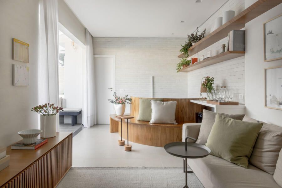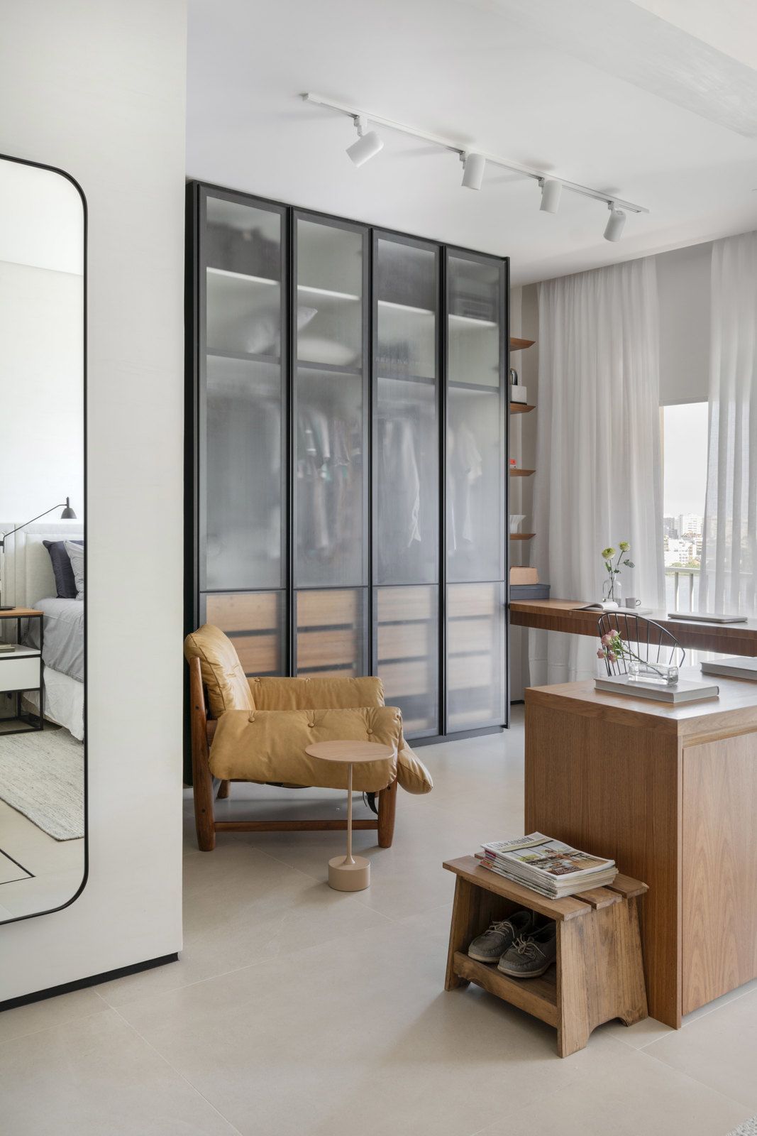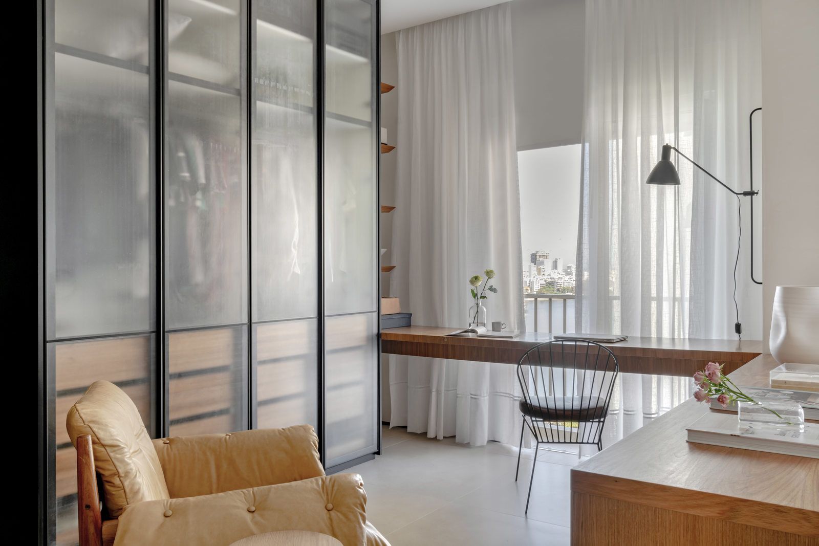“Na copa, o banco em ‘L’ permitiu uma circulação mais fluida e otimizada. Além disso, o banco possui um gavetão no qual os clientes podem guardar seus sapatos. No quarto, a TV pode virar tanto para dentro quanto para o escritório, otimizando a utilização dos ambientes.”
