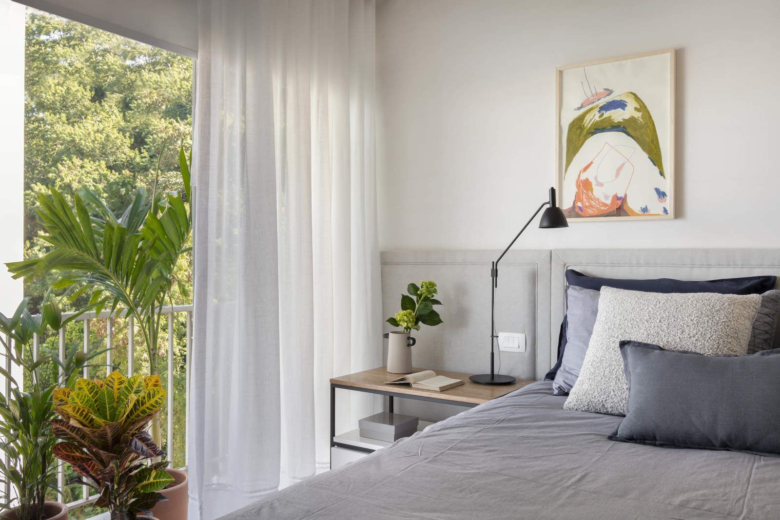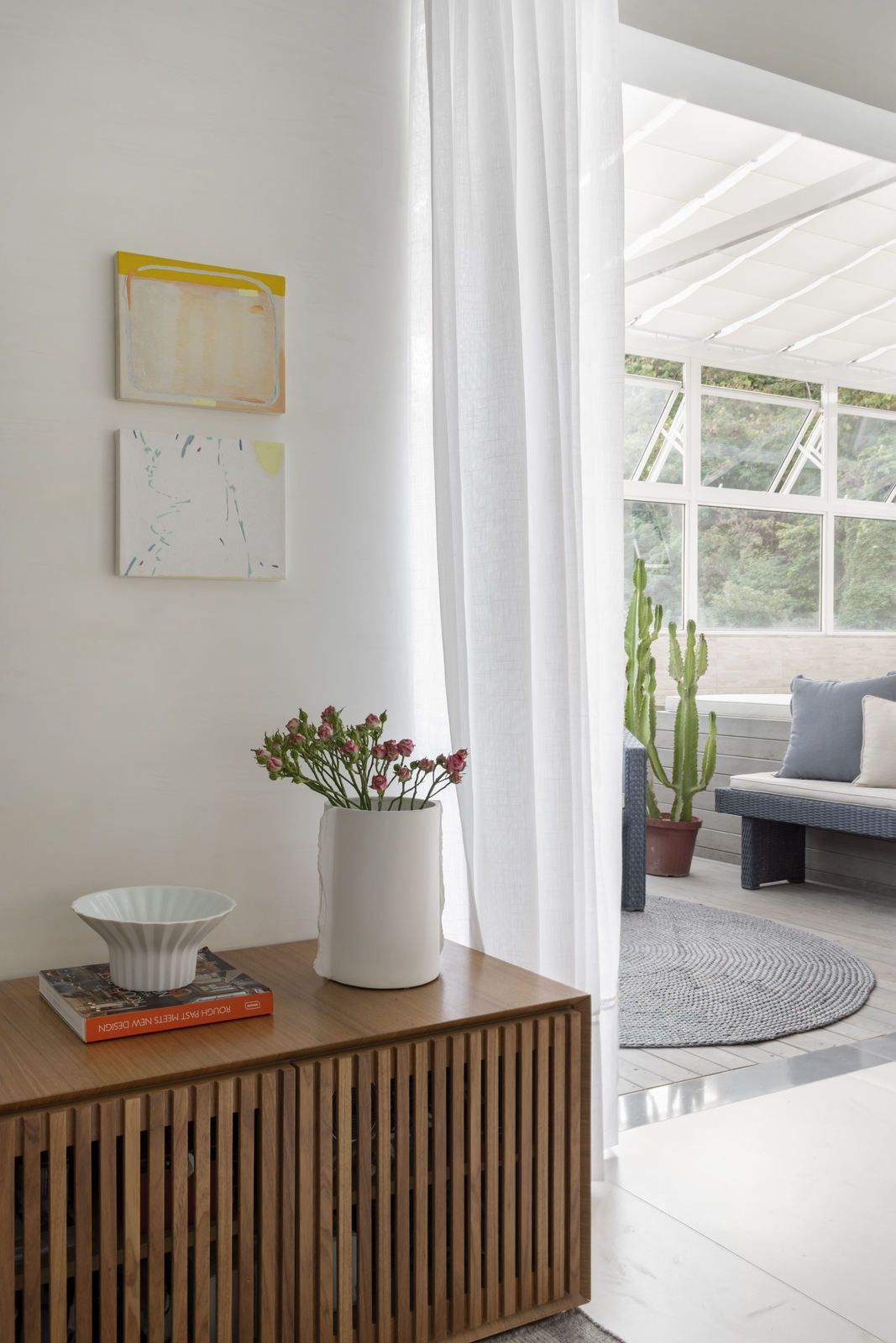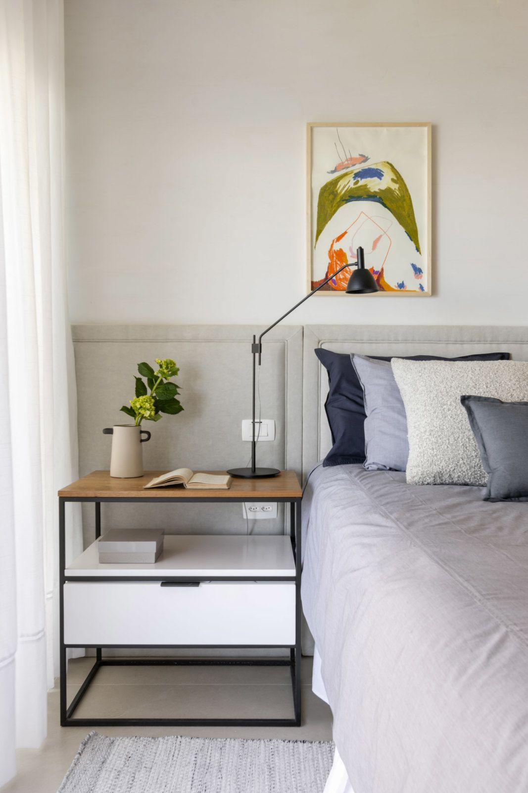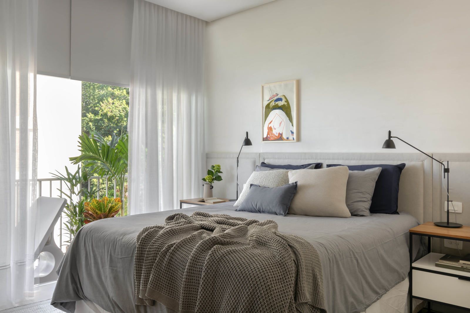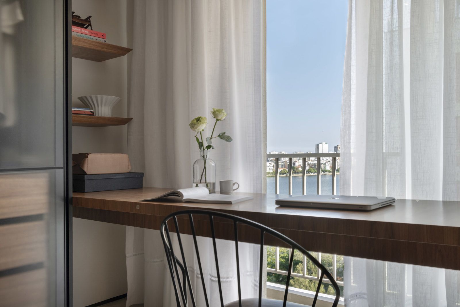 “Na copa, o banco em ‘L’ permitiu uma circulação mais fluida e otimizada. Além disso, o banco possui um gavetão no qual os clientes podem guardar seus sapatos. No quarto, a TV pode virar tanto para dentro quanto para o escritório, otimizando a utilização dos ambientes.”