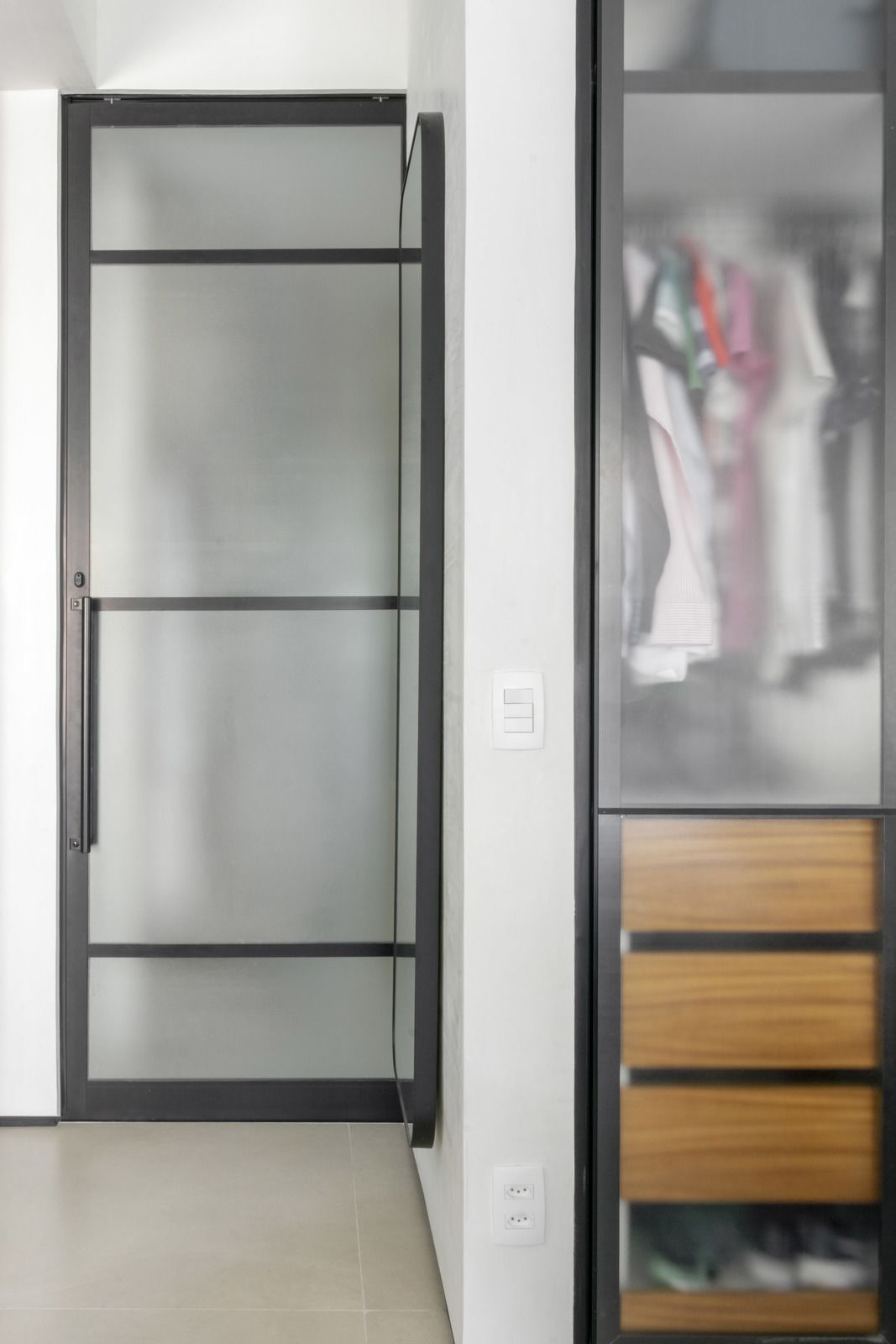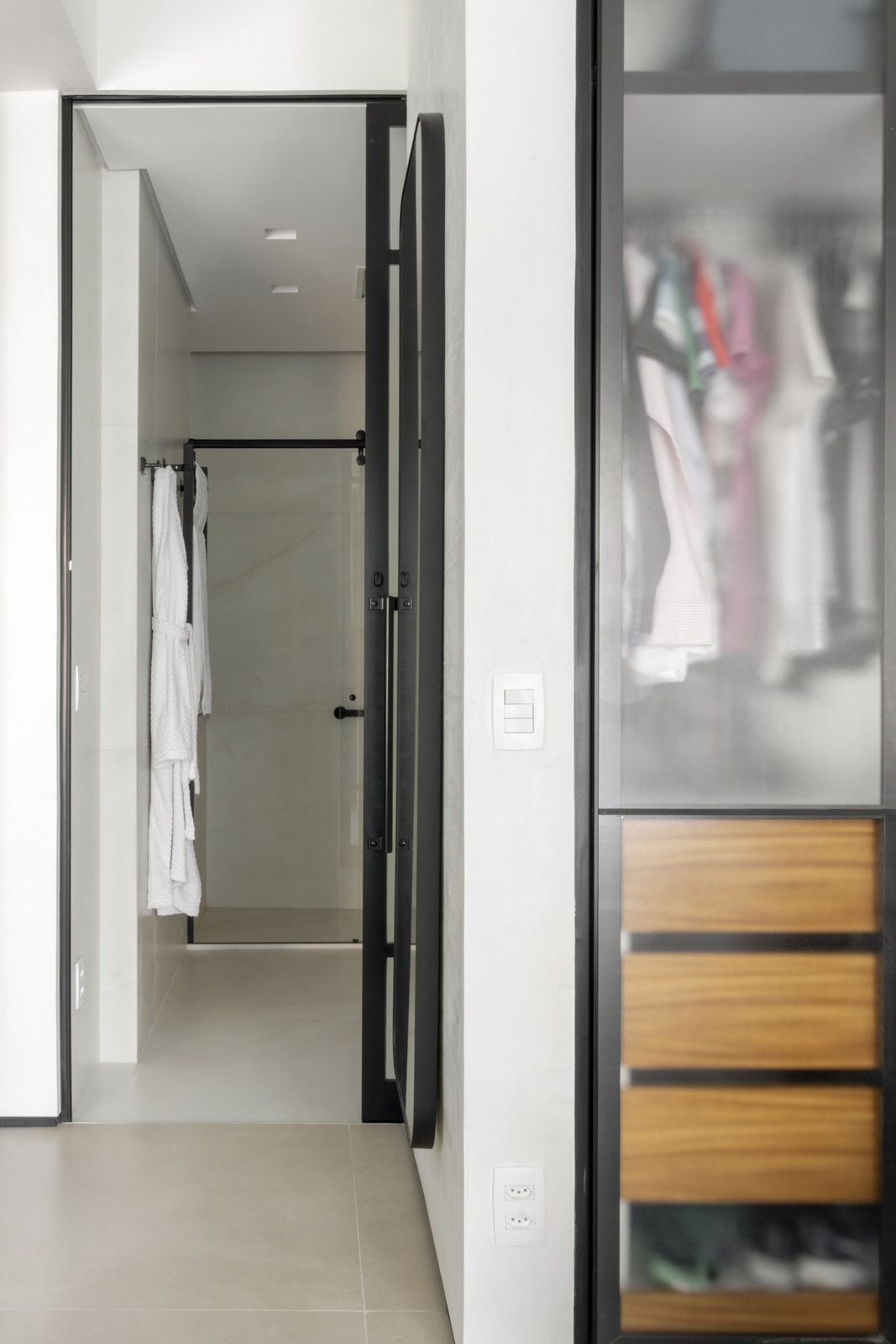 “Eles queriam um apartamento com ambientes integrados, uma pegada clean e ao mesmo tempo meio industrial. Além disso, os clientes nos pediram um banheiro grande, pois o anterior era muito pequeno. Por isso, incorporamos o lavabo e fizemos um banheiro maior e com cara de hotel.”