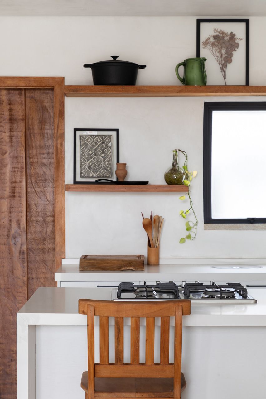 “Optamos por fazer os nichos da estante com formas orgânicas para abrigar os objetos garimpados pelo próprio morador, como vasos cerâmicos e peças antigas, e reforçar a rusticidade.”