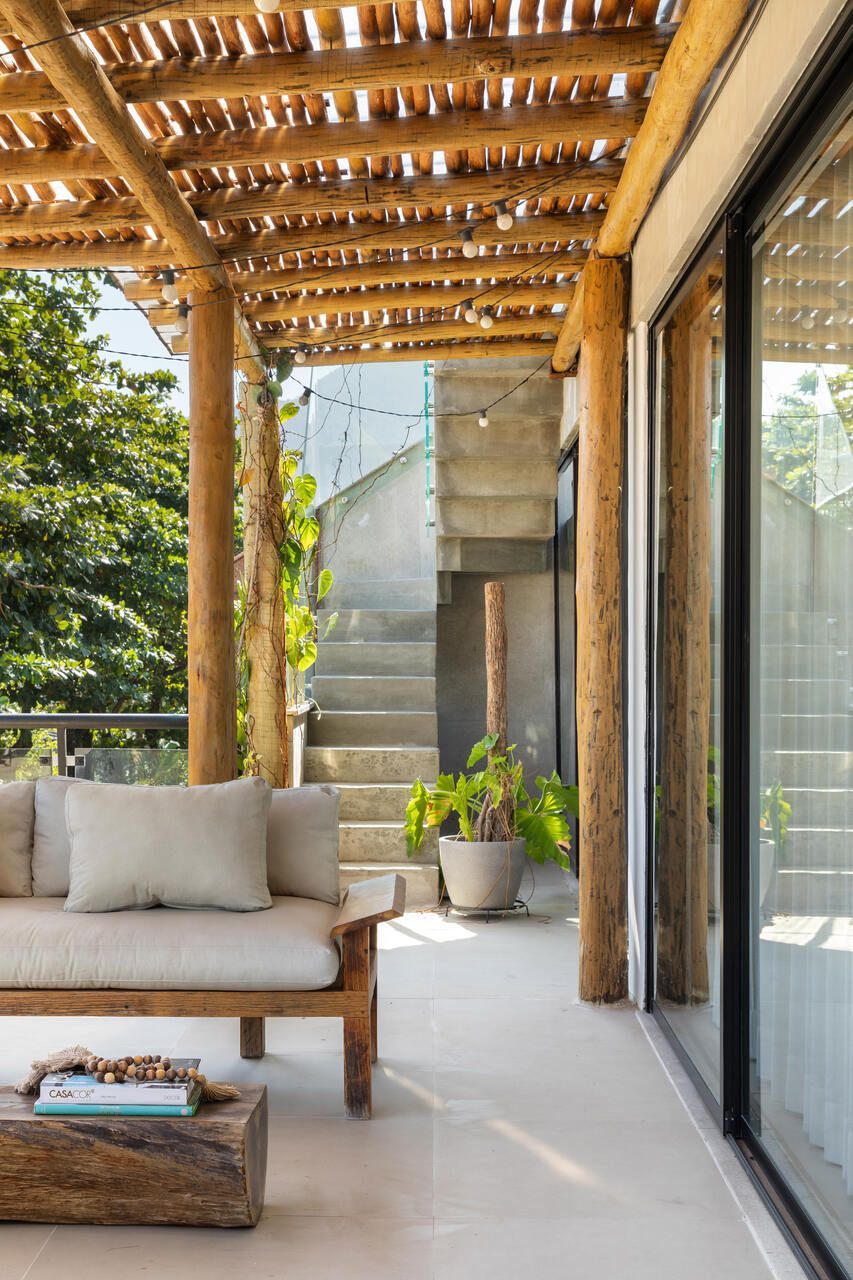 O layout da cobertura agora conta, no primeiro piso, com sala de estar, escritório, sala de jantar e cozinha integradas, área de serviço, suíte master com closet, e duas outras suítes, além de um terraço descoberto com pérgola. No segundo pavimento, o destaque é o spa de 30m² com chuveiro instalado em tronco de eucalipto, sofá de alvenaria e jardineiras curvas com cactos.