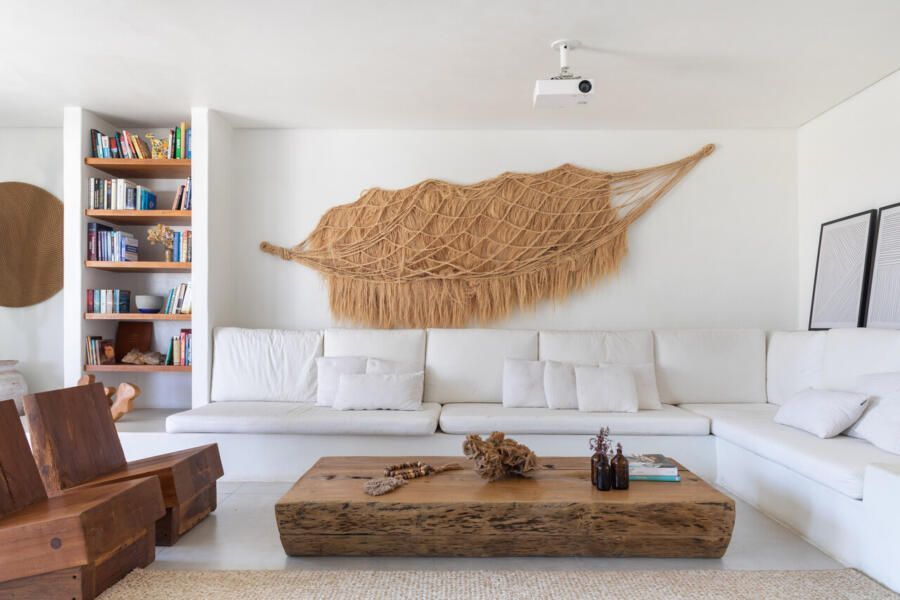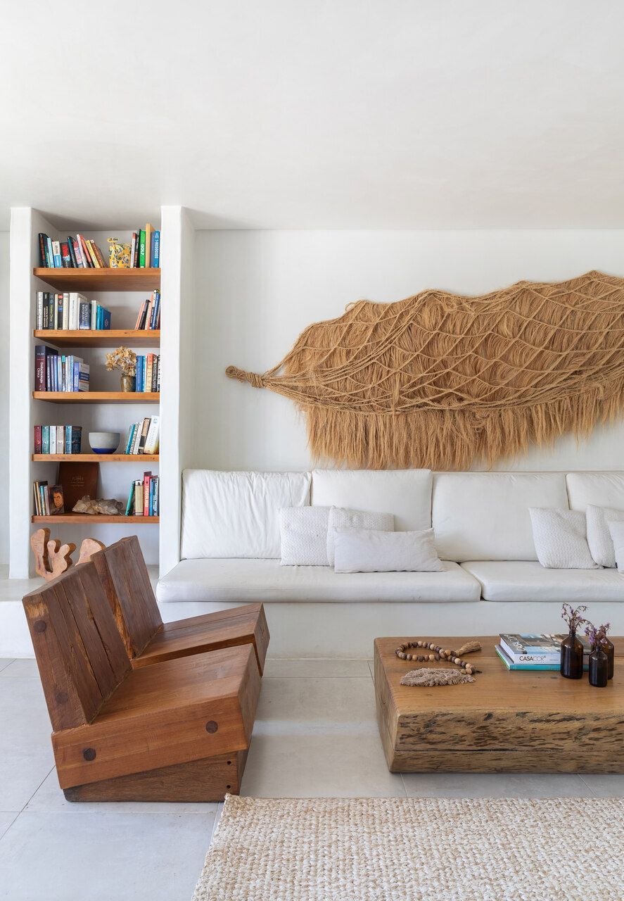 Para atender ao pedido e chegar no estilo mediterrâneo, o arquiteto apostou em tons claros e neutros para a paleta, como o piso em porcelanato em tom de areia, dando destaque aos móveis de madeira maciça e elementos em fibras naturais, como a rede de sisal exposta como obra de arte na sala de estar.