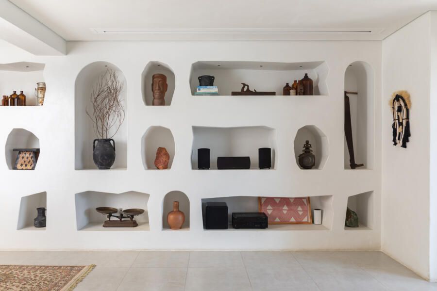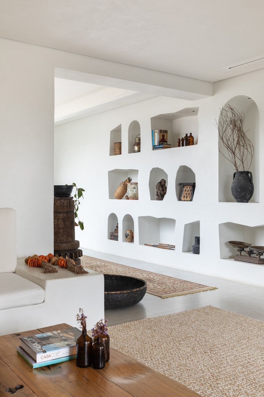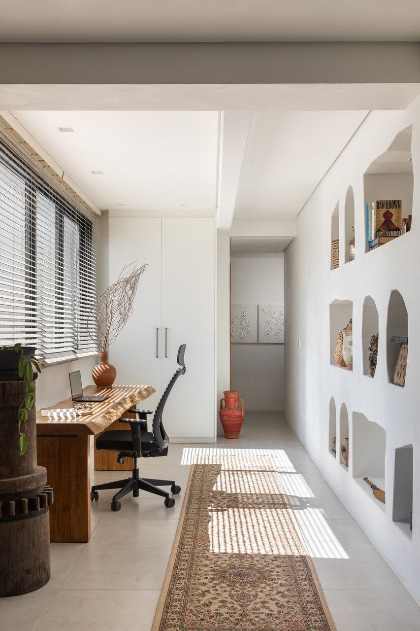 “Optamos por fazer os nichos da estante com formas orgânicas para abrigar os objetos garimpados pelo próprio morador, como vasos cerâmicos e peças antigas, e reforçar a rusticidade.”