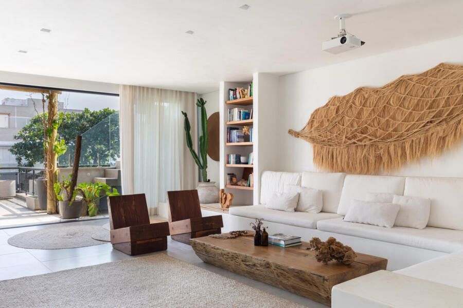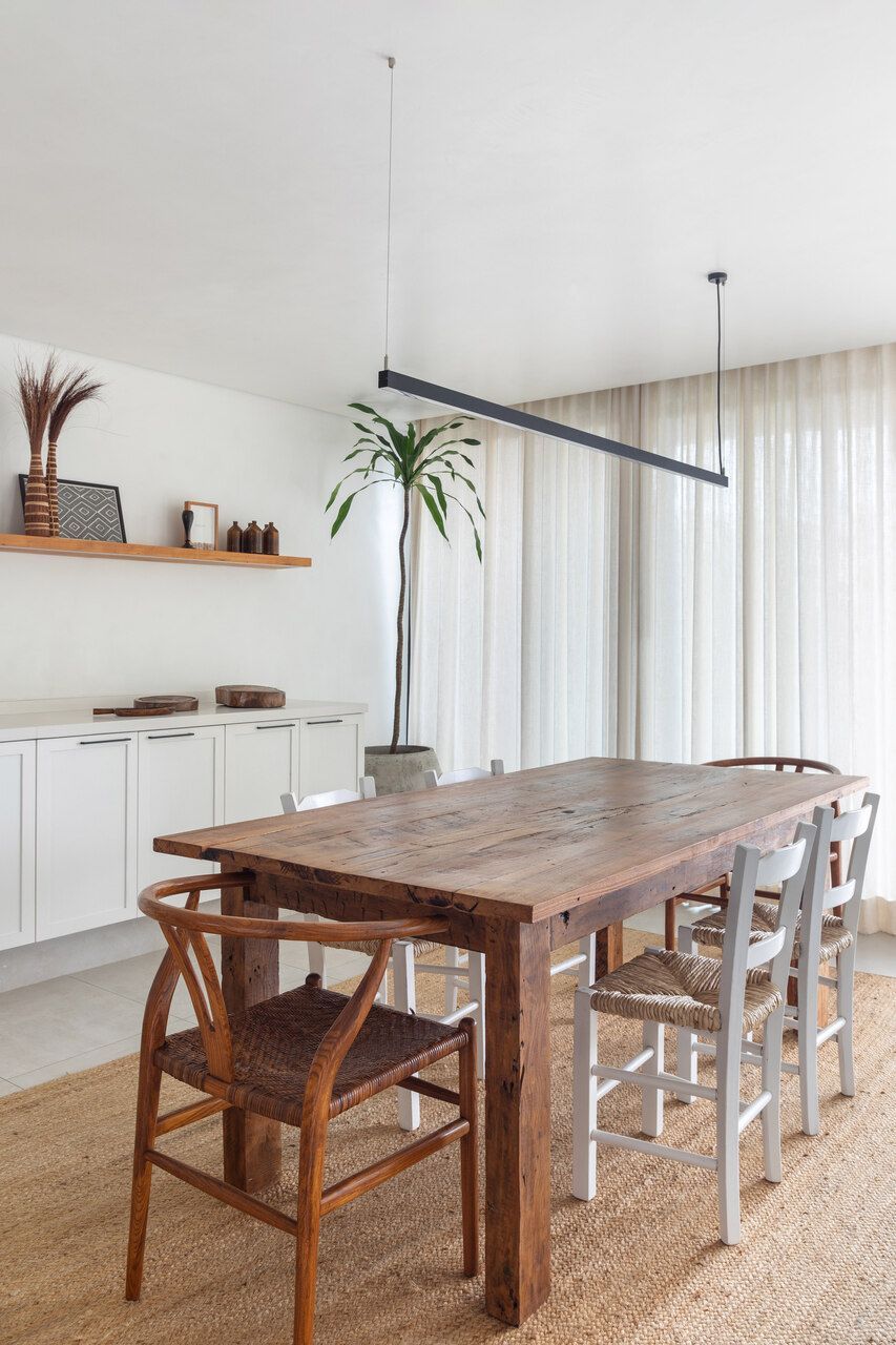 Para atender ao pedido e chegar no estilo mediterrâneo, o arquiteto apostou em tons claros e neutros para a paleta, como o piso em porcelanato em tom de areia, dando destaque aos móveis de madeira maciça e elementos em fibras naturais, como a rede de sisal exposta como obra de arte na sala de estar.