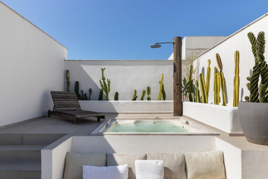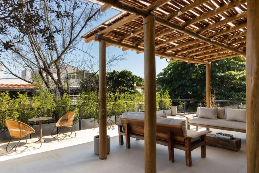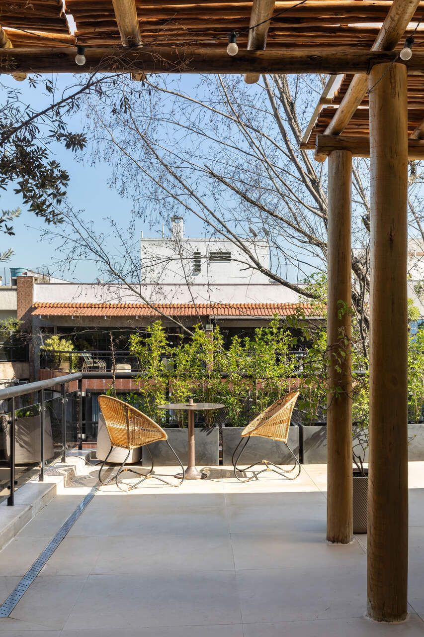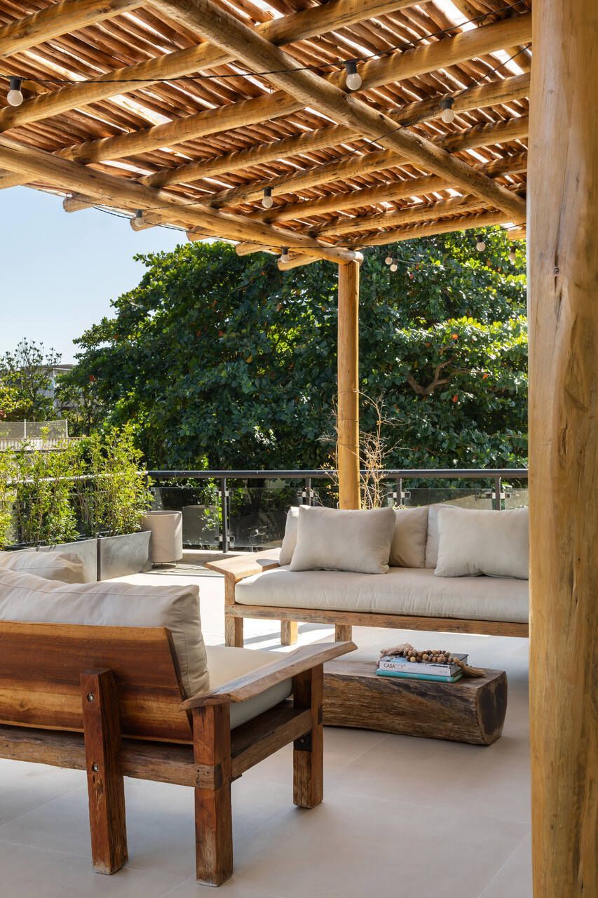 O layout da cobertura agora conta, no primeiro piso, com sala de estar, escritório, sala de jantar e cozinha integradas, área de serviço, suíte master com closet, e duas outras suítes, além de um terraço descoberto com pérgola. No segundo pavimento, o destaque é o spa de 30m² com chuveiro instalado em tronco de eucalipto, sofá de alvenaria e jardineiras curvas com cactos.
