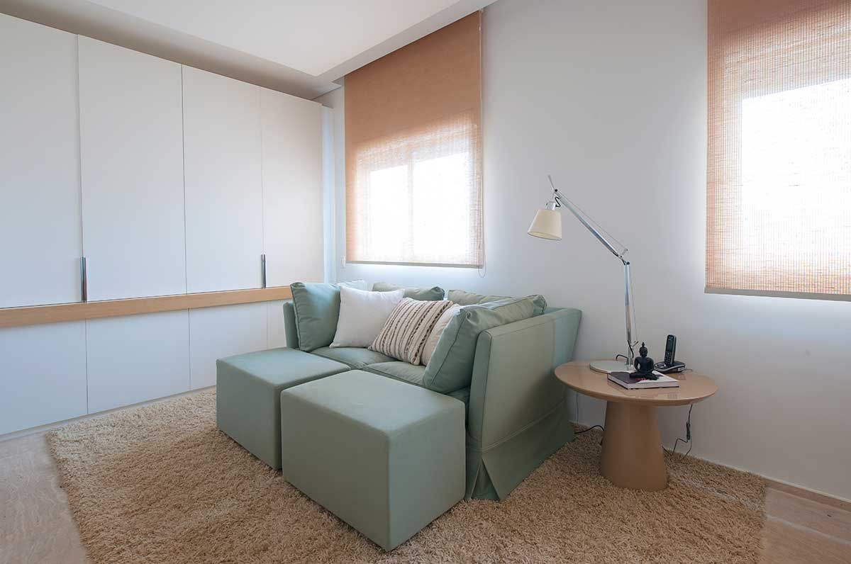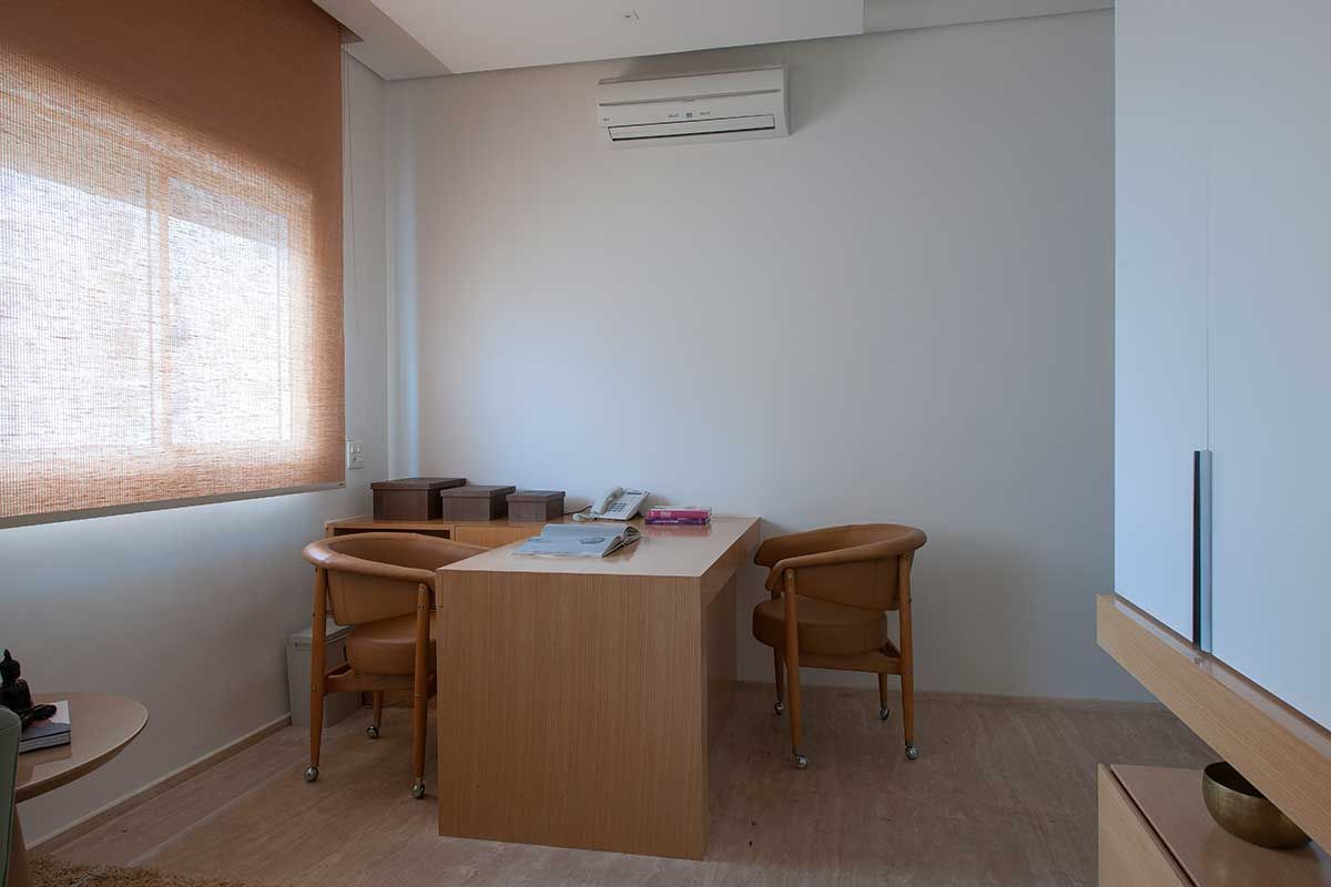 O atual Home Office antes da reforma era um dormitório, o espaço tem 12 m² e foi reformado para proporcionar conforto a área de trabalho. Toda a marcenaria foi desenhada pelo escritório e executada pela Cozitec.