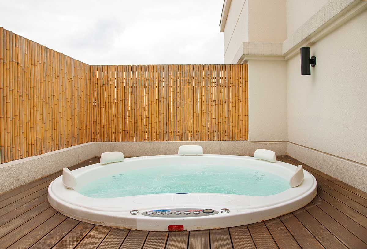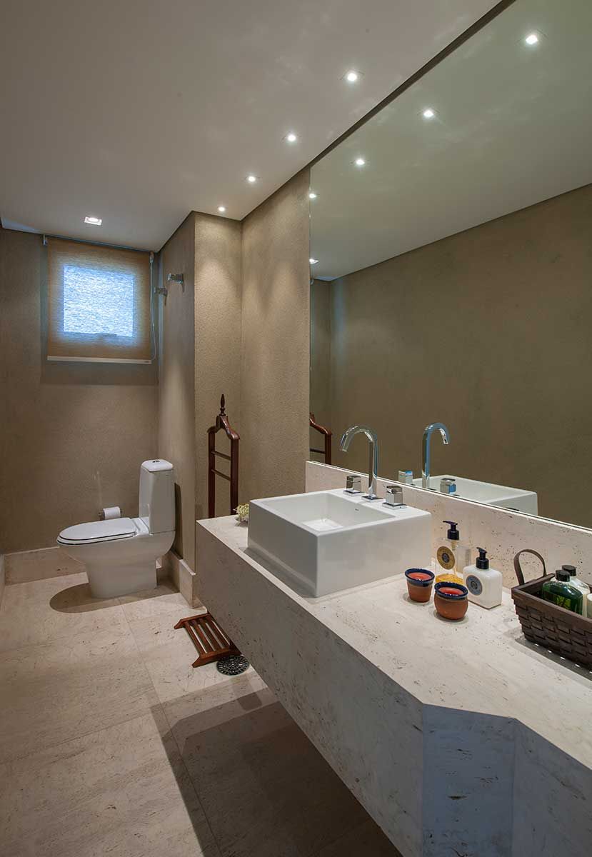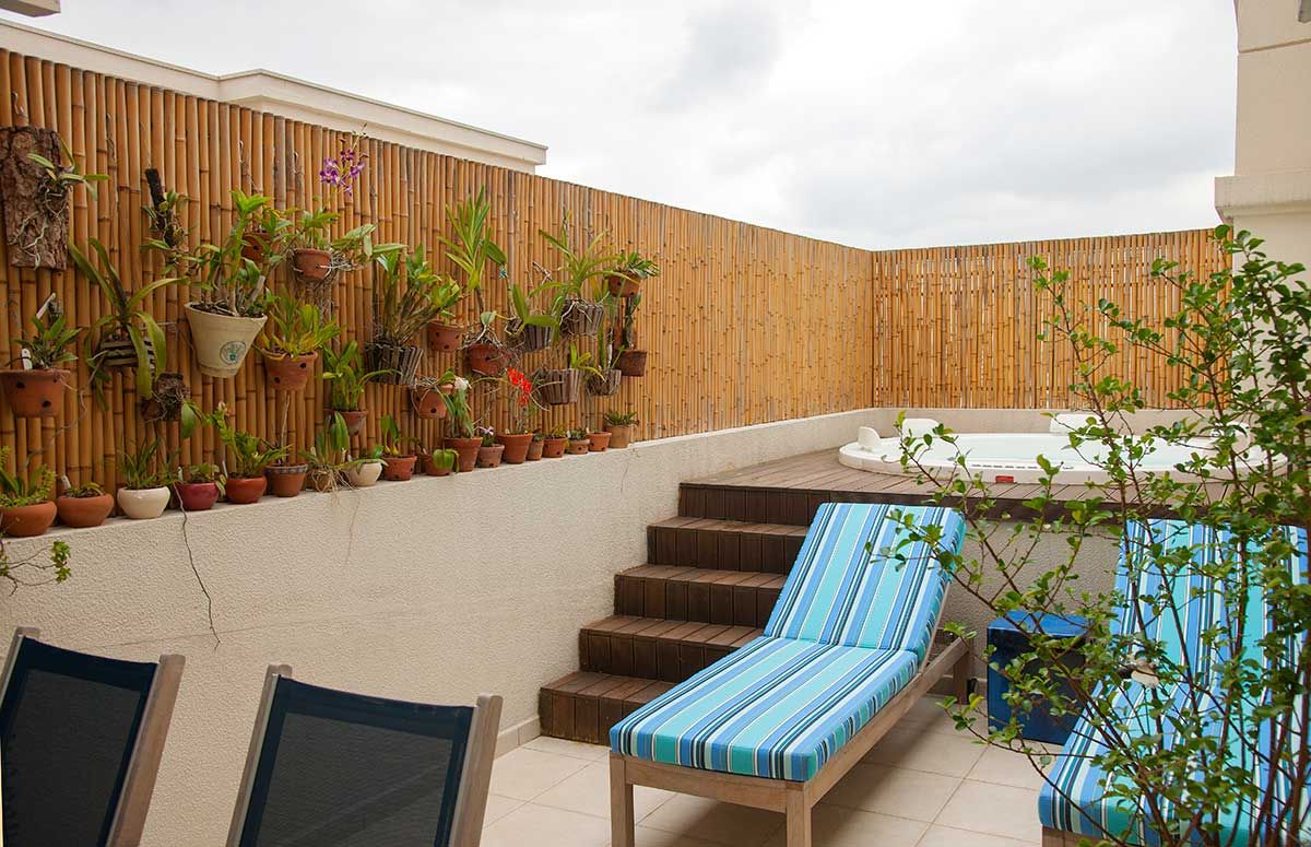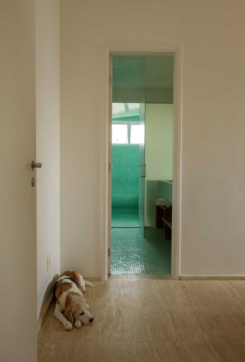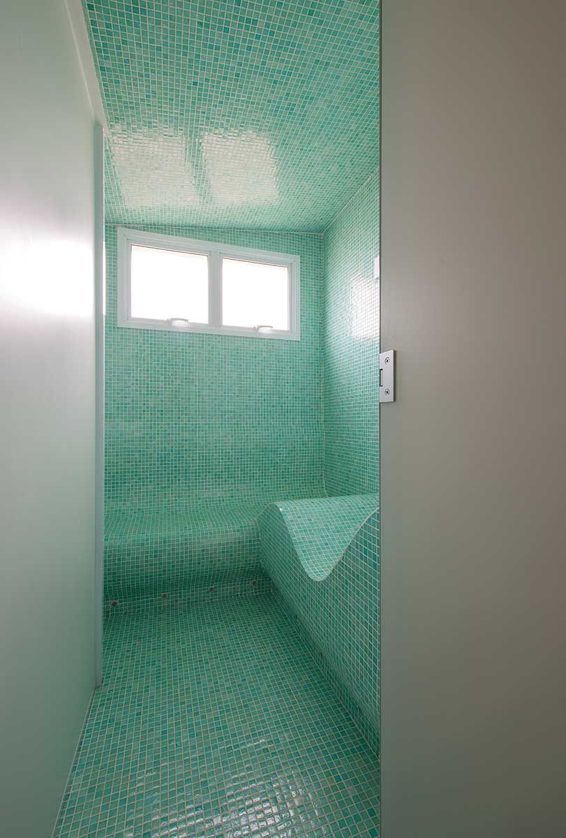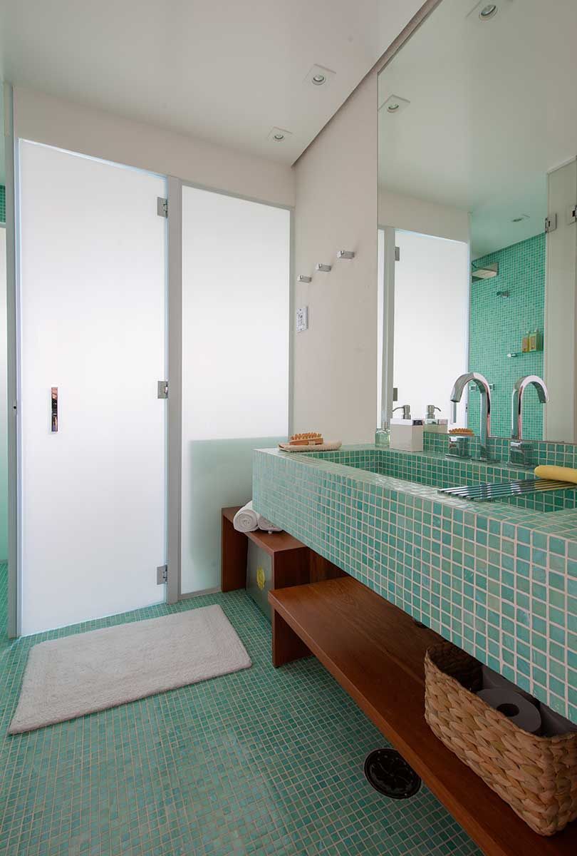 Antes da reforma a sauna era um banheiro, foi colocado pelo escritório pastilhas em todo o espaço e criada uma espreguiçadeira para dar mais conforto. O teto foi reformado, criando uma inclinação para não pingar.