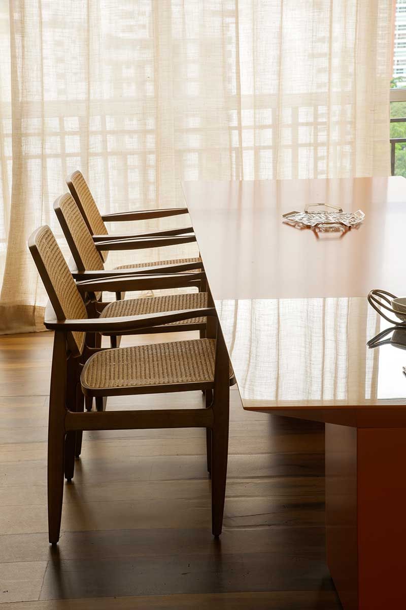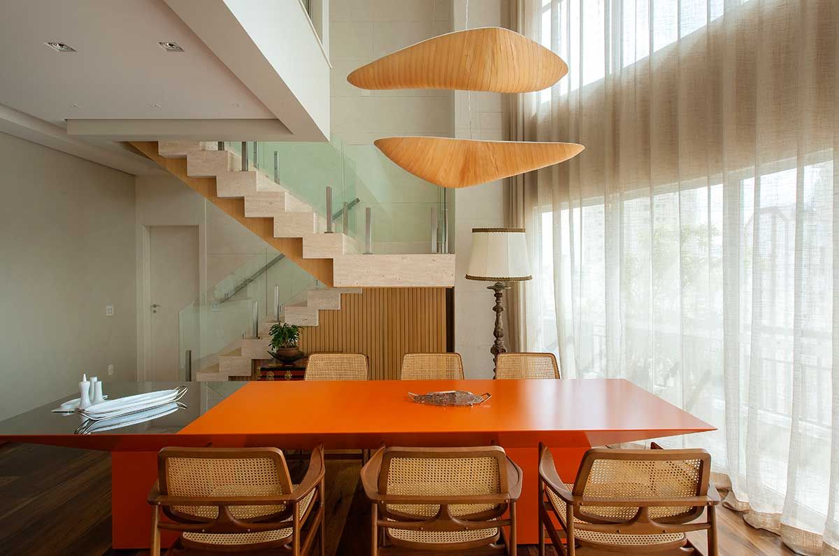 Para aproveitar o espaço embaixo da escada foi colocado um baú, que a cliente já possuía, e atrás criei um armário embutido. A cor laranja da mesa foi para dar um toque de cor e as palhas das cadeiras para proporcionar um ambiente confortável.