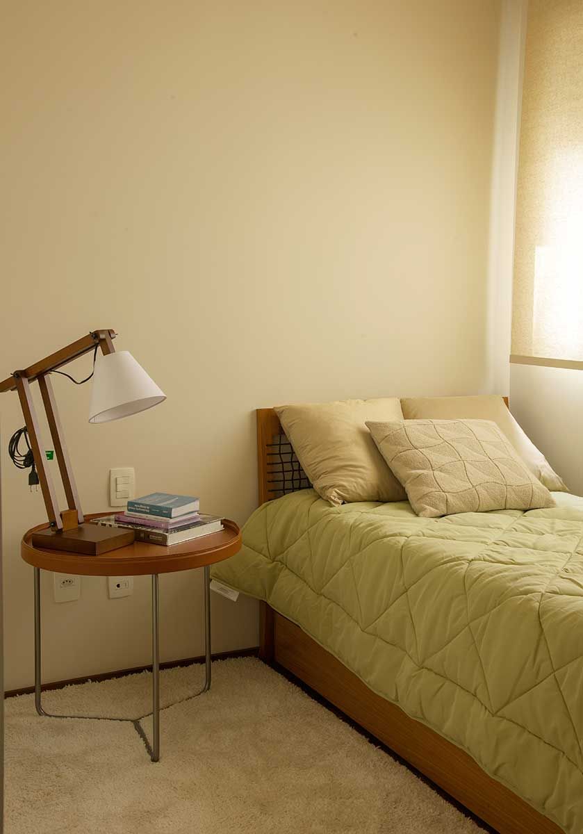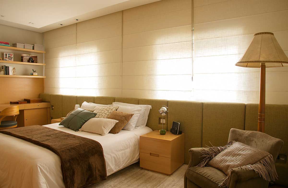O quarto do casal possui 24 m², a cabeceira foi toda revestida em tecido pela própria cliente. A poltrona já pertencia a ela e a almofada é da Beraldin.