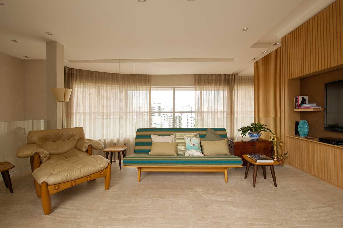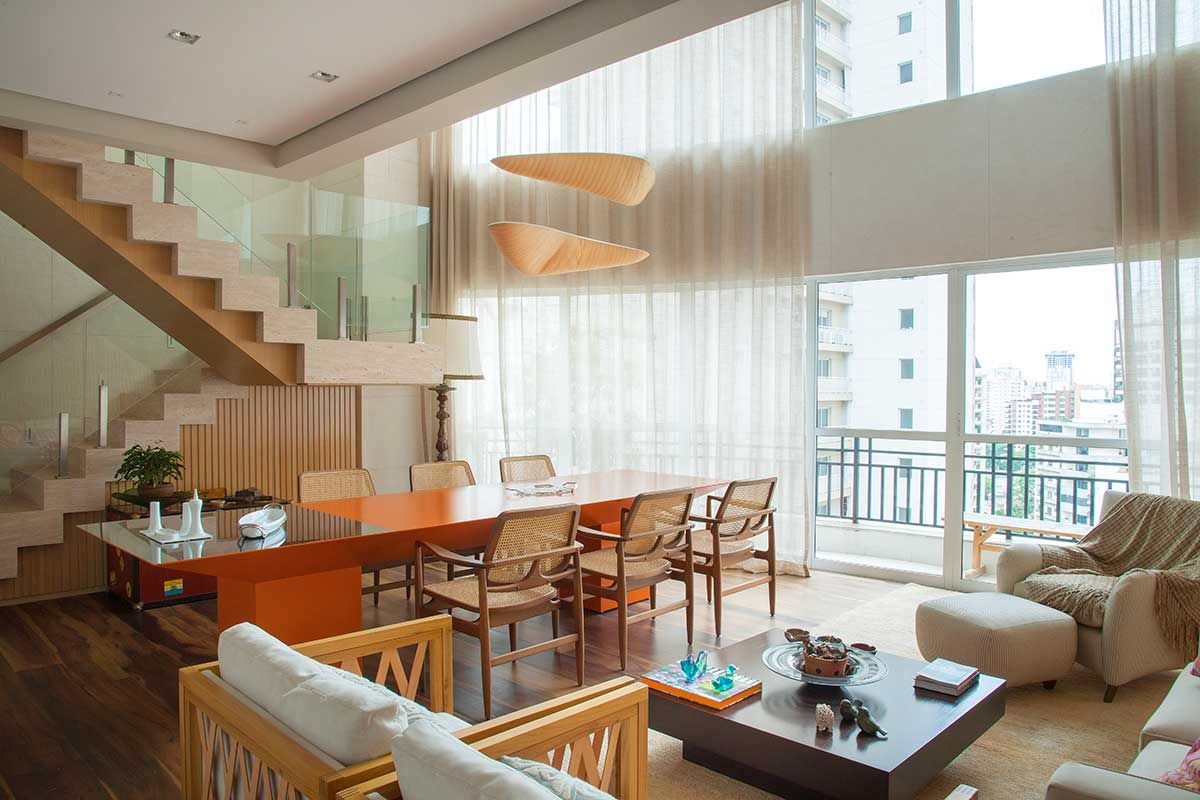 As ripas de madeira nas paredes da sala inferior, o carvalho americano e o piso em madeira canela na sala superior contrastam com o mármore aplicado na escada e garantem o visual moderno do ambiente.