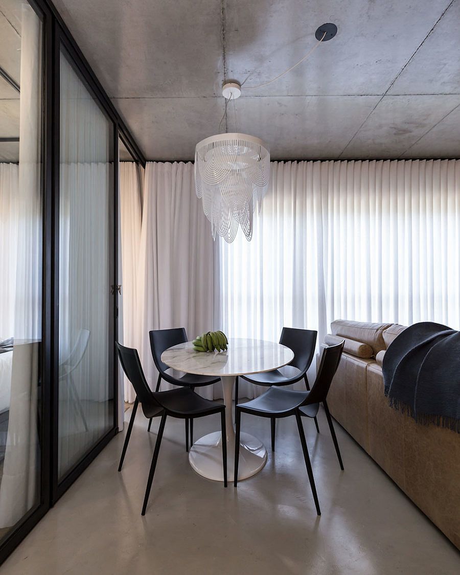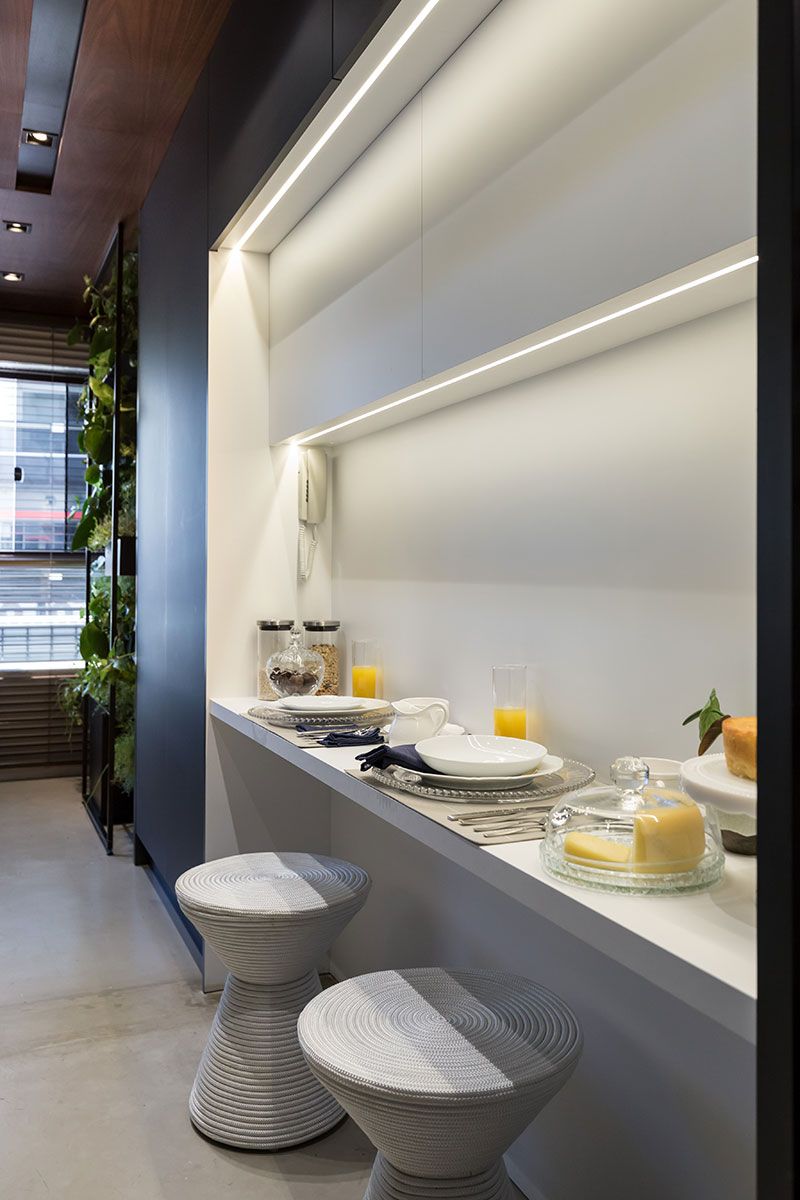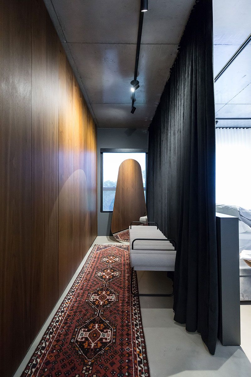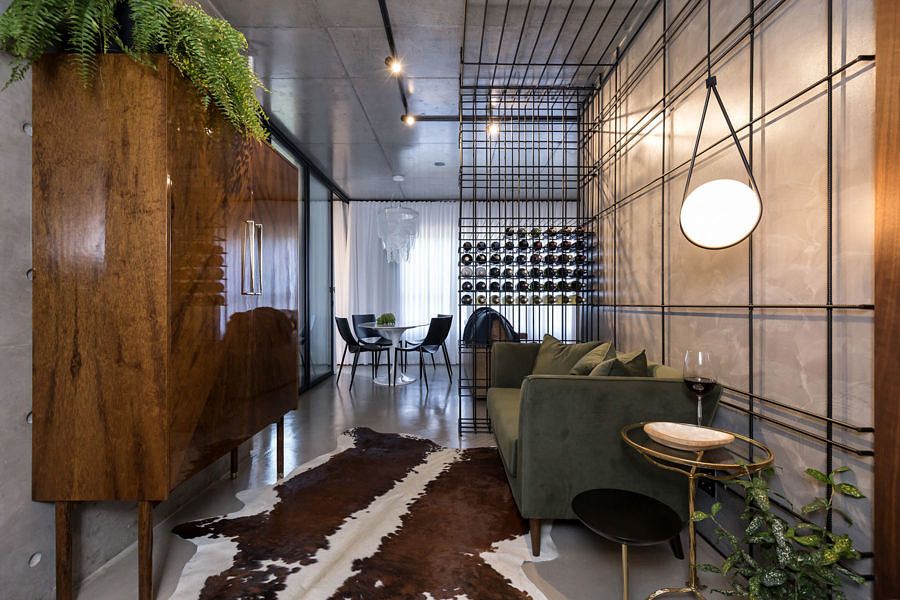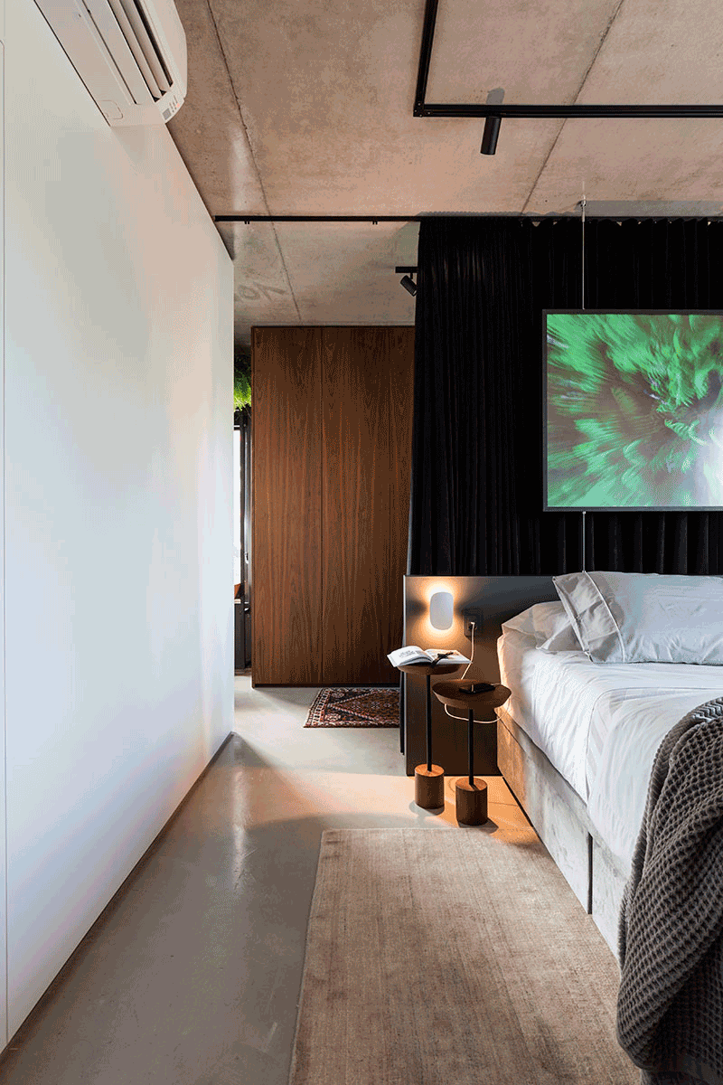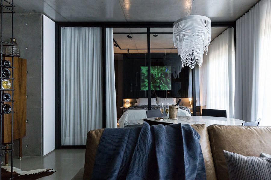 O maior desafio para o Estúdio VOE foi contemplar todo o programa de necessidades em 68m² e ao mesmo tempo delimitar os espaços sem criar uma barreira visual, pois o loft nasceu com a planta livre e a ideia era que ele continuasse assim. Para isso foram utilziados elementos como: esquadrias de aço e vidro, adega em vergalhões e cortinas brancas com transparências.
