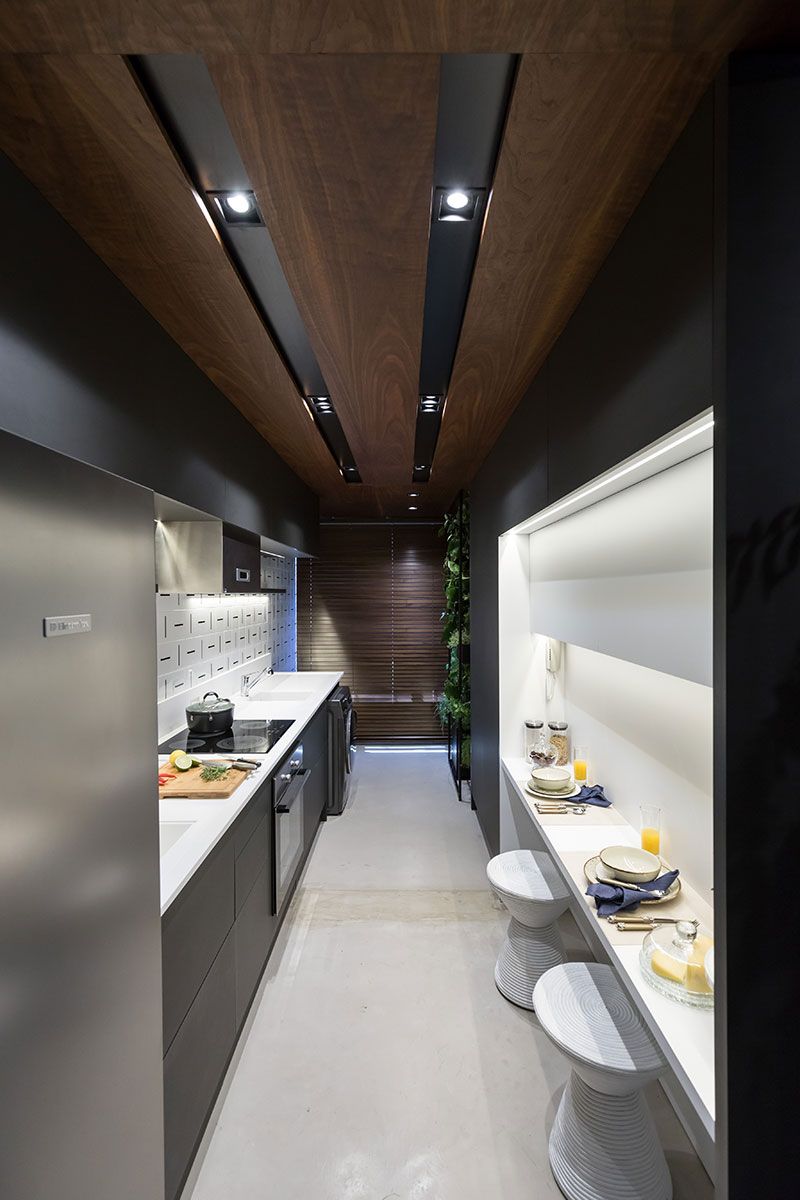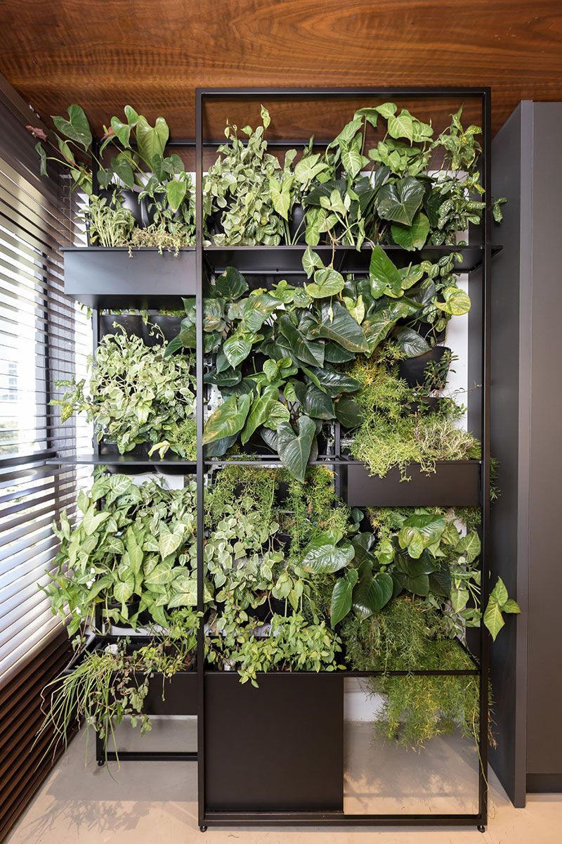 O casal adora cozinhar e receber amigos e o pedido foi a cozinha integrada com a natureza, o design biofílico resultou em um jardim vertical como elemento compositivo junto à horta do casal, numa integração harmoniosa e que renderá jantares deliciosos e momentos que ficarão na memória.