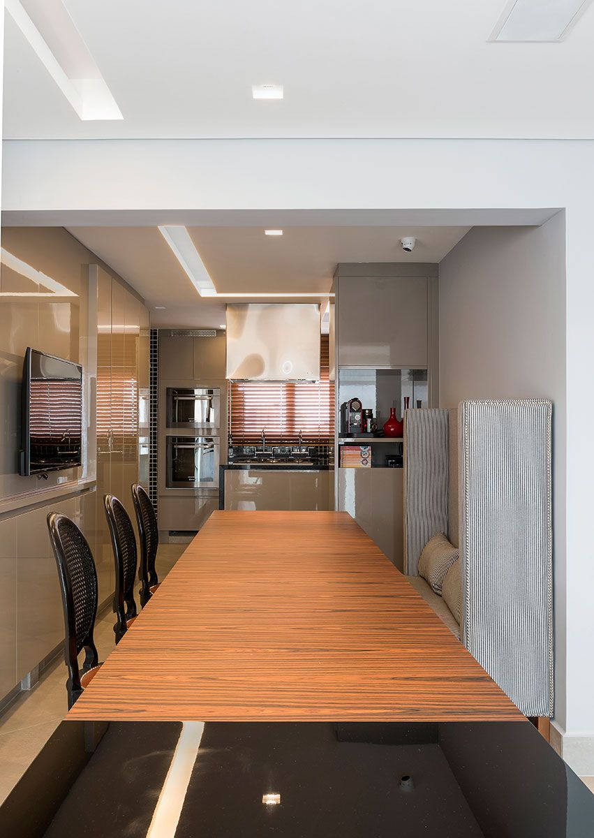 O casal jovem com duas filhas pequenas desejava um lar marcante, moderno, aconchegante e procuraram o escritório Maurício Karam Arquitetura. Um item de destaque no projeto para os profissionais é a mesa longa na área gourmet com sofá alto.