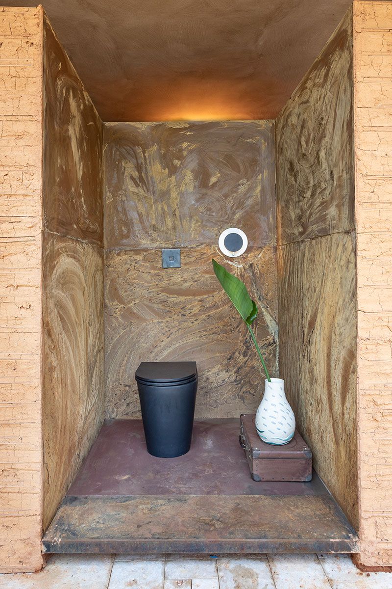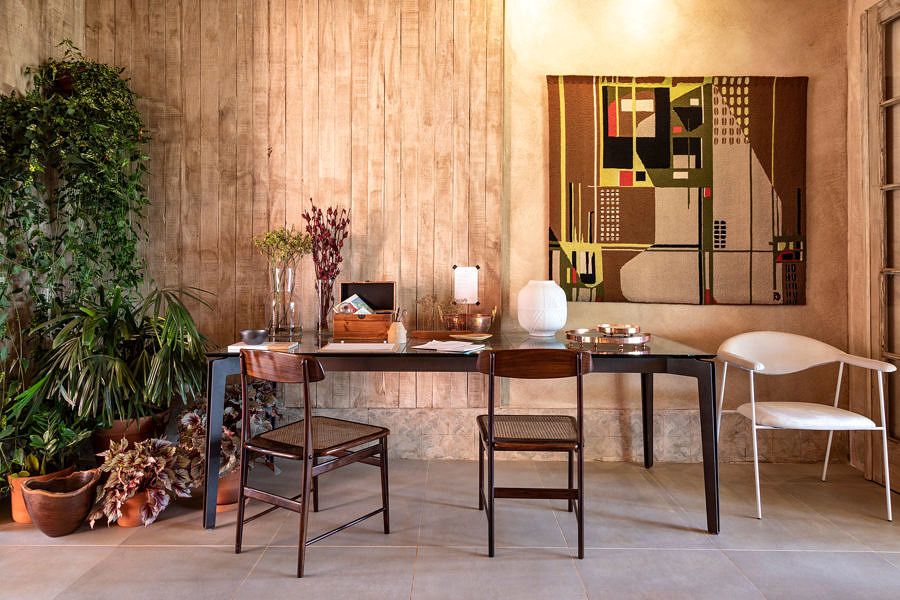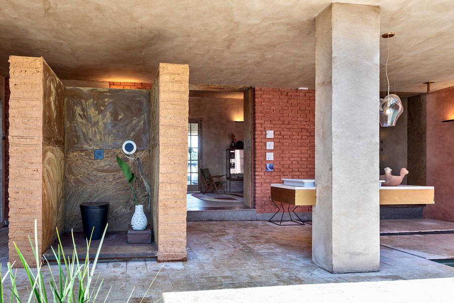 O projeto assinado pelo escritório Ana Helena Ferrari Arquitetura para uma mostra tem 90m² e foi enraizado no conceito wabi-sabi nos ideais zen-budistas, que enaltece a história da fazenda, que o espaço faria parte, e valoriza a beleza do existente, mesmo sendo muitas vezes imperfeito.
