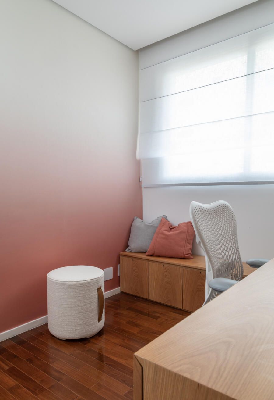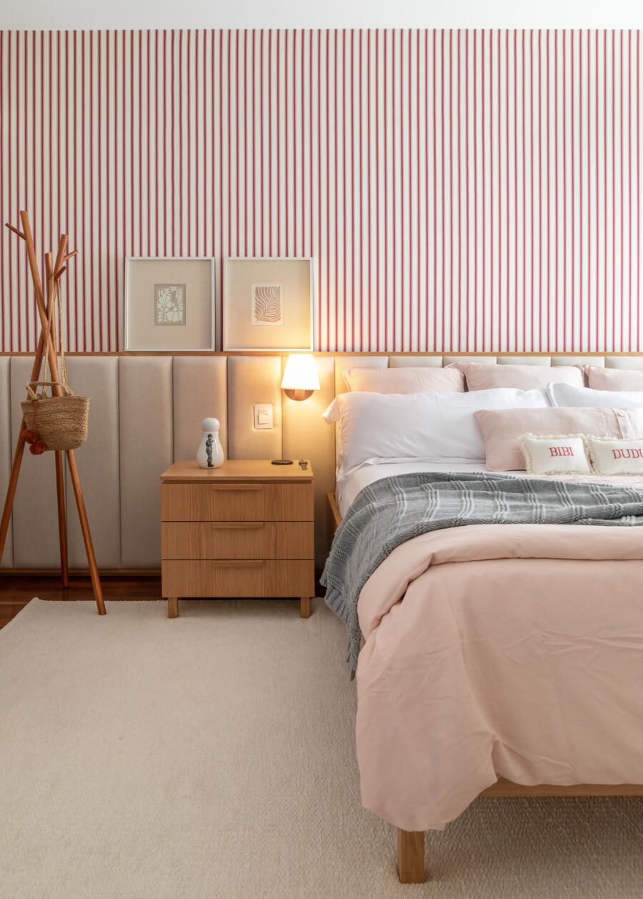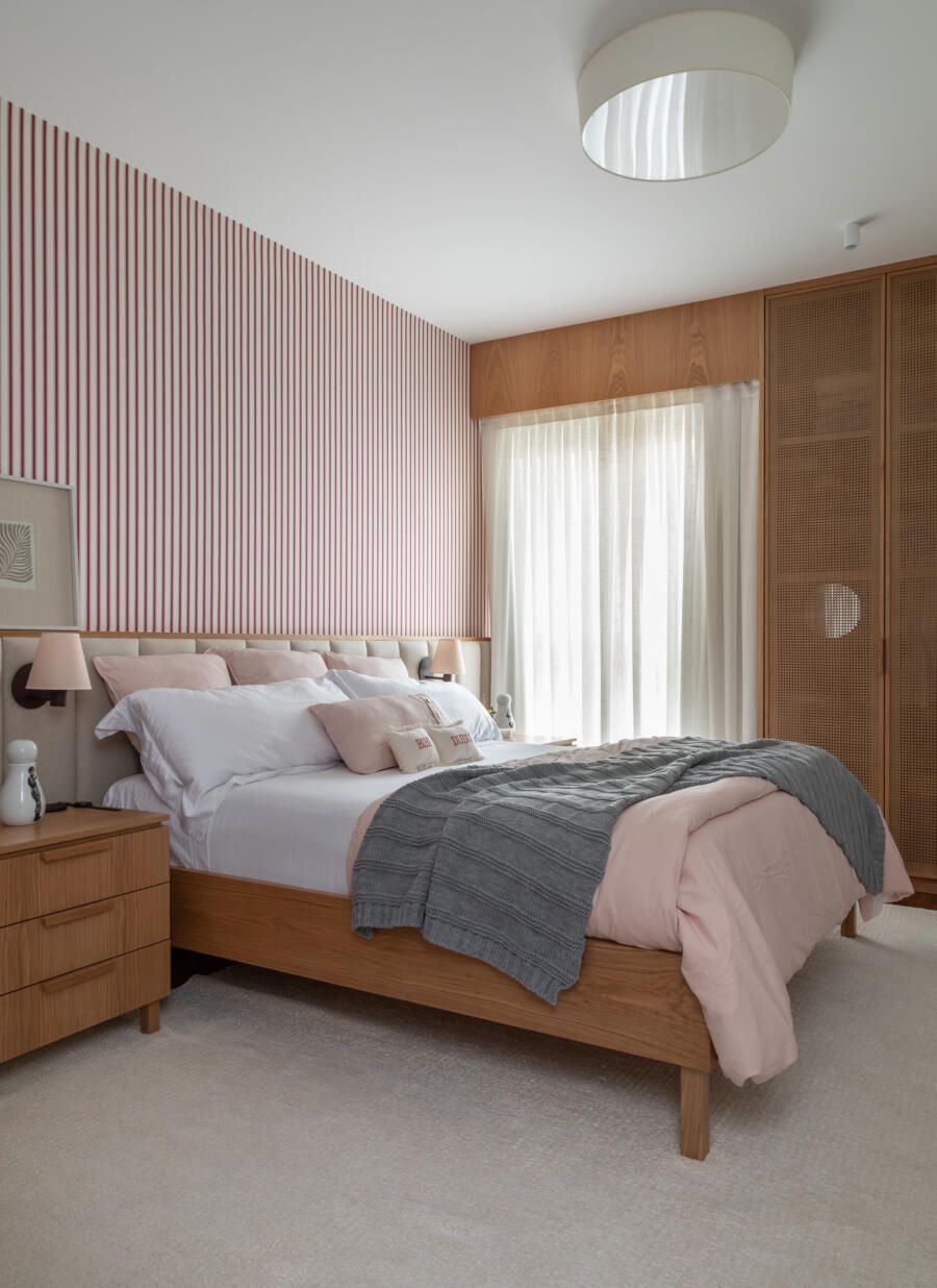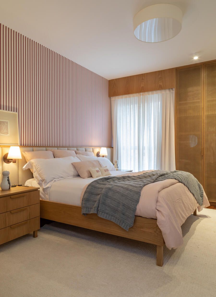 Além disso, a madeira freijó foi pensada para ser utilizada nos móveis da suíte e criar um ambiente aconchegante.