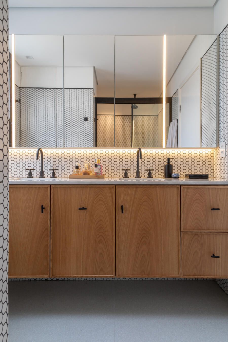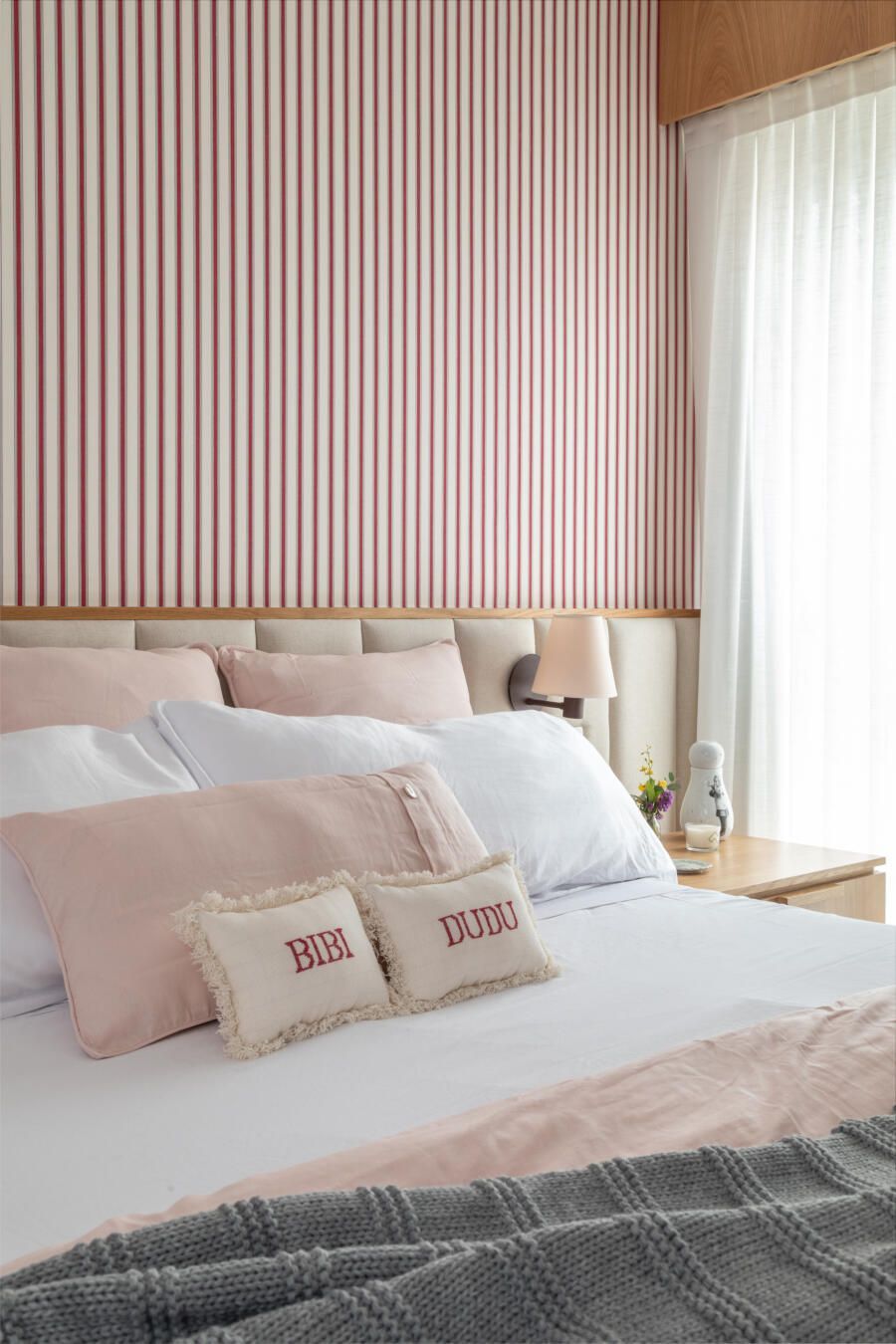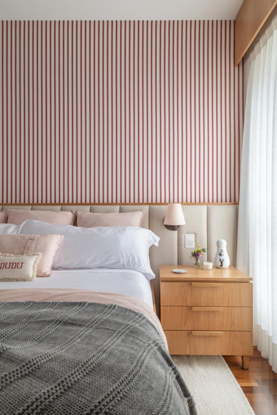 Além disso, a madeira freijó foi pensada para ser utilizada nos móveis da suíte e criar um ambiente aconchegante.