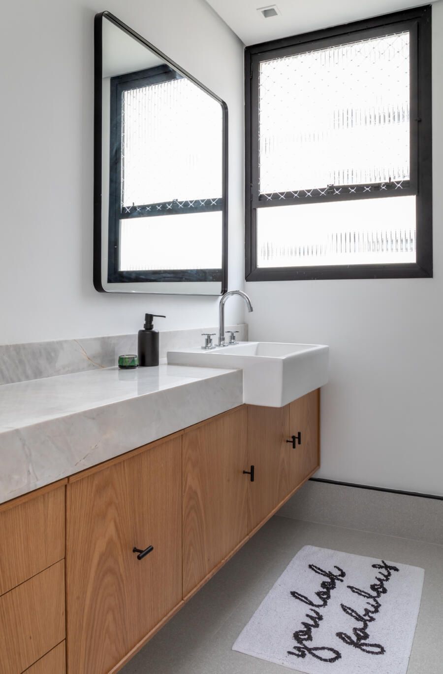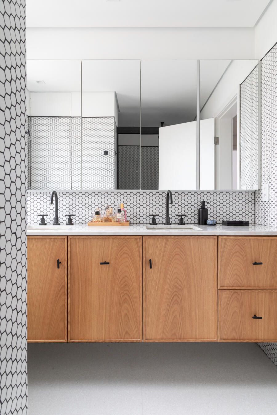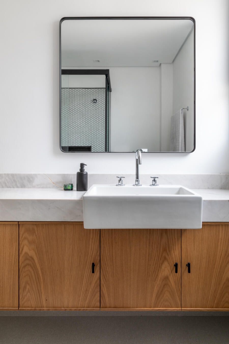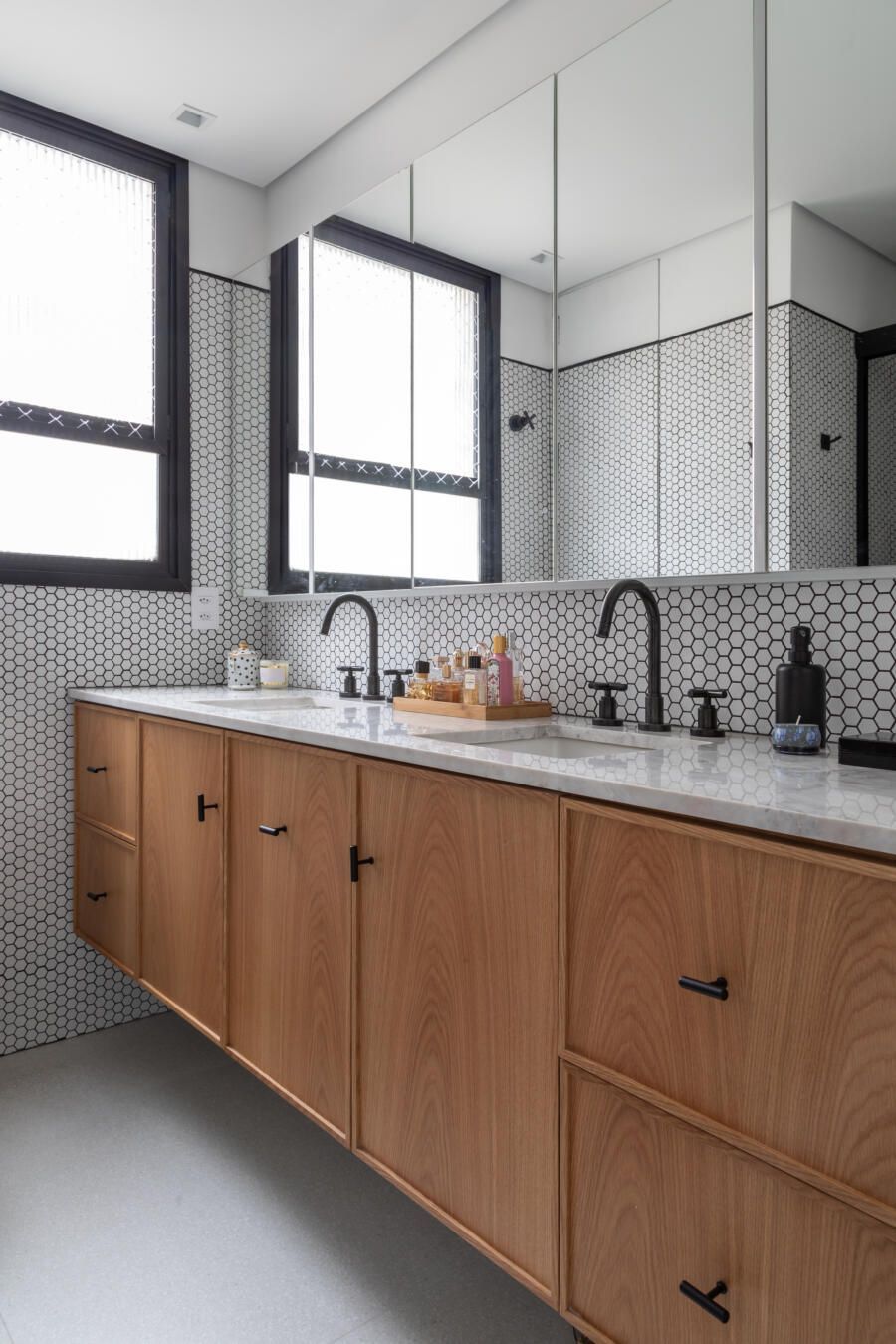 Além disso, a madeira freijó foi pensada para ser utilizada nos móveis da suíte e criar um ambiente aconchegante.