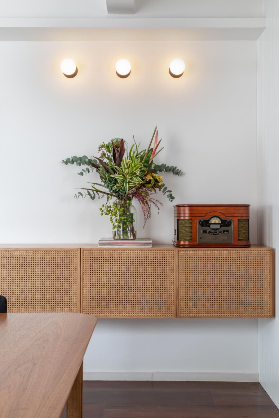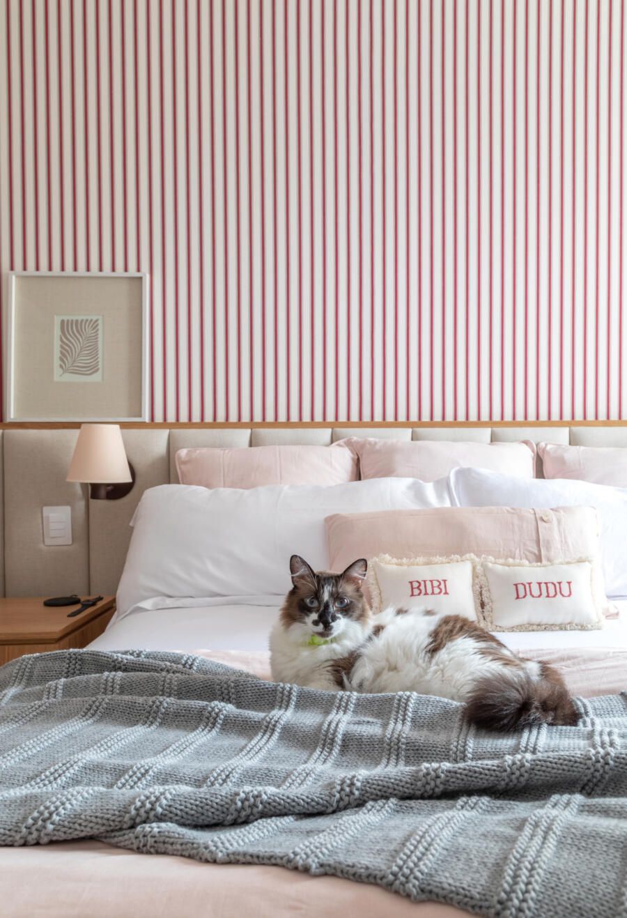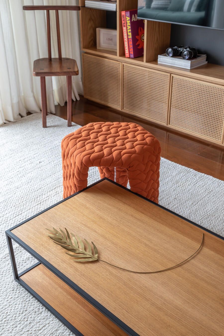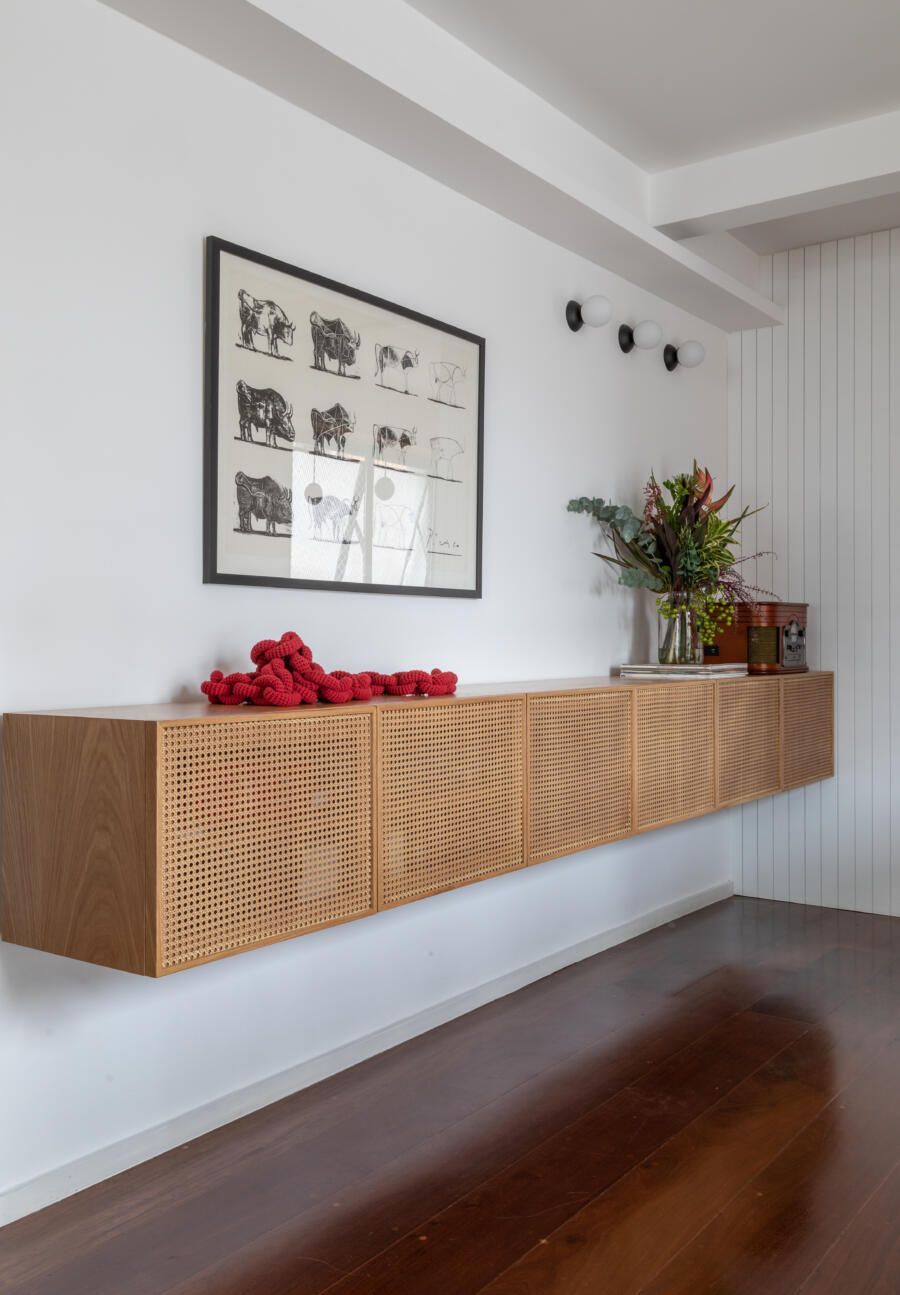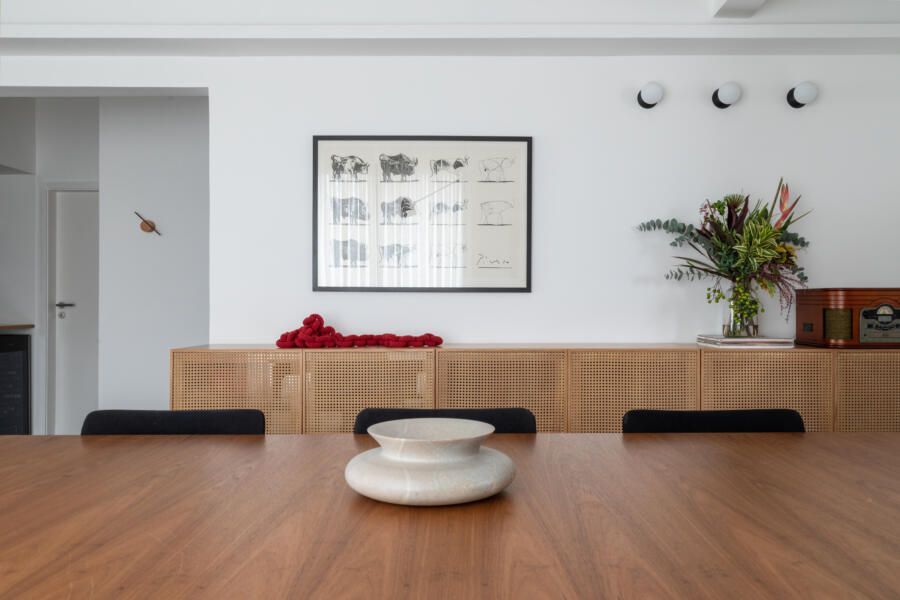 “Na suíte do casal, o destaque vai para o guarda-roupa, que teve seu interior mantido e portas trocadas. As novas portas foram feitas com uma moldura fina de madeira freijó, palhinha e vidro por trás, para bloquear a passagem de poeira. O puxador também foi feito em madeira freijó. Essa combinação ajudou a proporcionar um ambiente aconchegante, como a cliente queria.”